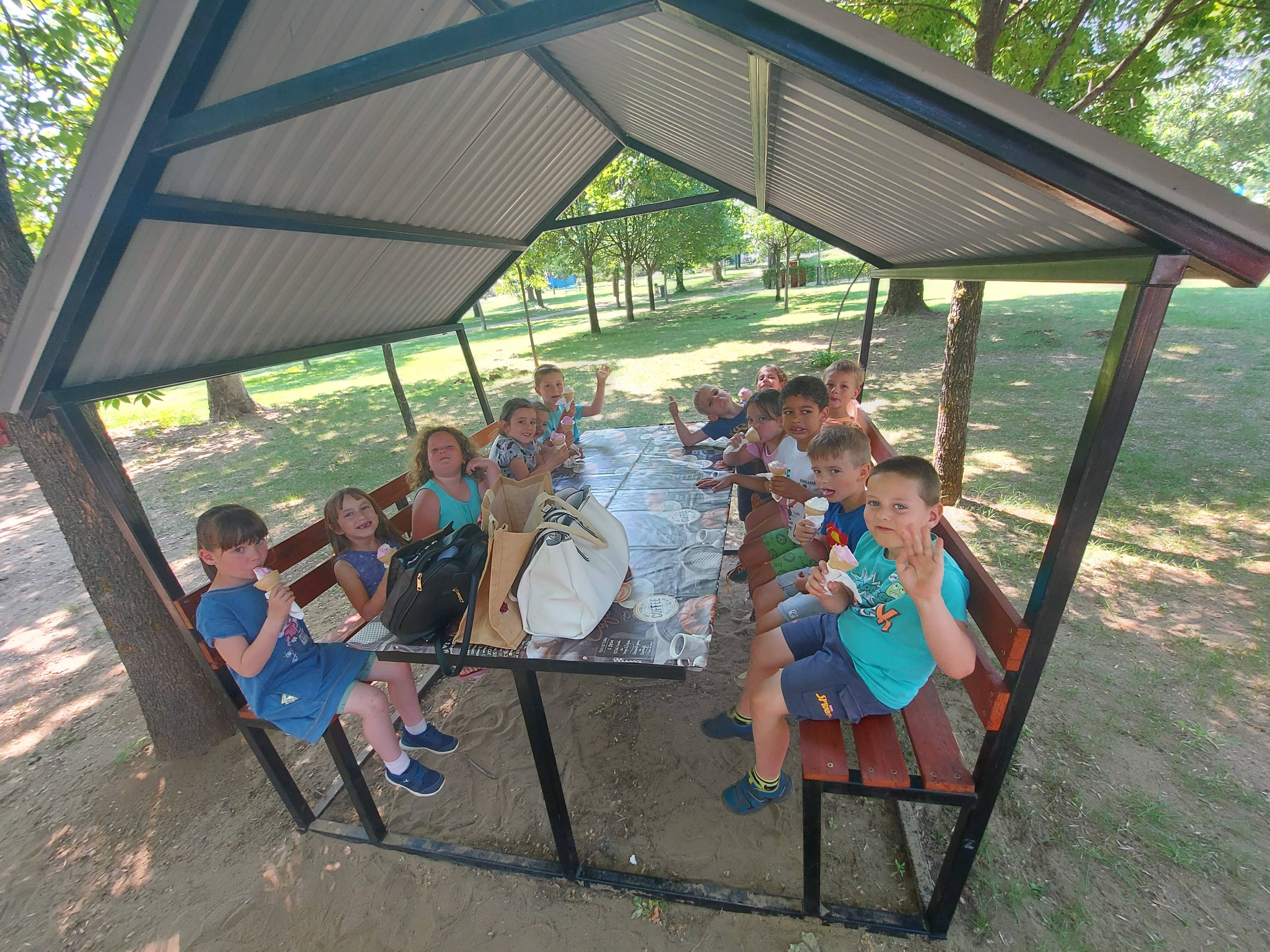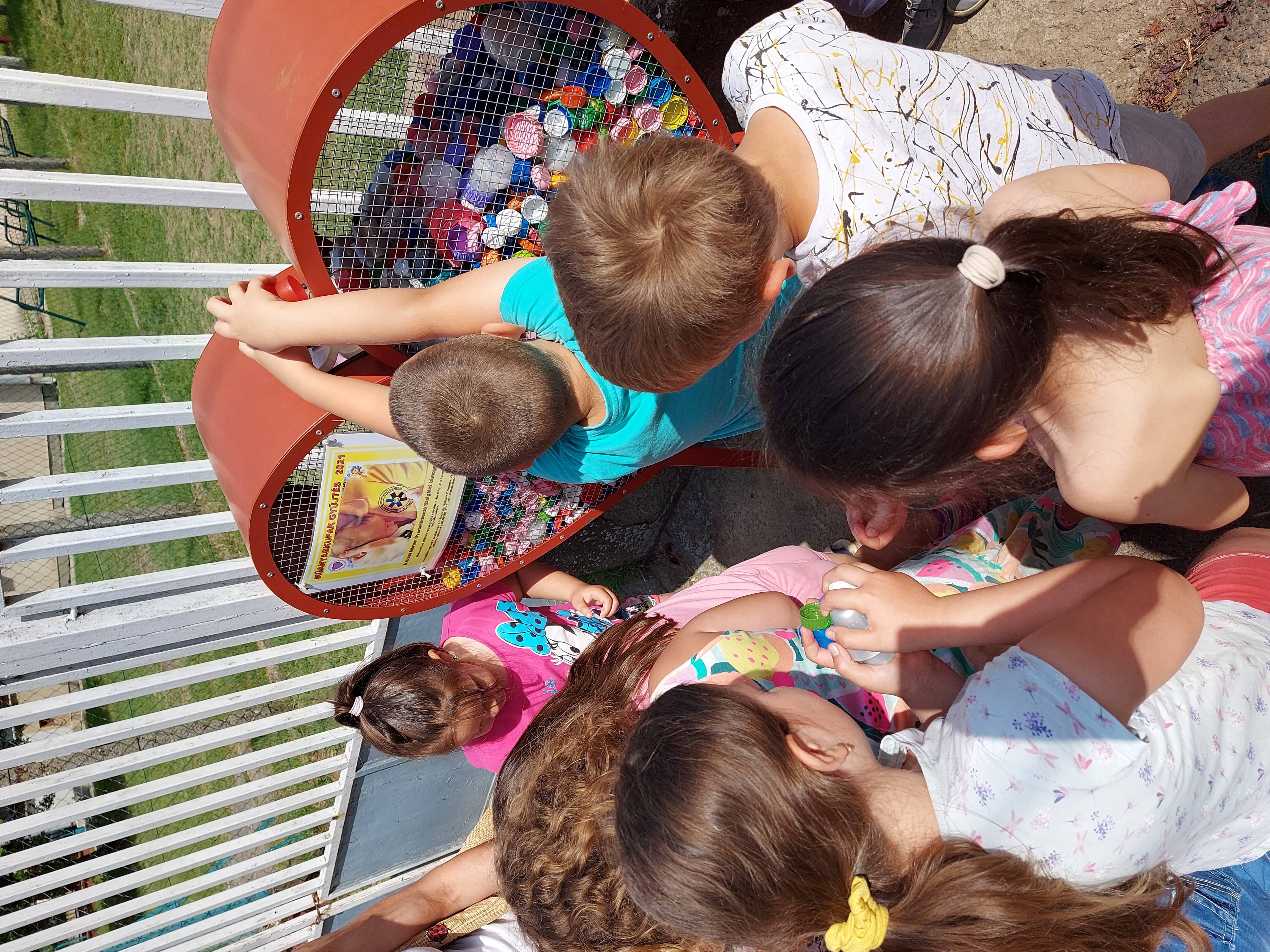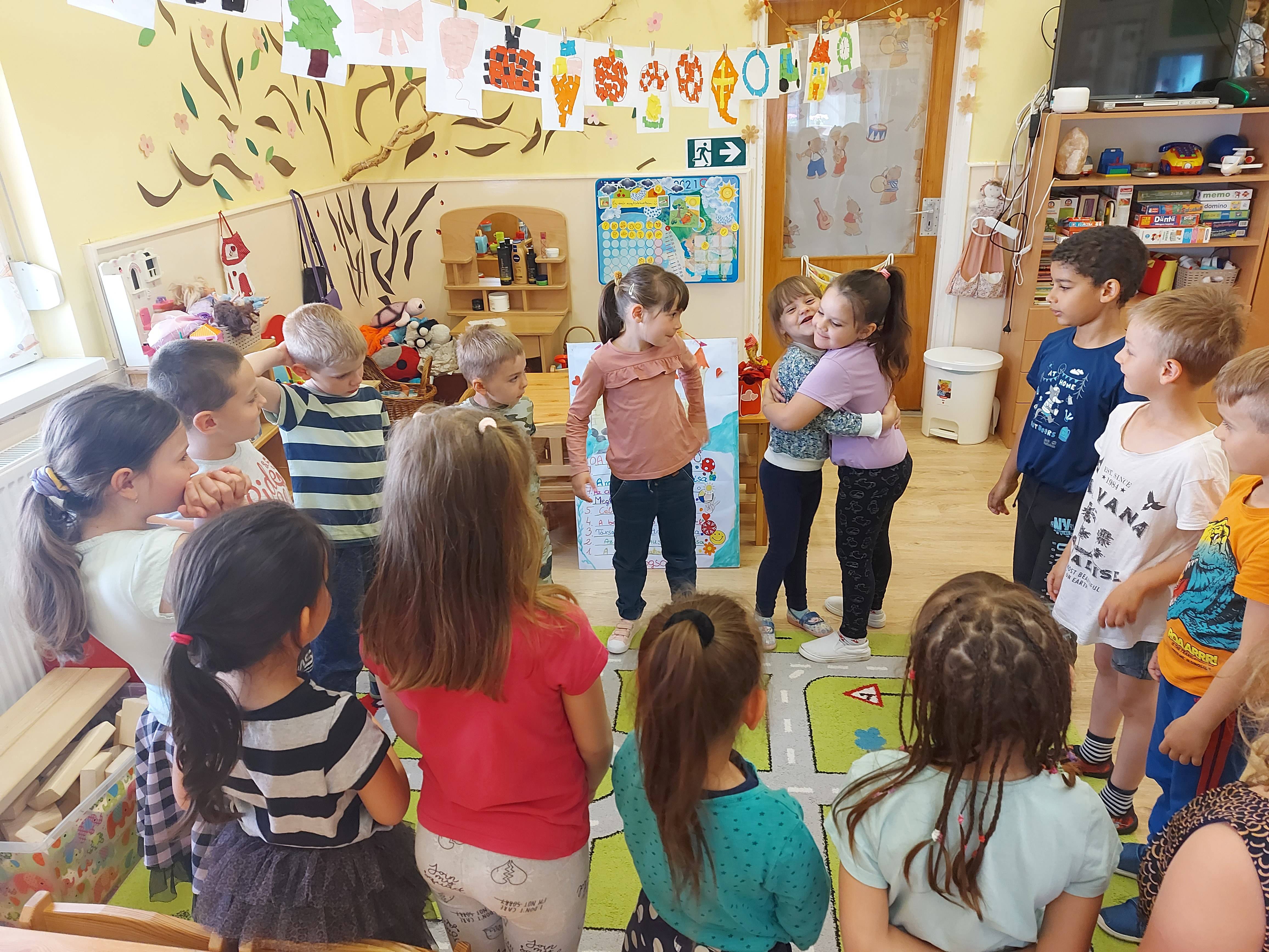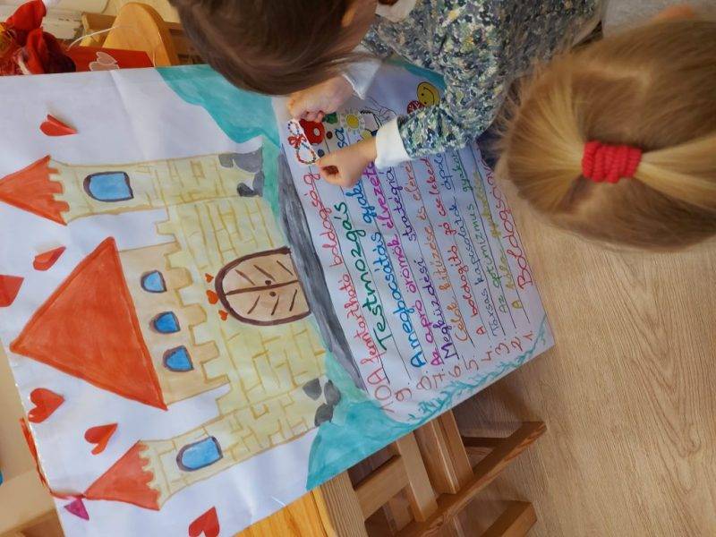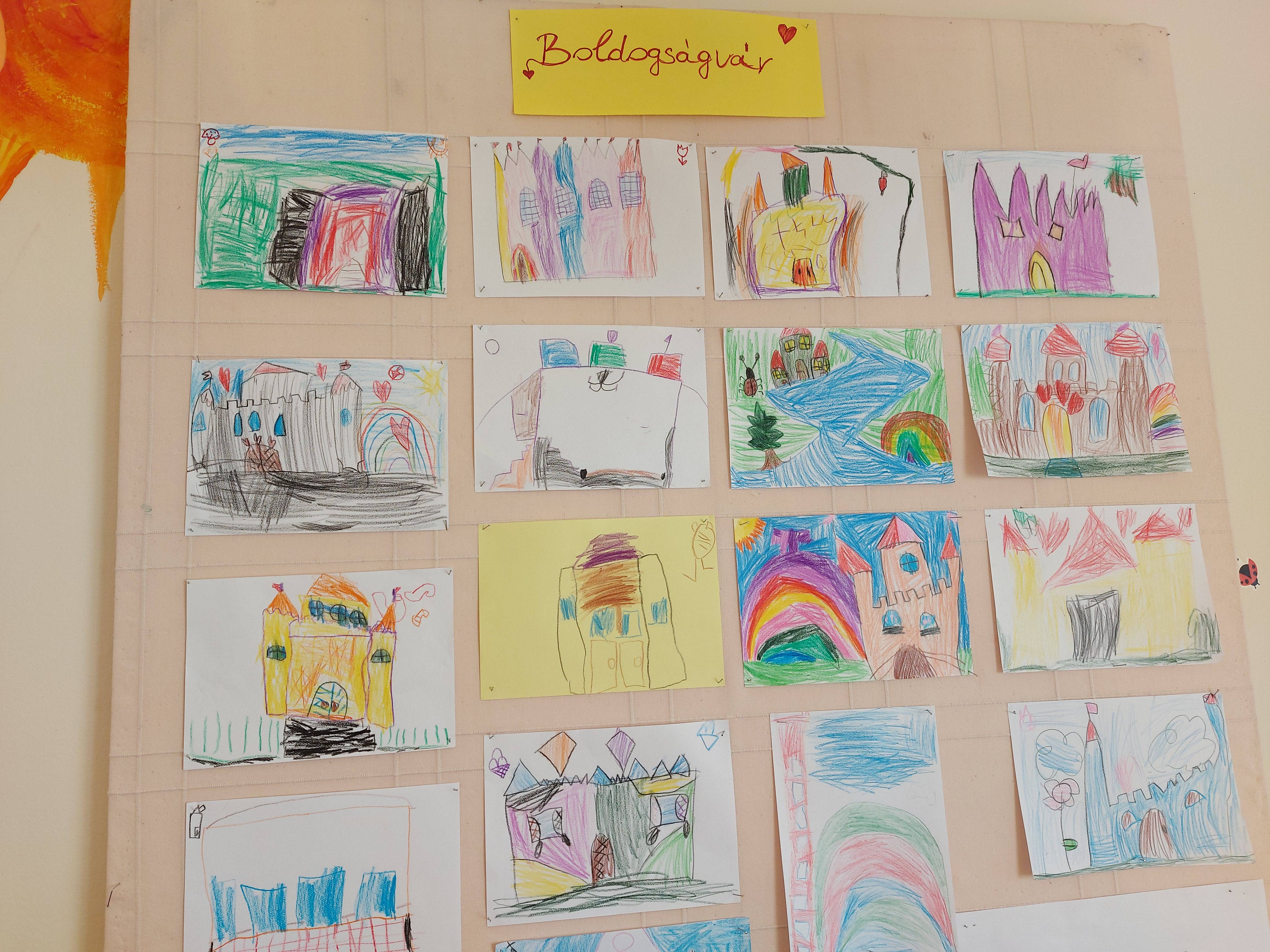 Elérkeztünk a program utolsó hónapjához, amit már nagyon vártak a gyerekek. Mivel nagycsoportos gyerekekről van szó, a hónap aktualitása volt még a ballagás és búcsú az óvodától. Így csupa jeles esemény színesítette ezt a hónapot, így méltóképpen zártuk a boldogságórákat és az óvodás éveket a Katica csoportban. Sokat beszélgettünk a Boldogságvárhoz vezető lépcsőkről. Újra felidéztük mindet, megbeszéltük a jeleket és, hogy melyik lépcsőfokról mit tanultunk meg. Mindegyikhez mondtuk példákat és egész sok mindenre emlékeztek. Ebben nagy segítségünkre volt az utolsó mese is, ami nagyszerűen összefoglalja a boldogságfokozó elemeket. Miközben meséltem a mesét, a lépcsőfokok mellé rajzoltam a színes gyöngyöket, ugyanúgy ahogy megjelentek a mesében – rávezetve ebből őket a boldogságlánc értelmezésére. Ezt követően készítettük el a munkafüzet feladatait: kiszínezték az elemeket, lerajzolták a kedvencüket, elkészült a boldogságkerék és a boldogságfüzér – ez utóbbi gyöngyfűzés formájában is megvalósult. Végül mindenki lerajzolta a saját boldogságvárát, amiből készítettünk egy tablót a ballagási tabló mellé. Ebben a hónapban valóban megjelent minden boldogságfokozó elem, amelyet az út során megismertünk. Mivel közeledett a ballagás, így nézegettünk fotókat, videókat az elmúlt három évről, összeállítottuk mindenki mappáját, amiben az idei munkákat gyűjtöttük, elkészítették mozaikragasztással a saját jeleiket. A gyerekekkel közösen készítettünk köszönőleveleket azoknak a helyi szervezeteknek, akiknek sok támogatást köszönhettünk az óvodás évek során (könyvtáros néni, konyhás nénik, nyugdíjas klubok, védőnő, boltos néni …) és néhány séta alkalmával körbehordtuk a faluban ezeket a leveleket. Jótékonykodtunk is: az év során összegyűjtött műanyagkupakokat elvittük a gyűjtőhelyre, melyet jótékony célra fognak felhasználni. Voltunk játszótéren és fagyizni, élveztük az apró örömöket. Az egész tevékenységet az öleléslánccal zártuk.