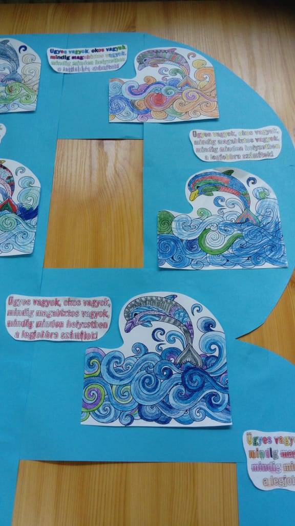 Az óra bevezető részében elkészített színezőket körbevágtuk, majd készítettünk egy hatalmas B betűt, ami a boldogságot jelképezte, erre ragasztottuk a színezőket és a pozitív versikét.