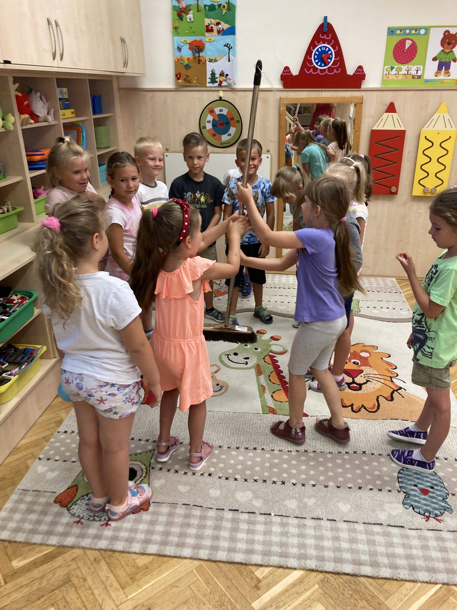 Relaxációs gyakorlatként napimádást végeztünk, majd elmondtuk a Nap, Nap, fényes Nap című mondókát. Többször hallgattuk Bagdi B.: Jobb veled a világ kezdetű dalt, amelyre igény szerint táncoltak a gyerekek. Megismerték a Boldog erdő – kerek erdő c. mesét. Közösség összekovácsoló volt a „seprűtánc” játék. Örültek annak a gyerekek, hogy nem estek ki a játék során, hanem bent maradhattak és újra játszhattak tovább.