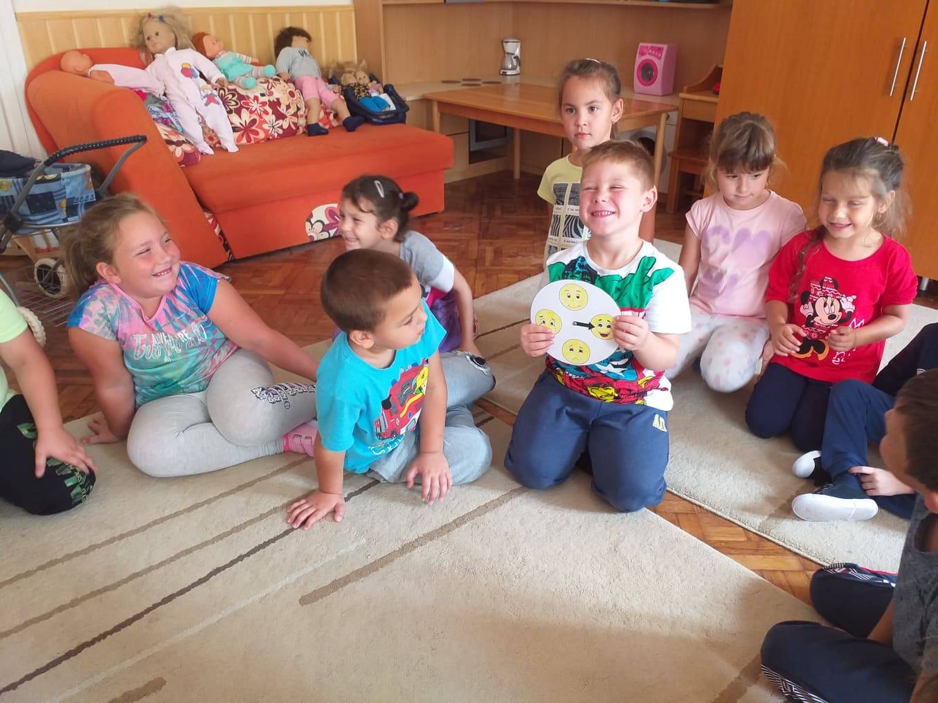 1. Ajánlás: Beszélgetés kezdeményezése az érzelmekről. Milyen érzelmeket ismerünk? Mik a pozitív és negatív érzelmek?Hogyan jelennek meg az érzelmek az arcunkon? Az érzelemórát körbe adtam a gyermekeknek, és ahová mutatott a nyil azt az érzelmet lehetett utánozni. A gyermekek kiválóan tudják arcukon megjeleniteni az örömöt és a szomorúságot is.