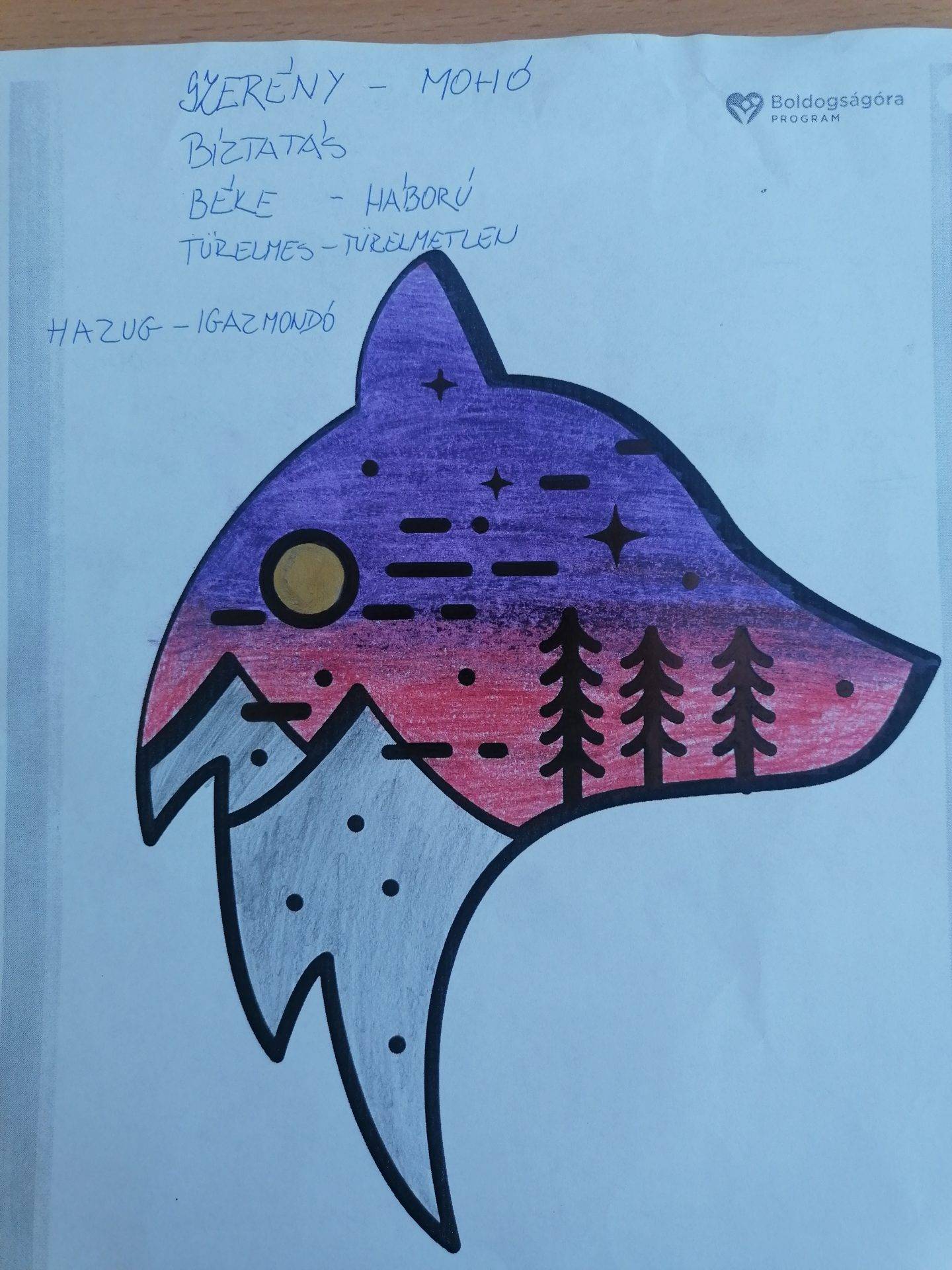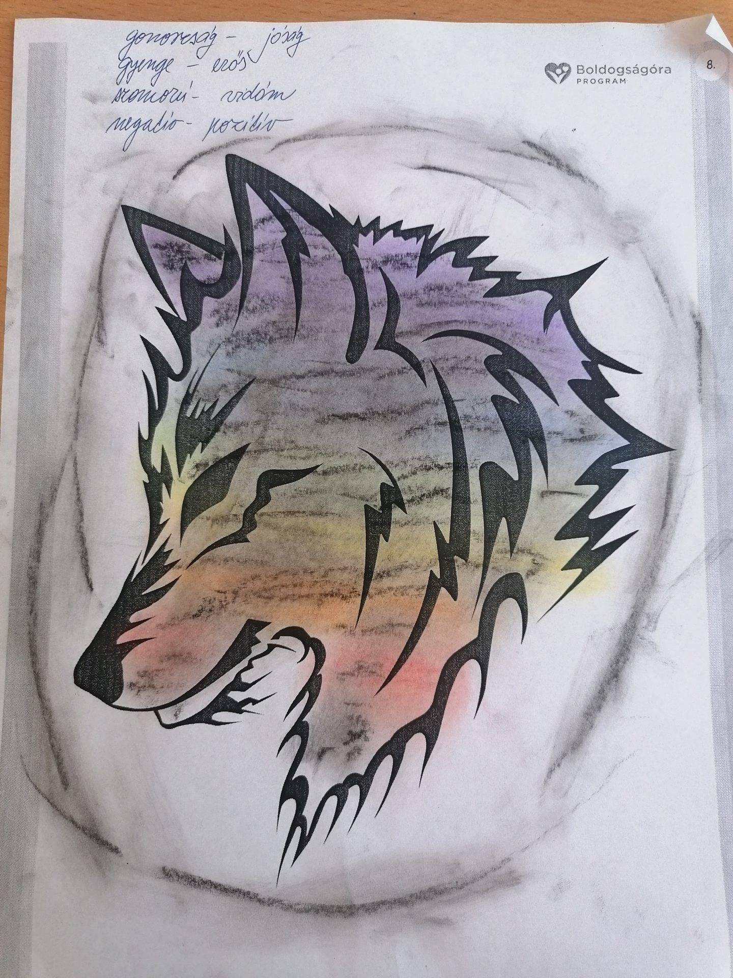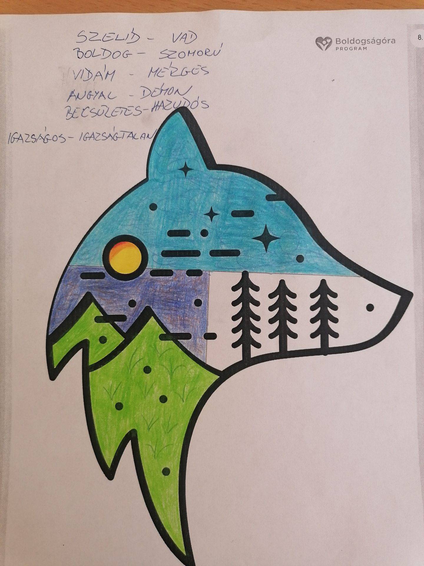 Az órán beszélgettünk a tanulókkal arról, hogy mi az ami boldoggá teszi őket, mi az aminek örülni tudnak. Beszélgettünk a pozitív érzésekről.Nagyon értelmes válaszokat kaptam. Majd elolvastuk A Fehér és a Fekete Farkas című tanmesét és értelmeztük. Nagy örömmel válogattak a színezhető mellékletek közül. Csoportokban dolgozva pedig nem átnevezték, de pozitív és negatív tulajdonságokat soroltak fel.