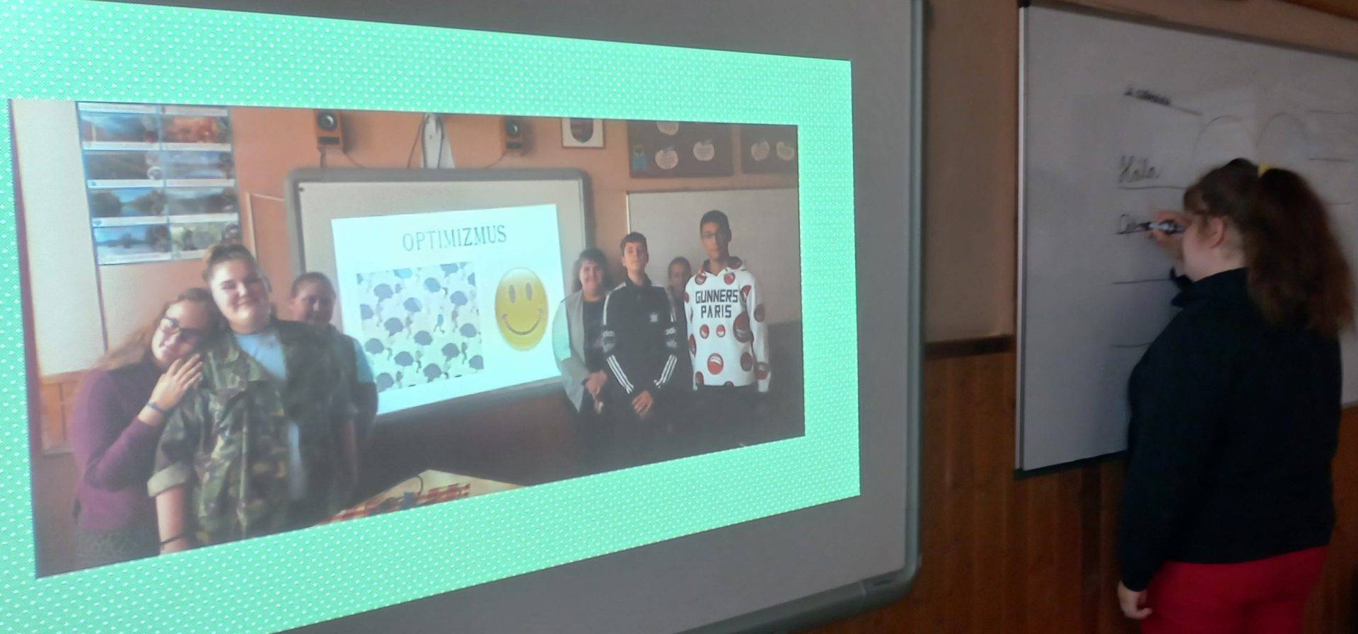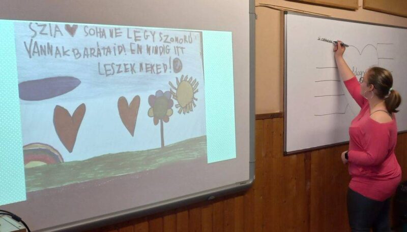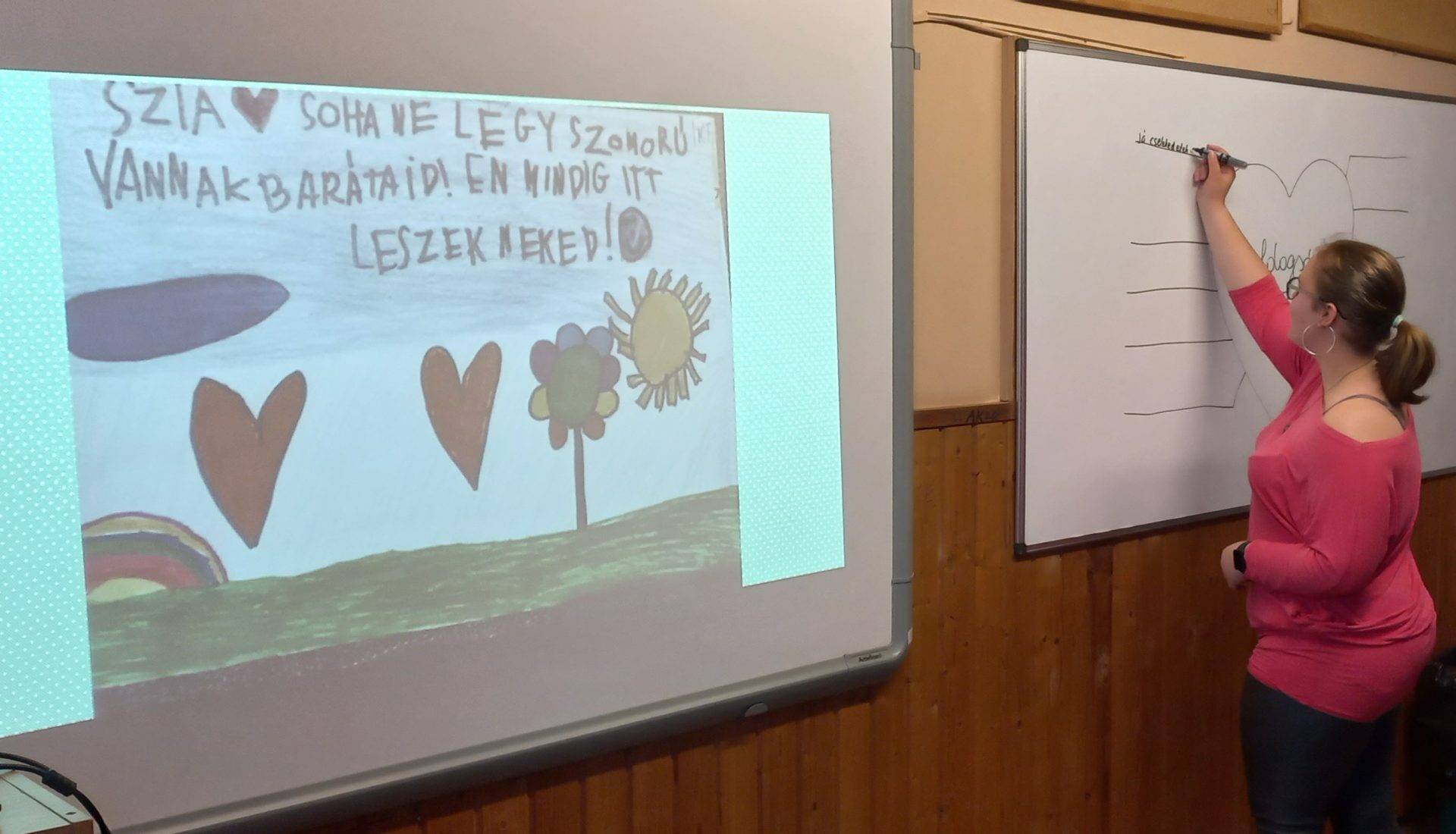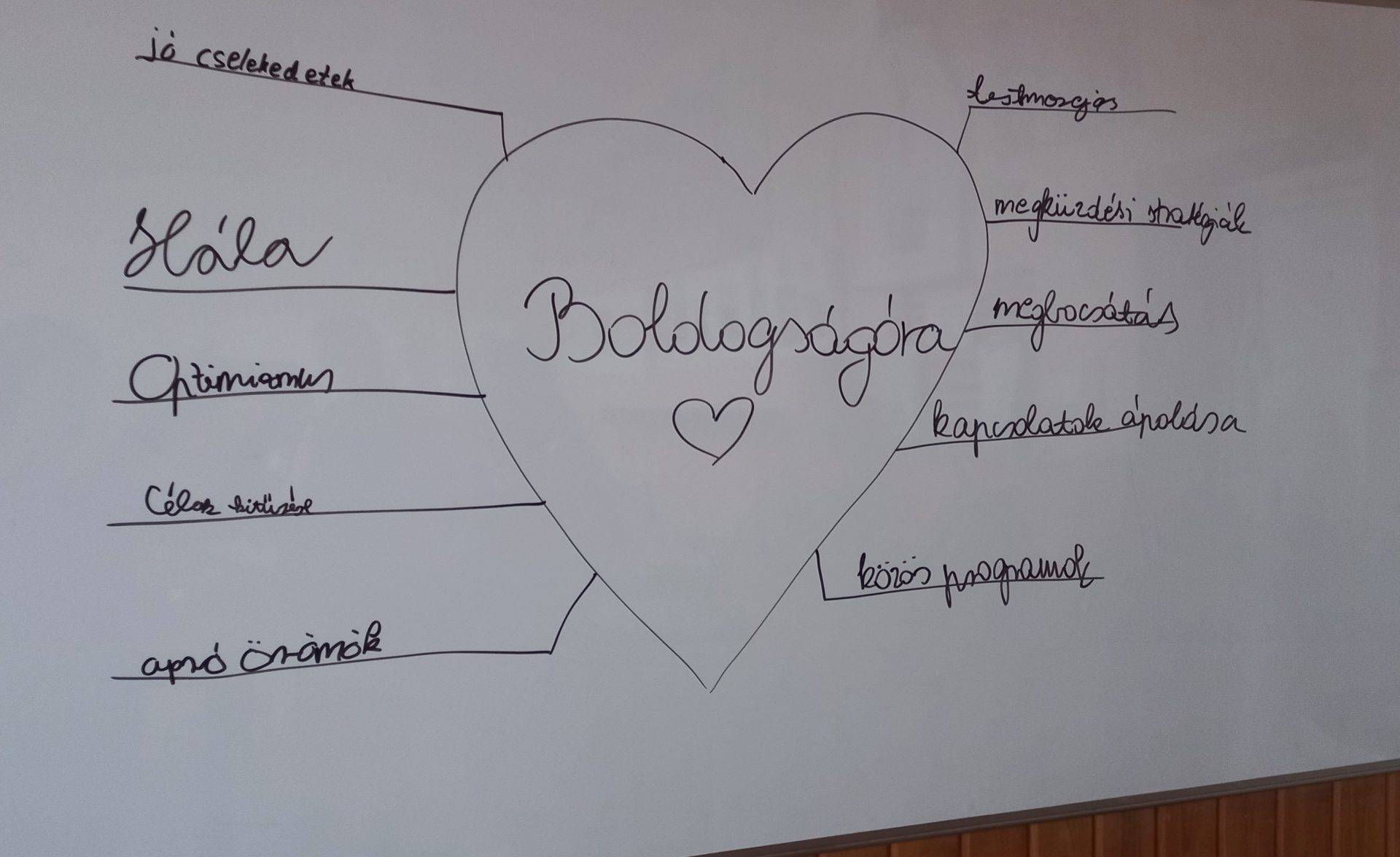 Az óra folytatásaként néhány, az osztályról készült képeken idéztünk fel egy-egy témában közös emlékeket. A képek segítségével a boldogságórák témaköreivel kapcsolatban beszélgettünk, majd a táblára rajzolt szív köré gyűjtöttük a fogalmakat.