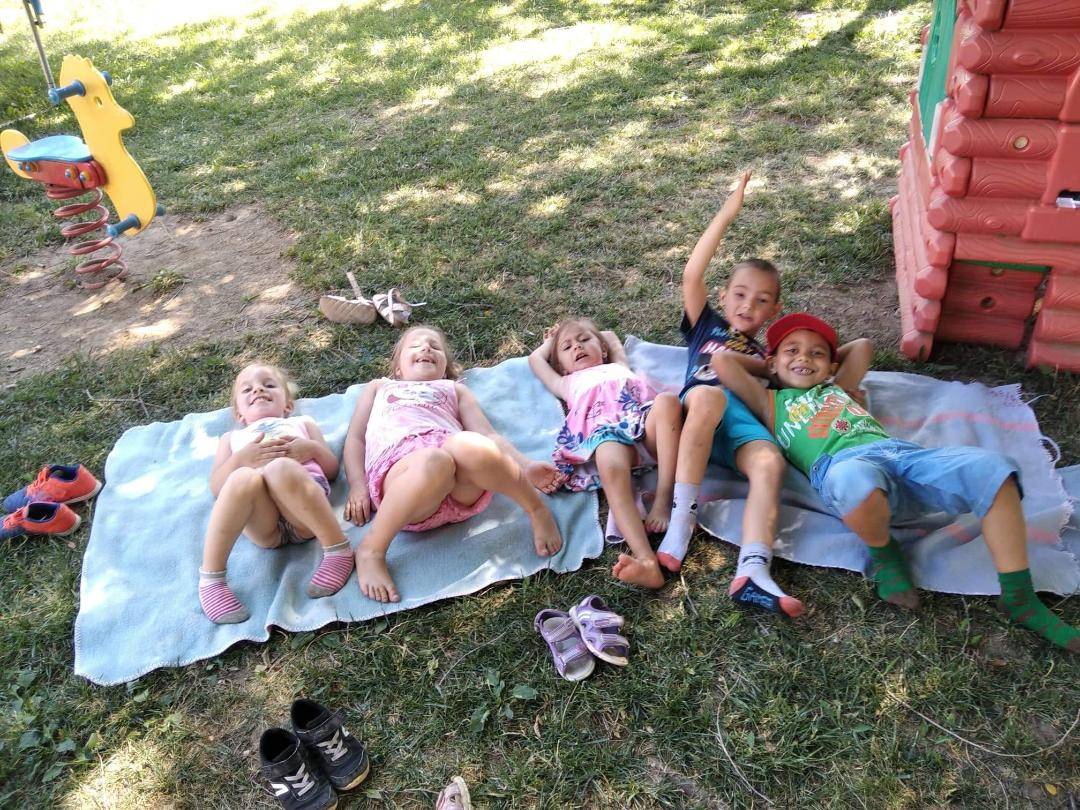 A fák árnyékába kis lepedőket tettünk, amire a gyermekek lepihenve, egyre boldogabb hangulatban hallgatták a Boldogságórai dalokat.
