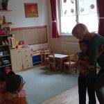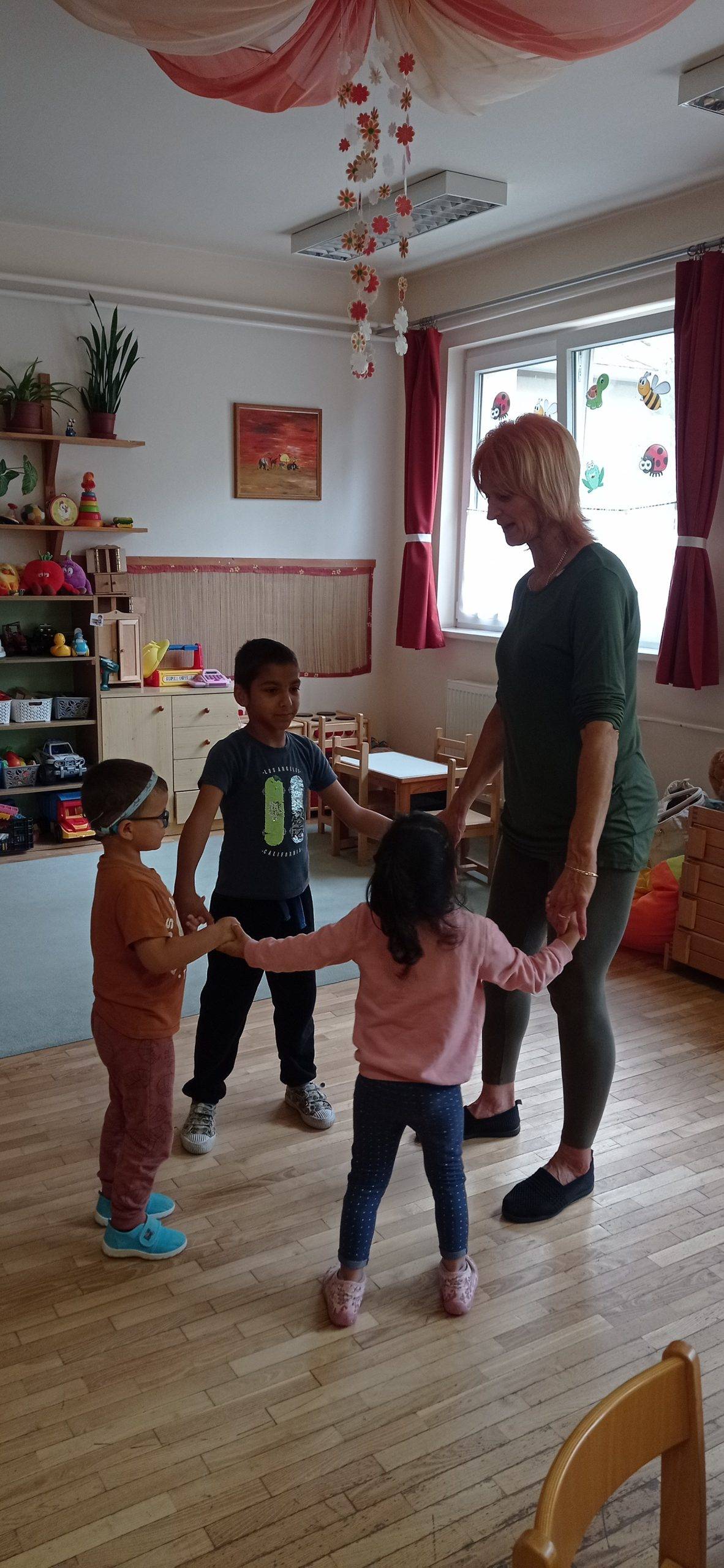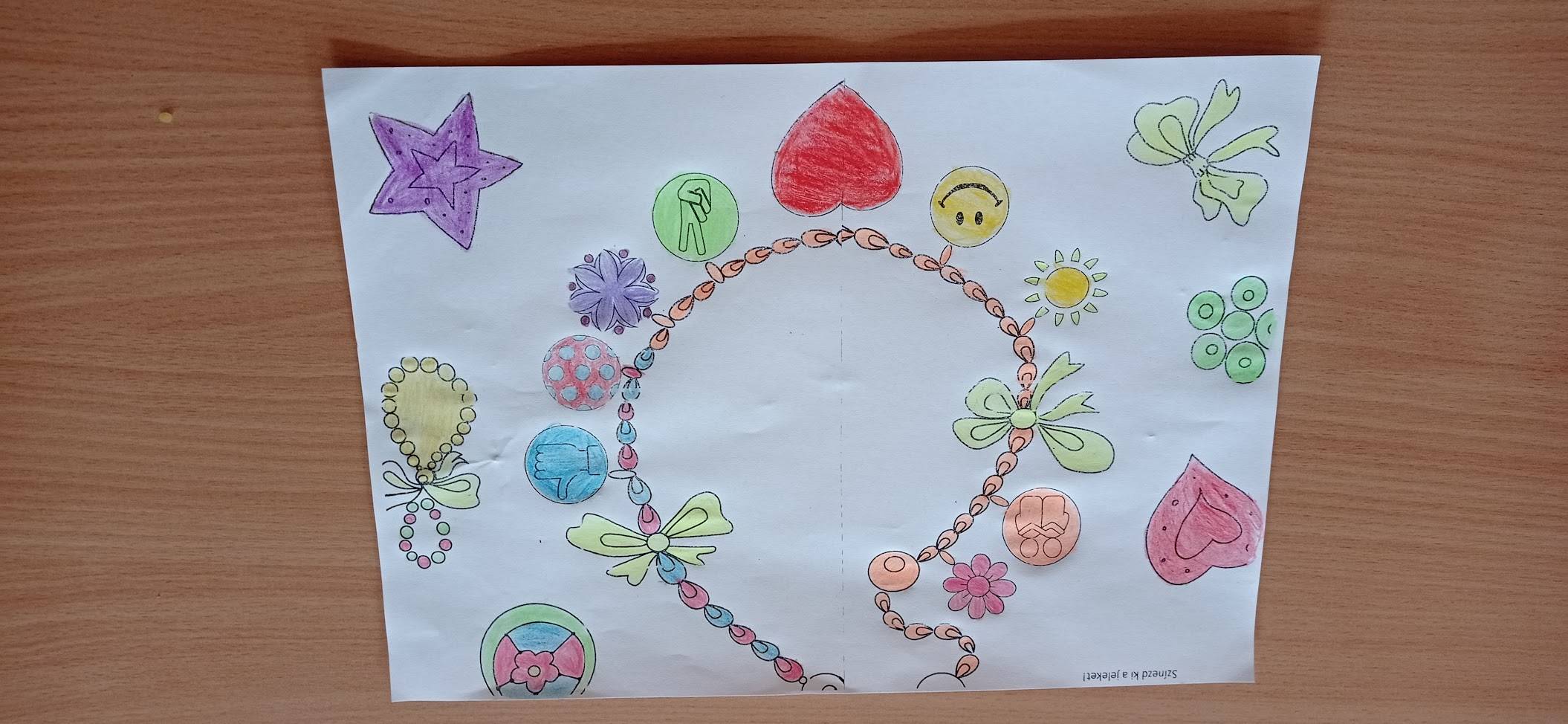 Fontosnak tartottam egész évben, hogy a gyermekek minél több pozitív élményben részesüljenek, szeressék egymást, önmagukat. Legyenek segítőkészek, elfogadók társaikkal szemben, vegyék észre, ha valakinek segítségre van szüksége. Jellemezze őket az öröm, a kíváncsiság, az energia, az élénkség. Legyenek boldogok. A téma feldolgozását az „Irkafirka”, és a „Fújj, fújj” relaxációs gyakorlattal kezdtük, majd meghallgattuk Bagdi Bella: Jobb veled a világ című dalát. A gyermekek lelkesen, boldogan táncoltak a zenére. Ezután „szeretetfolyosót” játszottunk. A folyosón végig haladó gyermekről jó tulajdonságokat mondtunk. A játékban mindenki sorra került. A mesét a „Kerekerdő…” kezdetű mondókával kezdeményeztem, melyet a gyermekek képességeire való tekintettel leegyszerűsítettem. A mese hangulata megalapozta, hogy a boldogságfokozó technikák jeleit, örömmel színezzék ki a gyermekek. Elkészítettük a boldogságfüzért. A foglalkozás zárásaként ölelésláncot játszottunk, körben állva a gyermekek a tőlük balra helyezkedő társukat megölelték.