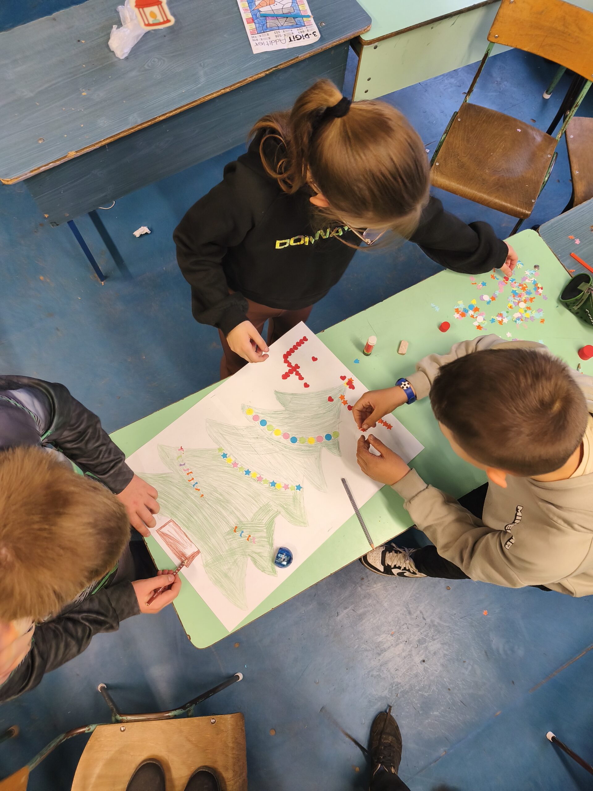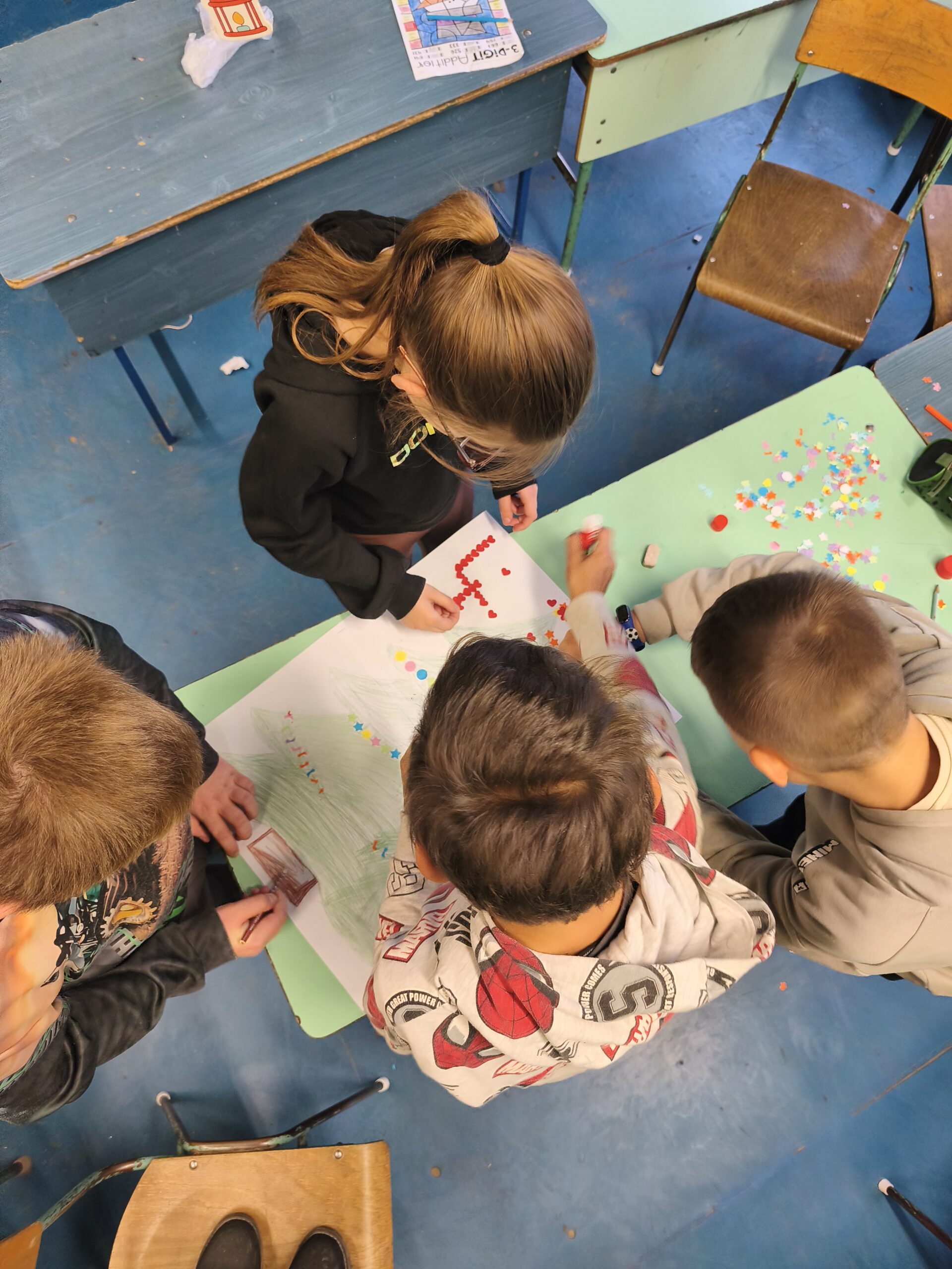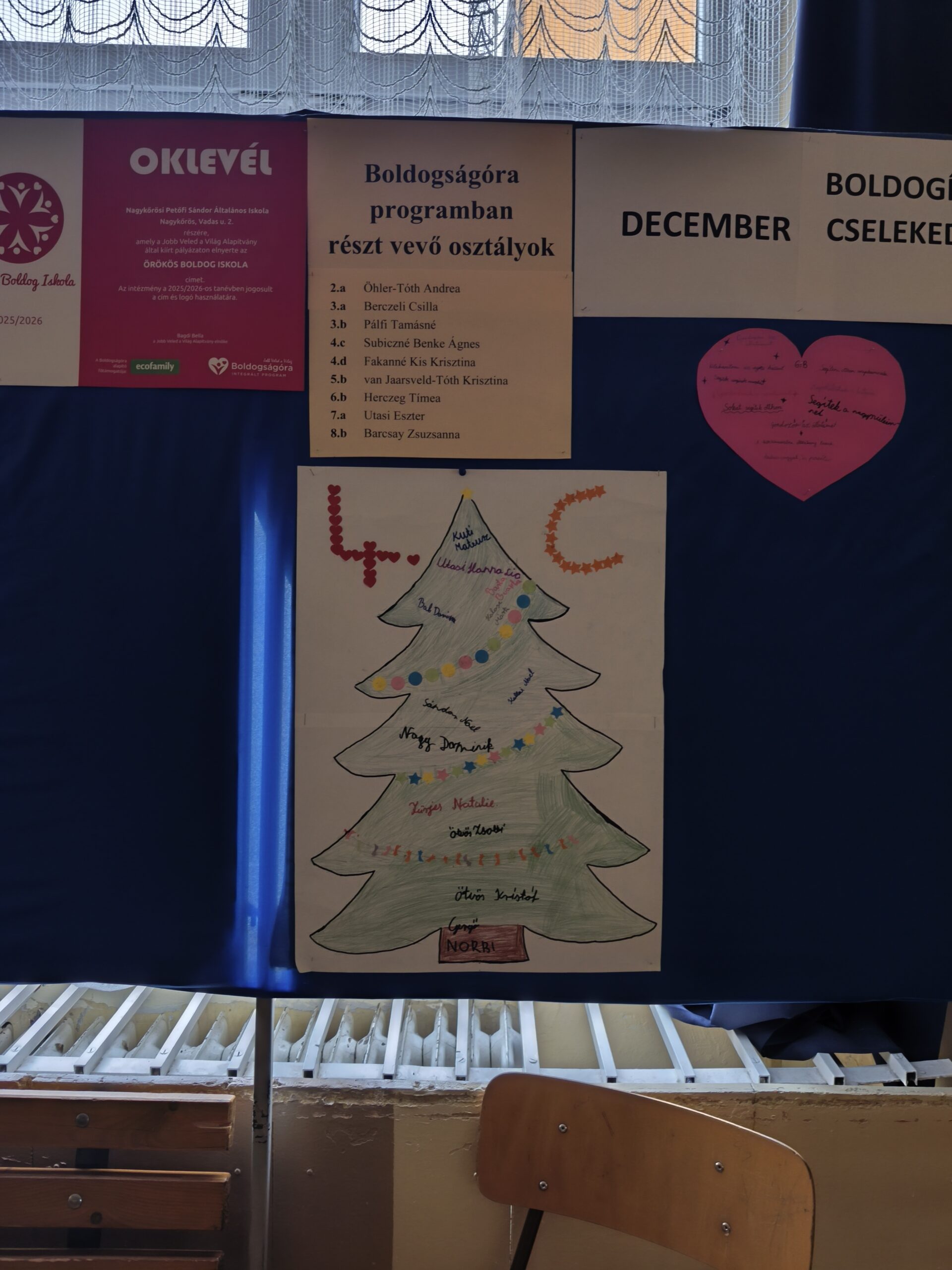 A Boldogságórán a gyerekekkel egy nagy fenyőfát rajzoltunk, amelyre mindenki mini kivágott díszeket tett. Nem írtunk rá utasítást, csak a gyerekek saját nevüket helyezték el a fákon – számukra ez már önmagában egy boldogító jó cselekedet volt, hiszen egymás mellé írták a nevüket, és ezzel kifejezték a közösséghez tartozást és a figyelmességet. A feladat játékos módon mutatta meg, hogy a kis figyelmességek is örömet és összetartozást hoznak a közösségbe.