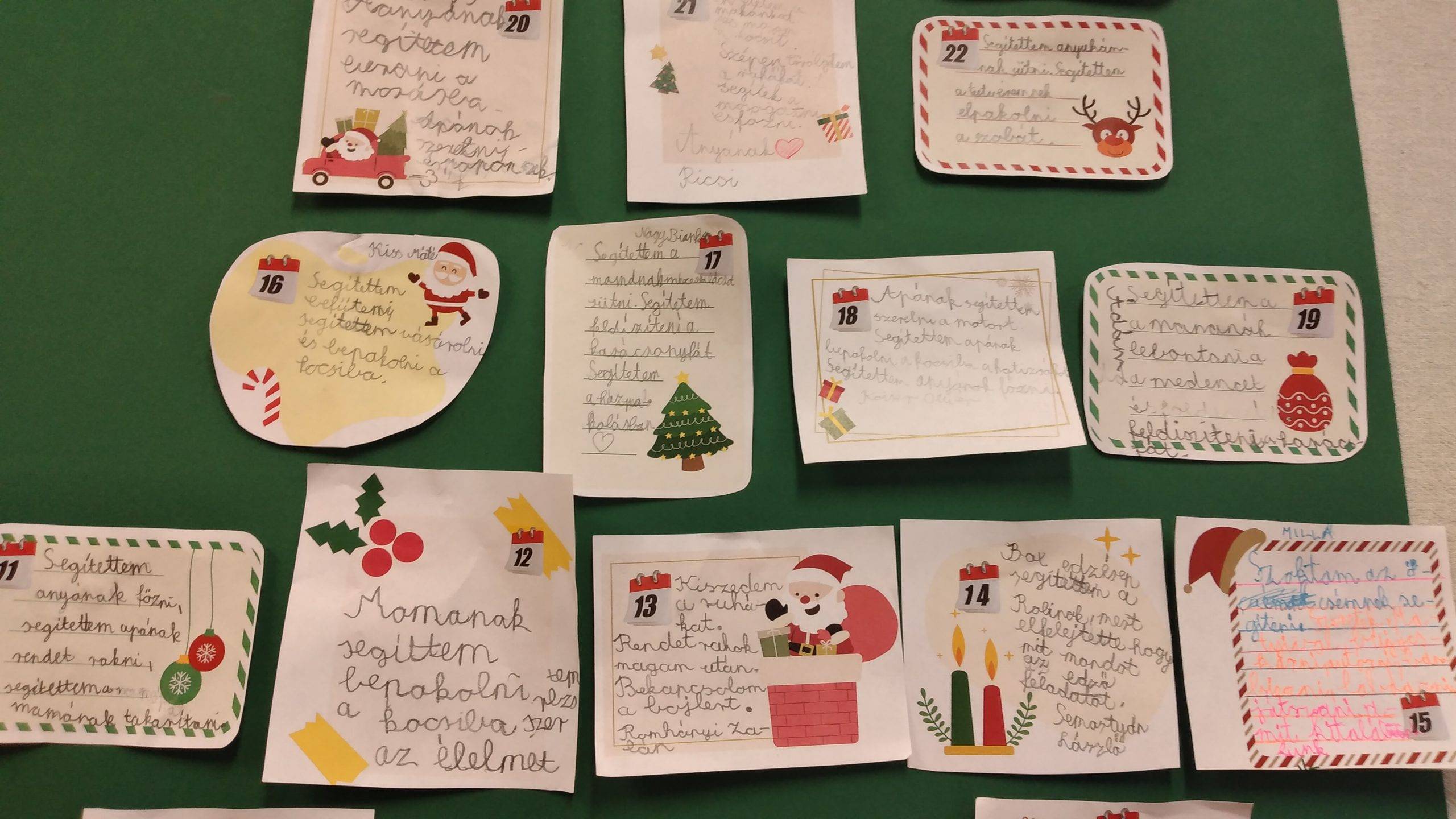 Dec. 12-én elkészítettük a Jótett naplót, kivágtuk, felragasztottuk egy zöld kartonra karácsonyfa alakban. 24 ablakból áll, mi pont 24-en vagyunk. Minden tanulónak lehetősége volt egy ablakot kitölteni. Az adventi időszakban mely három jó cselekedetre volt büszke, azt kellett megfogalmazni a tanulóknak. Lenyűgöző változásokat eredményezhet, ha önként segítenek. Először csak kicsi, egyszerűbb tettekkel kell kezdeni. Mivel az osztály többsége nagyon segítőkész, ez nem volt nehéz.