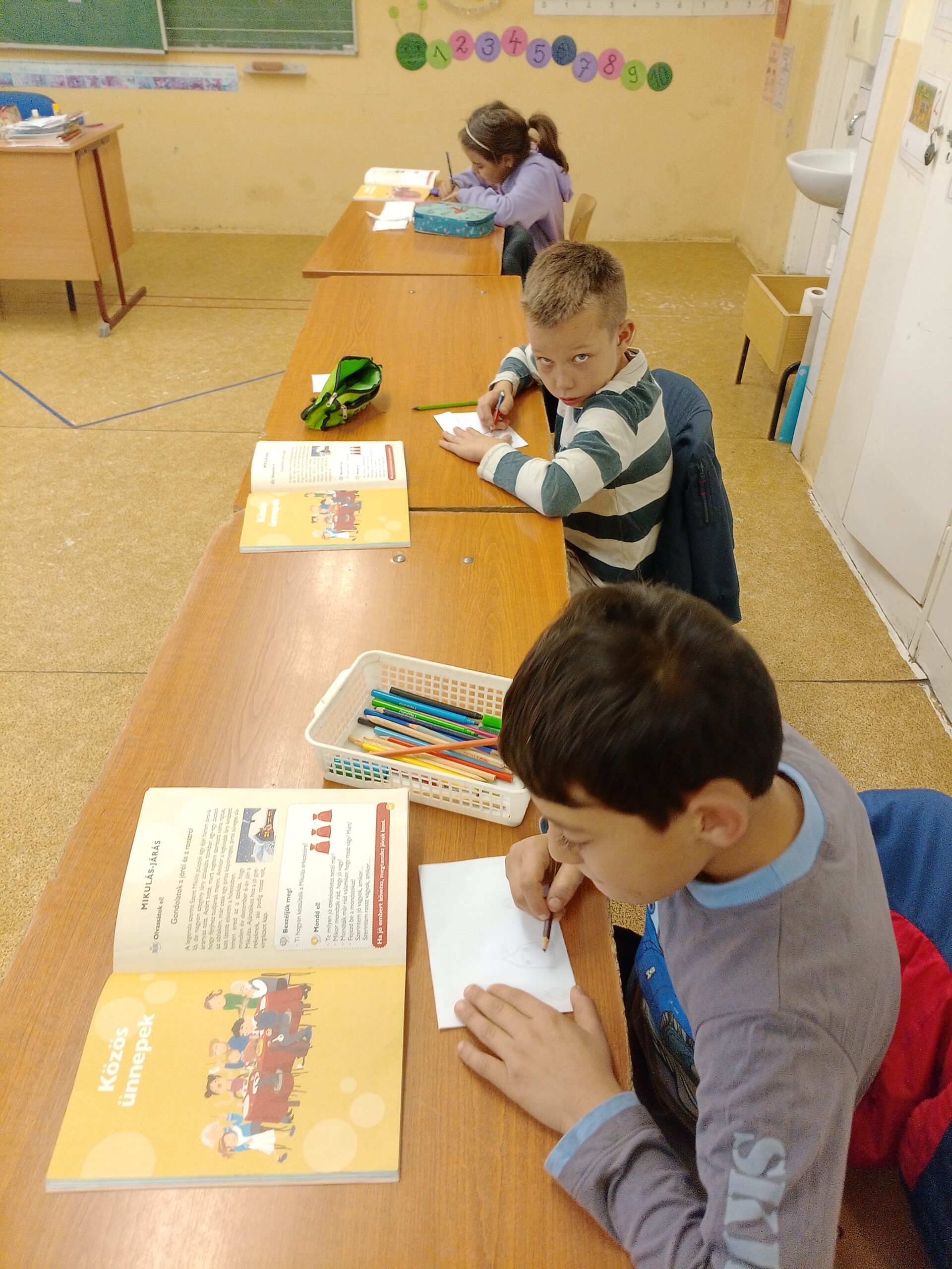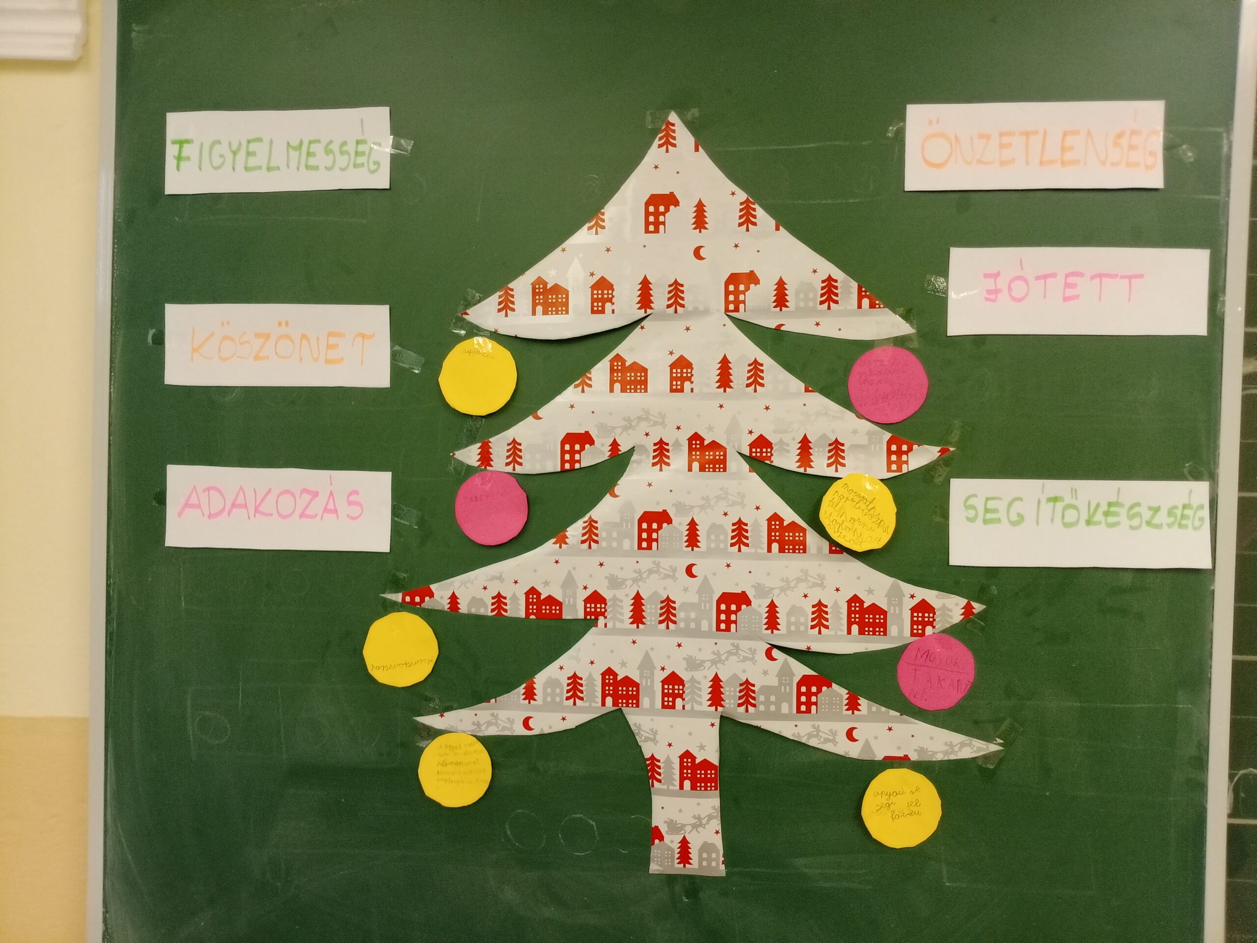 A második évfolyammal etika órán a Boldogító jó cselekedetek témát dolgoztuk fel.Kapcsoltuk az etika óra Mikulás -járás és a Karácsony ünnepe című tananyagához.Szent Miklós püspök jótetteit meghallgatták a gyerekek.Ezután megbeszéltük,hogy ők milyen jótetteket hajtottak végre az utóbbi időszakban. A karácsonyi népszokásokat megismerve elmesélték a gyerekek,hogy ők hogyan ünneplik a családdal a karácsonyt.Ezt követően feldíszítettük a karácsonyfát a tanulók jótetteivel.Ajándékba díszborítékot készítettek egymásnak, amelyben a diáktárs pozitív tulajdonságát írták le.Közben halkan karácsonyi dalokat hallgattunk.