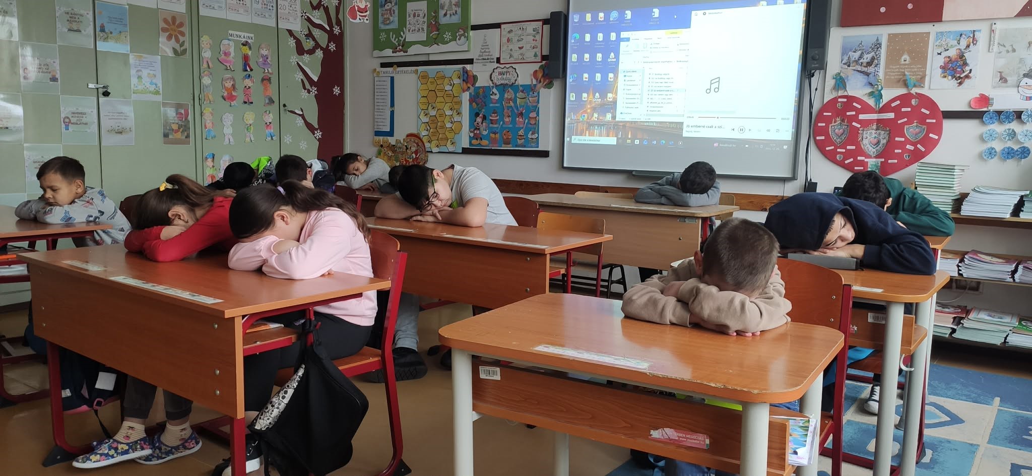 Az év utolsó boldogságóráját az irka-firka relaxációs gyakorlattal kezdtük, majd meghallgattuk Bagdi Bella: Jó emberré csak a szívemmel válhatok című dalát. A dal csukott szemmel hallgattuk végig és mindenki elmondta, hogy mi jutott az eszébe a dalról, különböző érzéseket fogalmaztunk meg közösen.