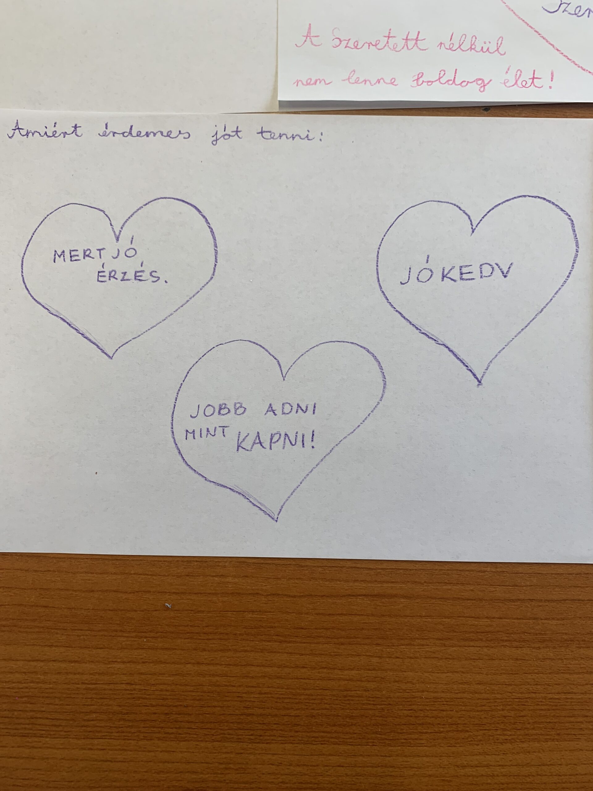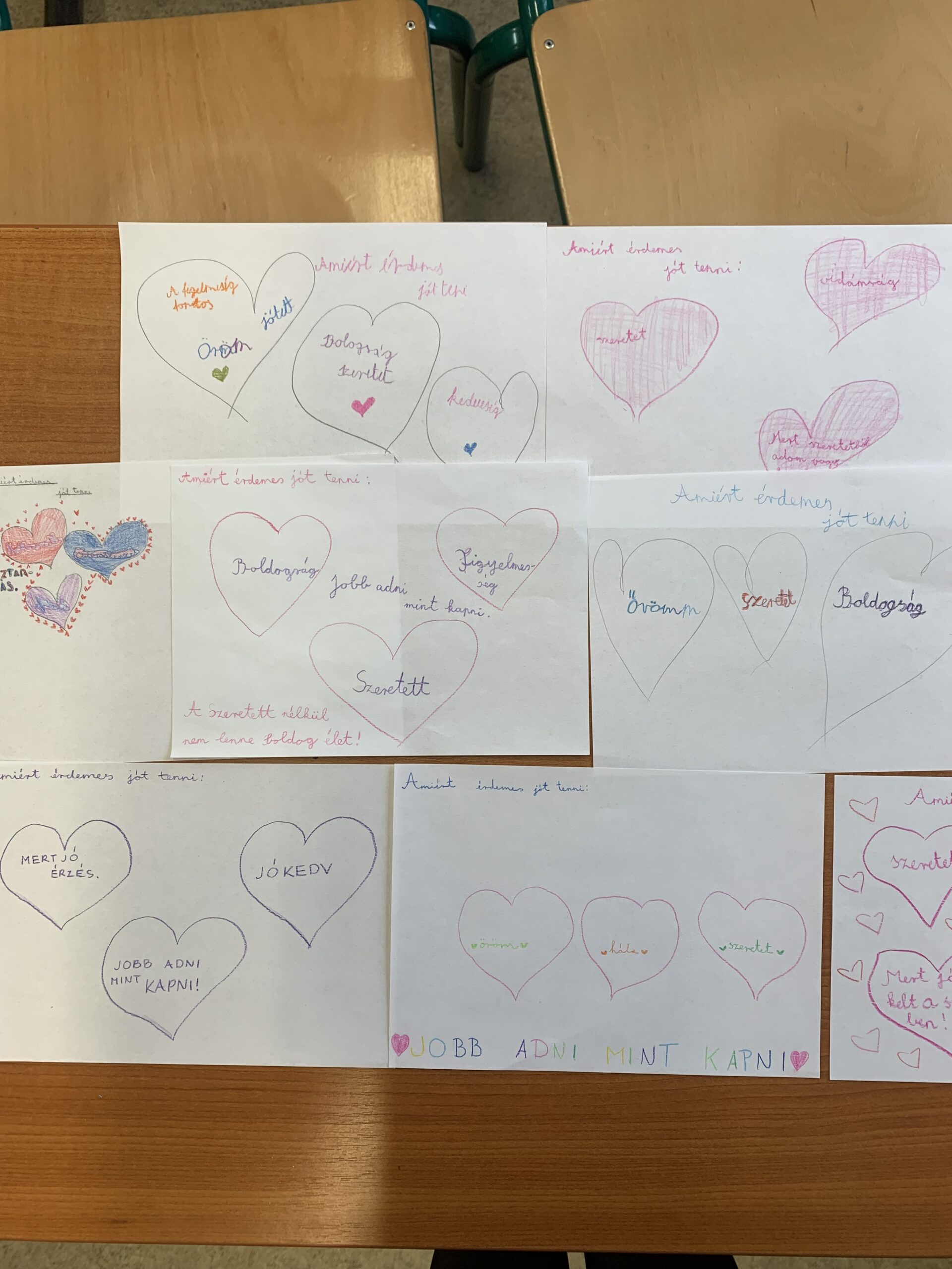 Az órán az adományozásról kisvideót is megnéztek a gyerekek, majd szivecskékbe írták, miért érdemes jót tenni. A gyerekek tájékozottak az adományozás témában, mert ismert személyek neve is felmerült, valamint olyan játékok is, ahol a befolyt összeg egy részét jótékonykodásra fordítják. Azt is megfogalmazták, hogy részesei voltak zeneiskolai fellépéssel idősek otthonában, ahol a kellemes érzést, a jó programot nyújtották az ott élőknek.