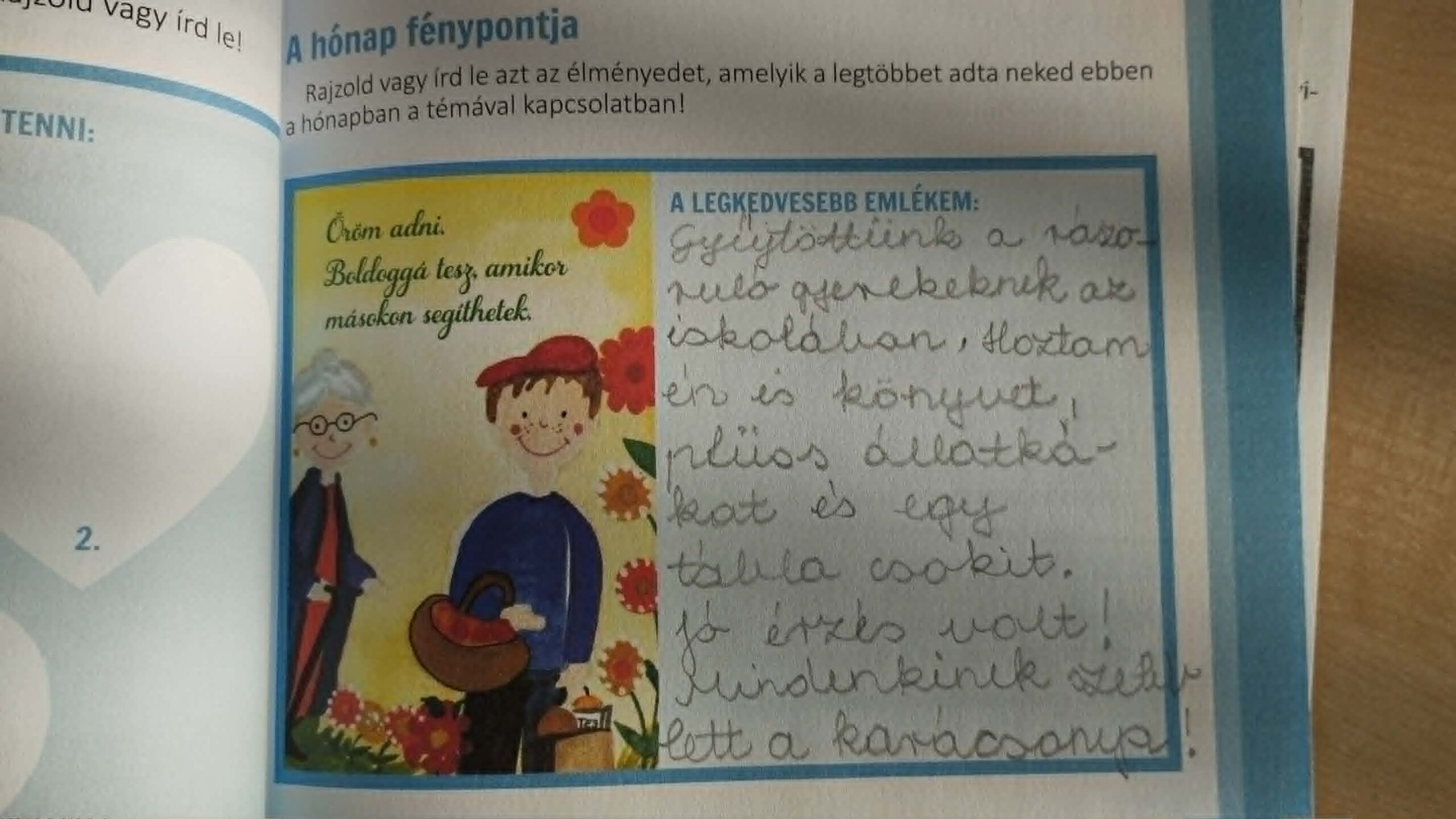 4. Munkafüzetben 63. 64. 65. oldalon megoldottuk a feladatokat. (Rajzold le, színezd ki, hogy mire van szüksége egy jótevőnek! Adventi kihívás-vond be a családodat! Három tanulság megfogalmazása a témával kapcsolatban. Mi okozott örömet ebben a hónapban?)