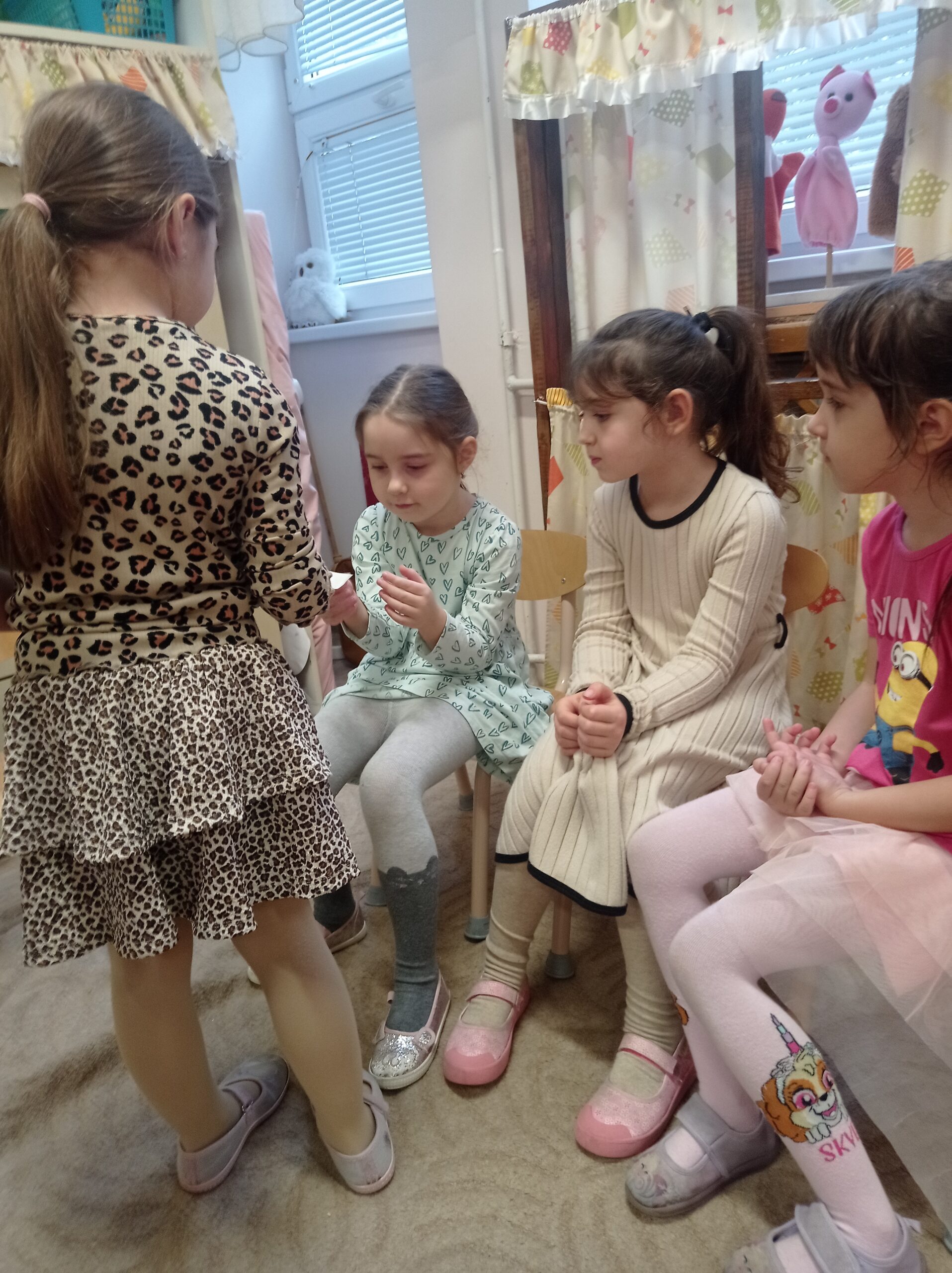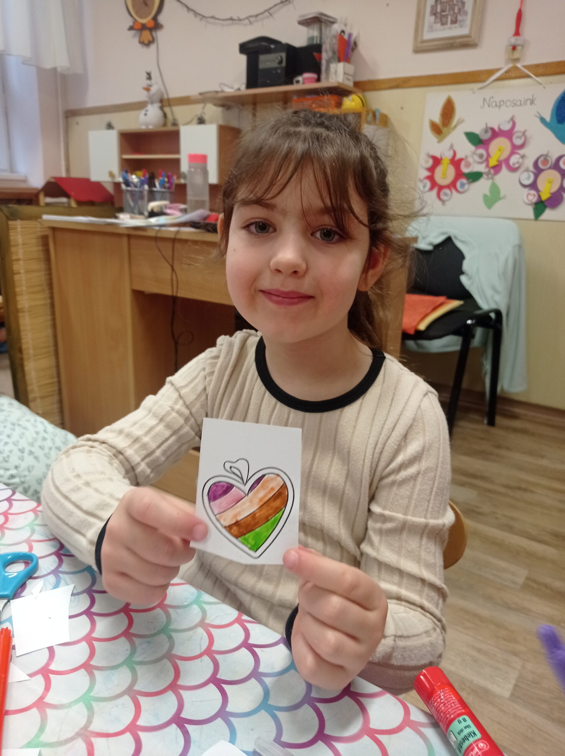 A foglalkozást a Bagdi Bella Jó emberré…. című dalával kezdtem. A gyerekek leültek körbe a szőnyegen, és meghallgattuk a dalt. Utána beszélgettünk arról, hogy ki, hogyan szokott segíteni otthon anyának, apának. Majd egy játék következett: Arcizomlazítás játékosan. A relaxálás után Bezzeg Andrea: Szívem kertje című meséjét elmeséltem. Amiről sokat beszélgettünk. Elmondták a gyerekek, hogy kinek melyik szereplő tetszett, visszaidéztek egy-egy jelenetet, elmondták, hogy szerintük mit érezhettek a szereplők. Megbeszéltük, hogy ki, hogyan szokott segíteni a társának a csoportban. pl. „Segítek elzárni a csapot”, „Én szoktam segíteni Elizának öltözni”, „Én mindig Inezzel elrakom a játékot”. Egy játékot hoztam nekik, a Jóságos manókat. A gyerekek kihúzták egymás jelét egy kalapból. Megbeszéltük, hogy senkinek sem lehet elmondani, hogy kit húzott, viszont nagyon sokat kell segíteni neki, legyenek velük figyelmesek. A nap végén megbeszéltük, hogy ki tudja kitalálni, hogy őt ki húzta, ki hogyan és miben segített a társának. Végül a gyerekek készítettek barátaiknak barátságszívet, amit oda is adtak, volt, aki másik csoportba járó gyermeknek készített. Majd a téma jelét is felragasztottuk a következő lépcsőfokra.