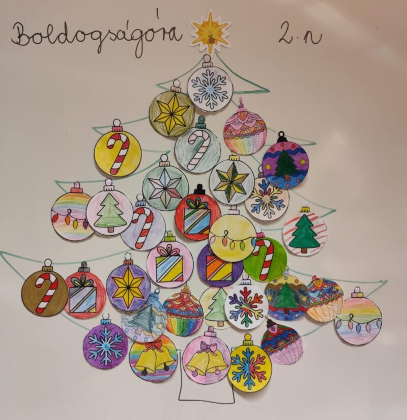A decemberi boldogságóra különleges hangulatban telt. A foglalkozás középpontjában a jó cselekedetek álltak, valamint az, hogy hogyan tudunk örömet szerezni másoknak – akár egy apró figyelmességgel is. A gyerekekkel lelkesen készültünk a karácsonyra. Közösen gondolkodtunk azon, mit jelent adni, és miért fontos odafigyelni egymásra, szüleinkre és a körülöttünk élőkre. Megalkottuk az osztály karácsonyfáját, melyre saját készítésű díszek kerültek. Minden díszre egy-egy jócselekedet is felkerült, amelyet az elmúlt egy hónapban tettek a tanulók. A szeretet ünnepének közeledte számtalan lehetőséget nyújtott a jó cselekedetek gyakorlására. Több ajándékozási kezdeményezésbe is bekapcsolódtunk. Nagy sikere volt iskolánkban az „Egy osztály, egy cipősdoboz” programnak, mellyel a nehéz sorsú gyermekek arcára szerettünk volna mosolyt varázsolni a dobozokban rejlő ajándékokkal, hogy számukra is szebbé és boldogabbá tegyük a karácsony ünnepét. Emellett kézműveshét keretében mi magunk is készítettünk karácsonyi ajándékokat családtagjainknak.