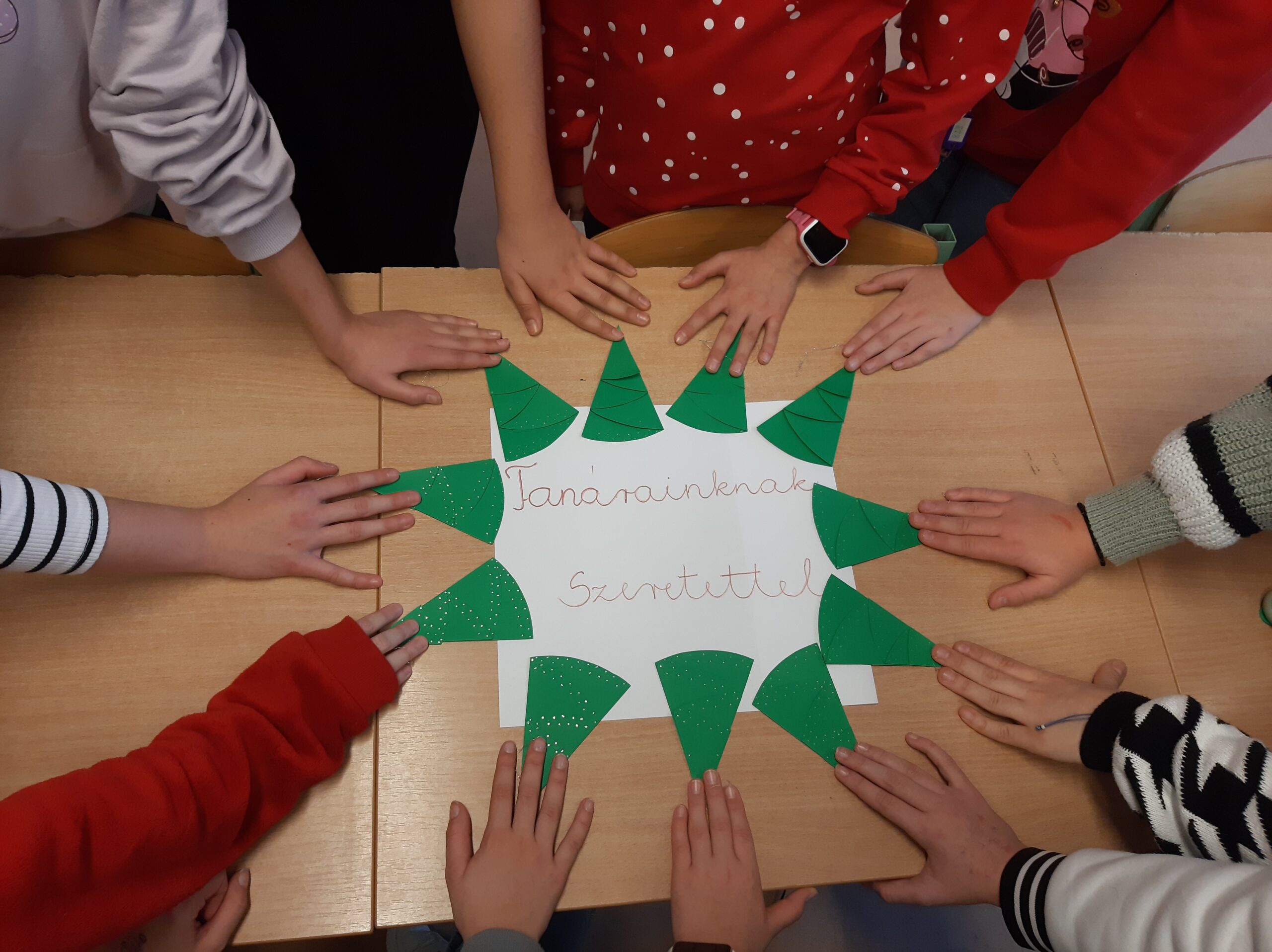6. Téli szünet előtti utolsó napon a tanárok megajándékozása saját készítésű karácsonyfa dísszel.