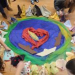 15. Az indián falu közös megépítése. Kirakom a tó körül a hegyeket. Kendőt osztok, a gyerekek rakják körbe a sátrakat.