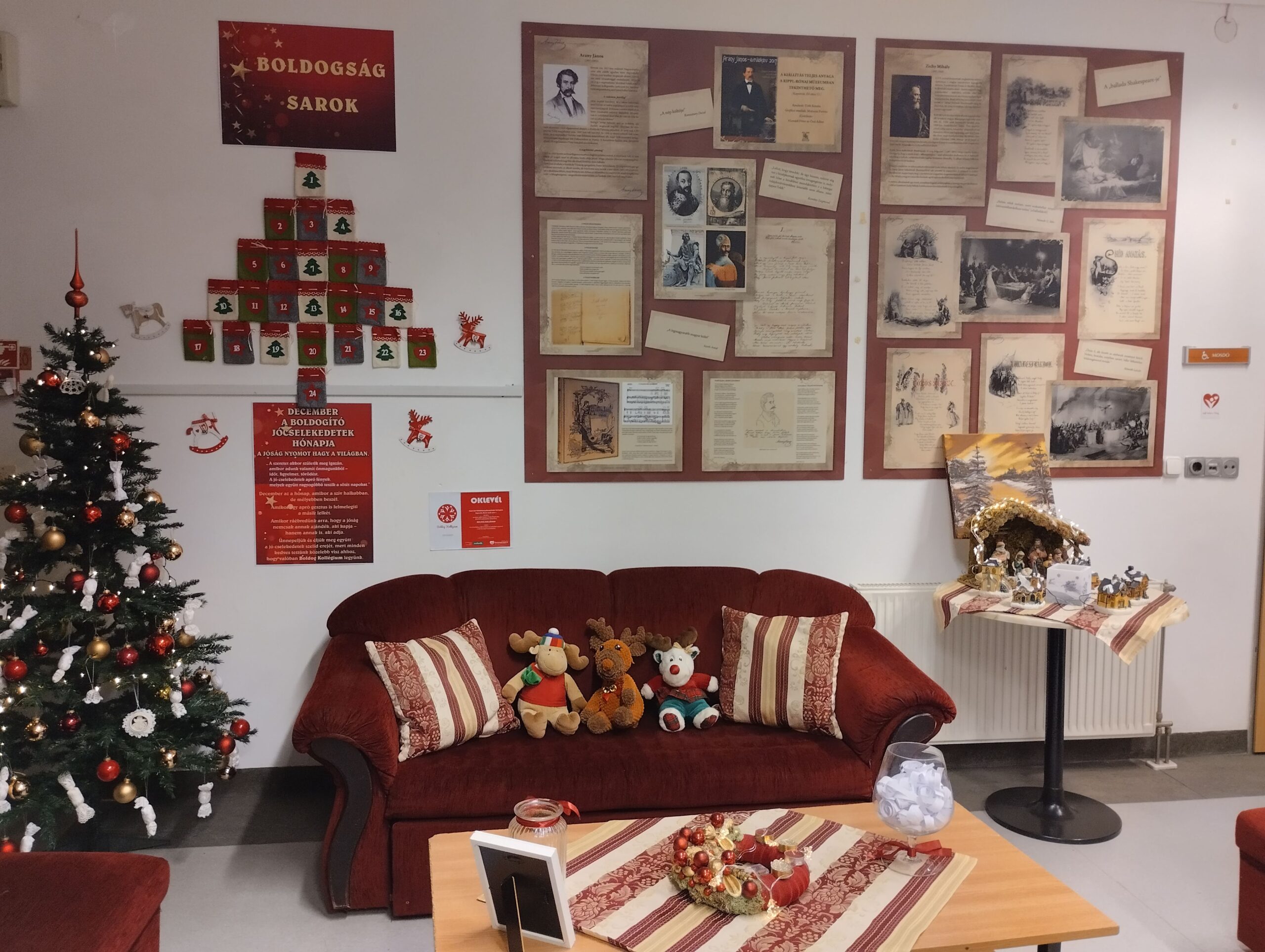 December elsejére a csoportom segítségével elkészült a karácsonyi hangulatú Boldogság sarok. Ebben a kis sarokban benne van, ami az ünnepek varázsát igazán különlegessé teszi: apró figyelmességek, kedves gesztusok, jókívánságok és a közösség melege. A gyerekekkel együtt díszítettük fel a karácsonyfát, ragasztottuk fel a dekorációkat, állítottuk össze a betlehemet. A földszinti aula mennyezetére, ahol a Boldogság sarok van, fehér különböző formájú, mintájú lampionokat készítettünk és tettünk fel a gyerekekkel. Elkészültek a falra a plakátok, a Boldogító jó cselekedetek témában. Az asztalra üvegtálban adventi, karácsonyi idézetek kerültek és egy másik üvegtálba pedig cukorkák. Egy képkeretben szöveg: vegyél egy cukorkát, húzz egy napindító üzenetet és tegyél valami jót valakivel. Egy mosoly, egy kedves szó, egy apró segítség, bármi, ami szebbé teheti valakinek a napját.