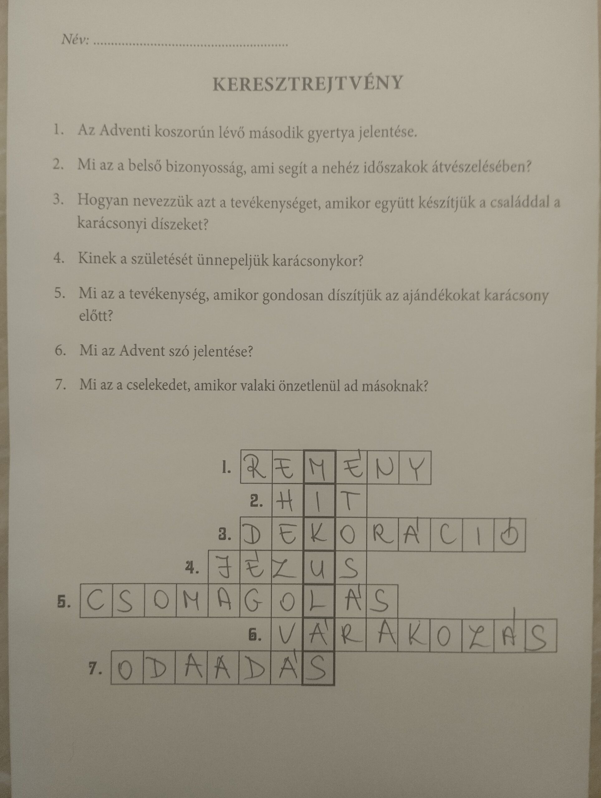 Adventi gondolatokkal, a jó cselekedetek fontosságával és Aranyosi Ervin versével zártuk a foglalkozást.
