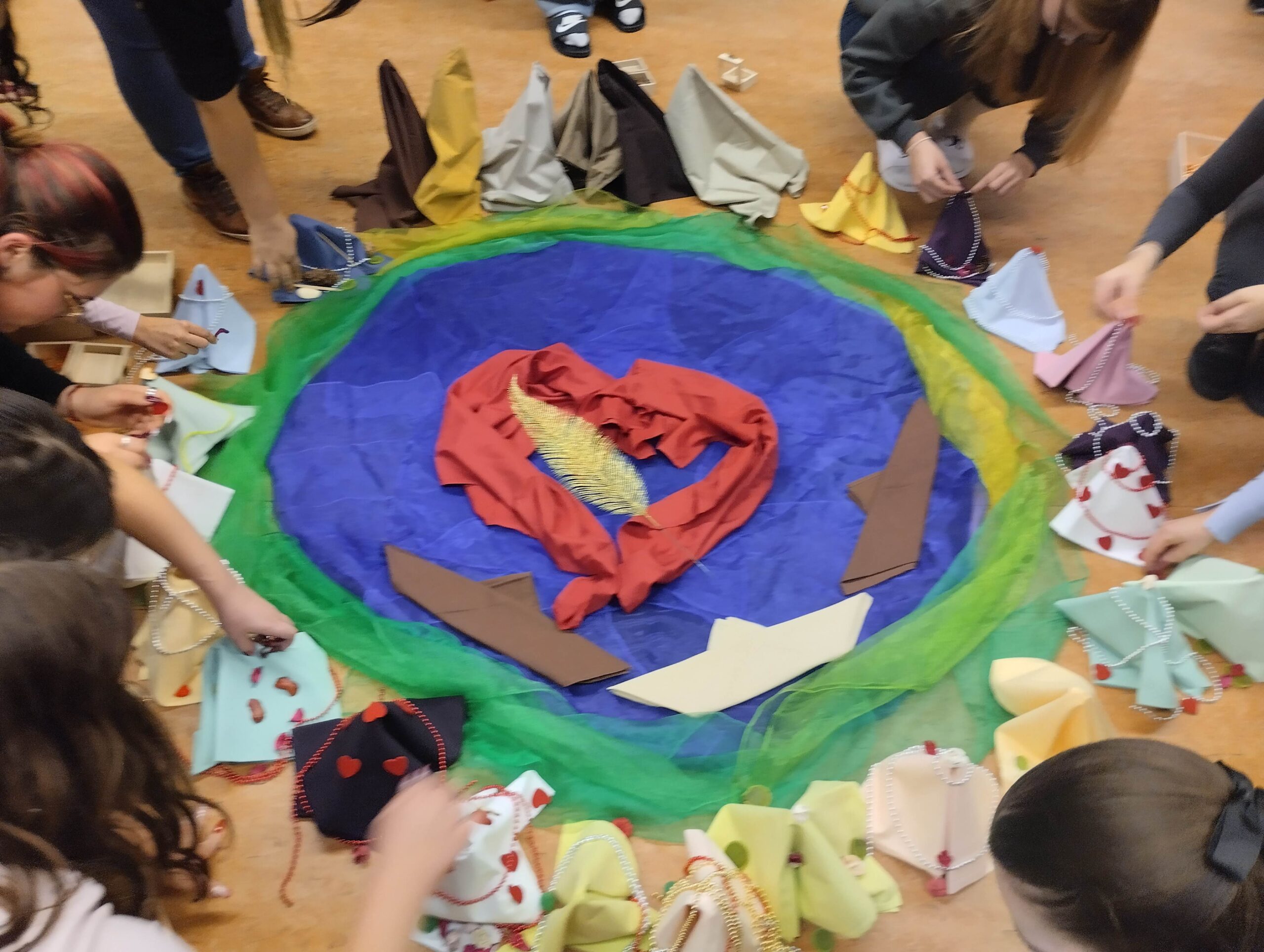 16.Történet elmesélése, mutogatásokkal közösen –végén az aranytollat egy piros kendőből kibontom és körbeadom, majd a közös képünk közepére teszem.