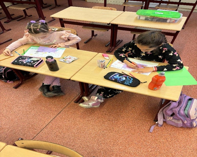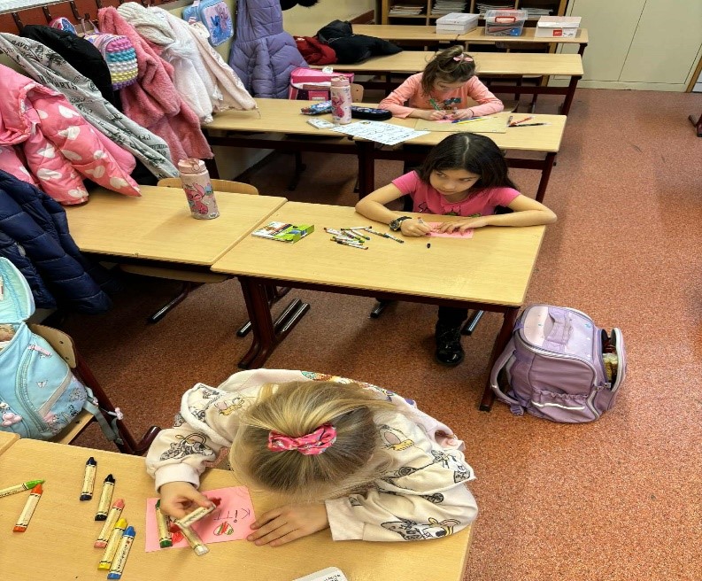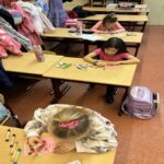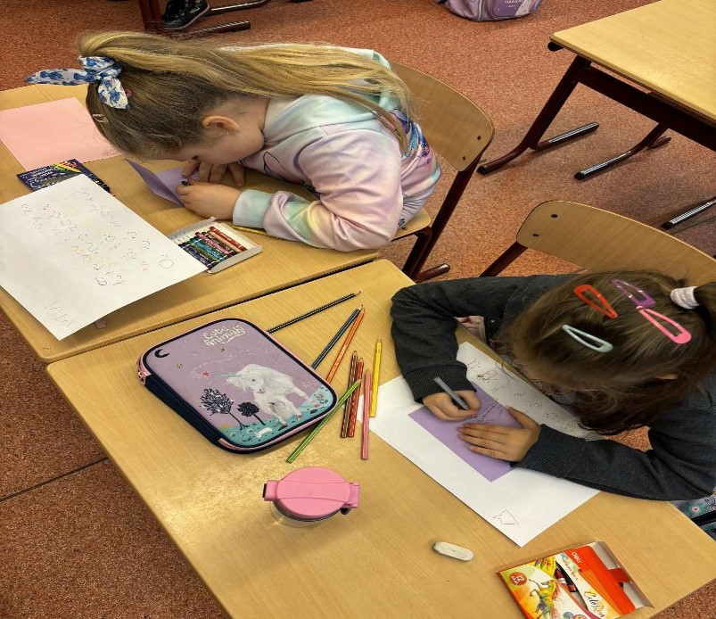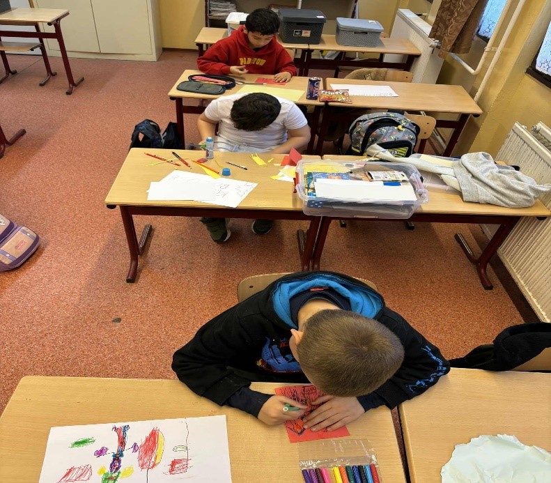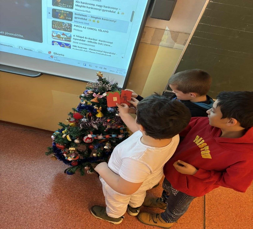 Jócselekedetek kártyákat készítettünk az első osztályos gyerekekkel. Lerajzolták a vállalásaikat. A hét leteltével megnéztük, sikerült-e a teljesítés. Elhelyeztük őket az osztály fenyőfáján. A tanulók aktívan, örömmel dolgoztak a rajzórán.