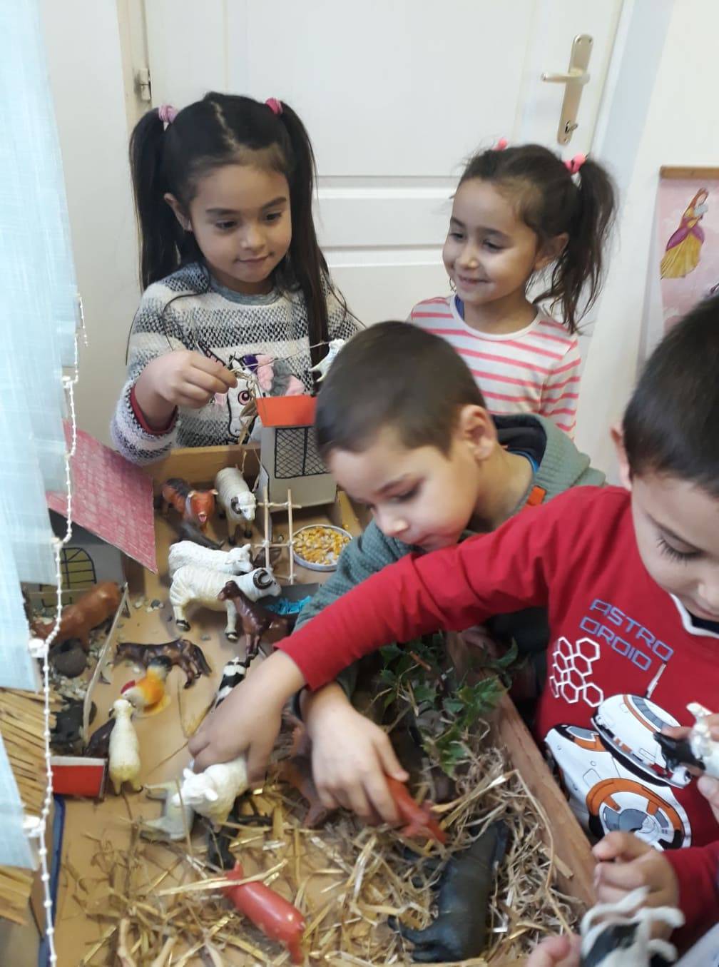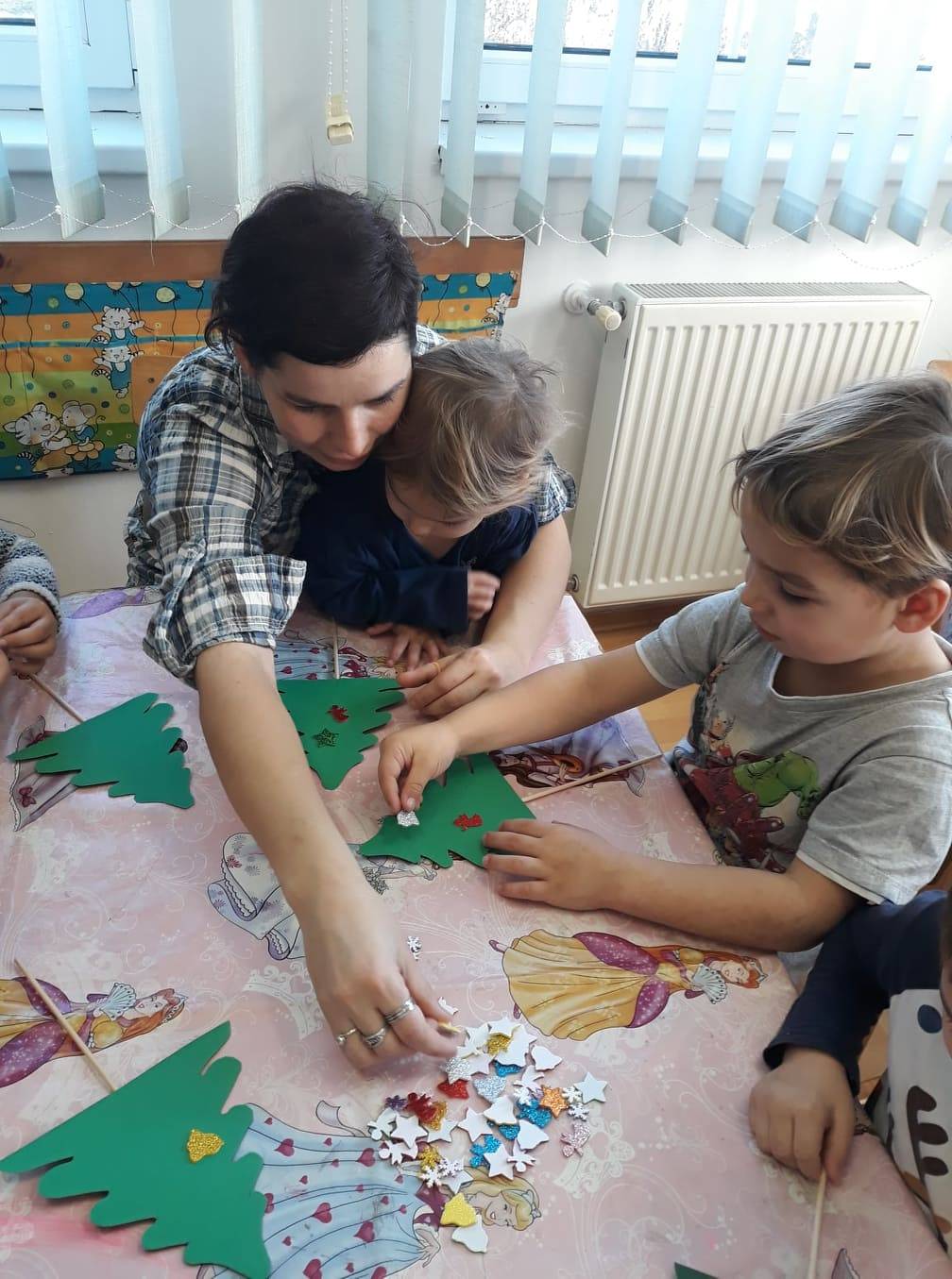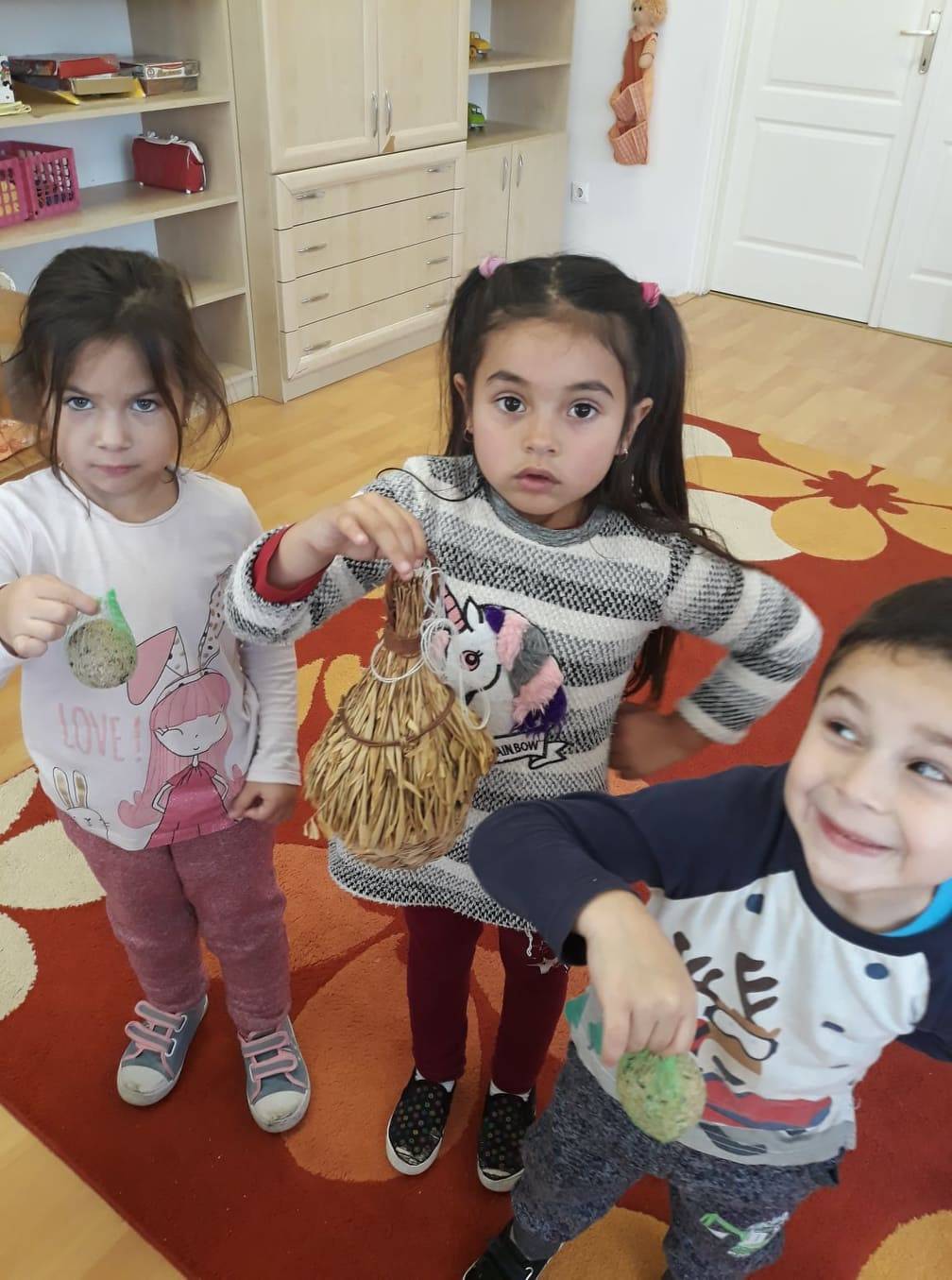 A hónapban is sok mozgásalapú relaxációs gyakorlatot végeztünk a gyerekekkel. Az „Irkafirka” és a „Puha meleg, felengedek, meleg vagyok elolvadok” volt a kedvencük. Ehhez „saját élményt” is szereztünk, hiszen nagy hó esett, amiből a csoportszobában olvasztottunk és megfigyeltük az olvadás folyamatát, feltételeit. A madárkáknak madáretetőt készítettünk és eleséget gyűjtöttünk, majd kivittük az udvarunkon a fára. Utána a csoportszobából jól láthattuk, hogyan csipegetik a cinkék. Szőnyegen vadasparkot építettek a gyerekek, és abban is minden állatkát megetettek. Sokat beszélgettünk arról, hogy hogyan is védelmezhetjük télen az állatokat. A jó cselekedetek hónapja, és a közelgő ünnepre készülve, ajándékot készítettünk a községünk Biztoskezdet gyermekház lurkóinak.