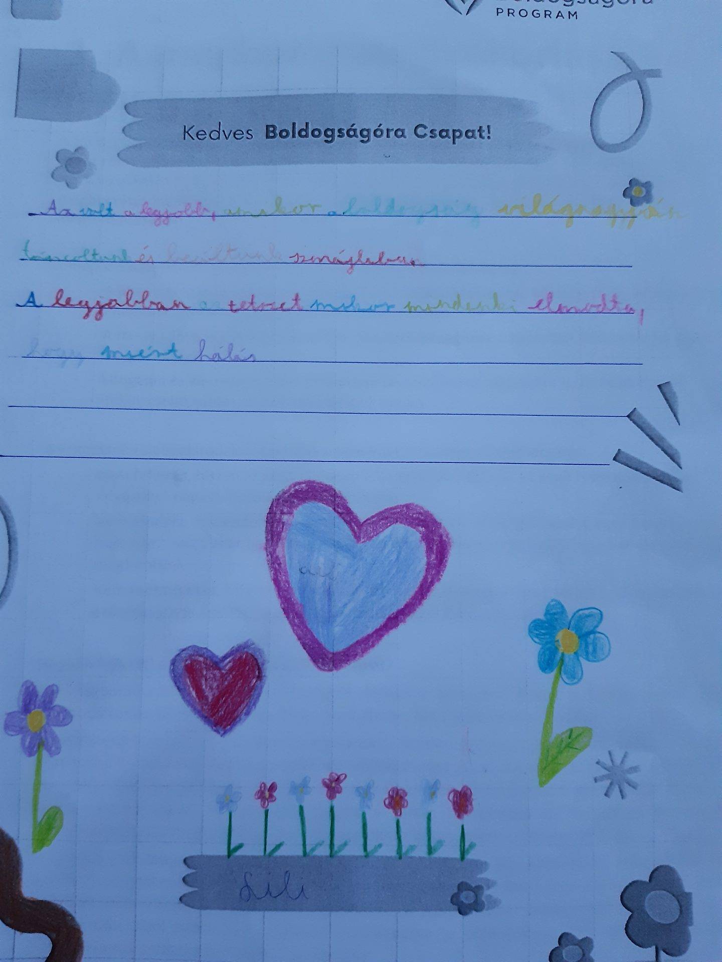 A téma bevezetéseként a Te tetted… kezdetű nyelvtörő mondókával játszottunk, miközben babzsákot dobáltunk egymásnak. Aztán beszélgetőkör következett. A tetteink, mondataink következményeiről beszélgettünk. Így jutottunk el a megbánásig. Arckifejezésekkel, testtartással mutatták be a gyerekek a haragot, sértettséget, megbánást, megbocsájtást. Néhányan elmesélték saját történetüket a témával kapcsolatosan. Mindenki elkészítette a bocsánat állatát. Következő órán bemutatták a gyerekek egymásnak a rajzaikat. Majd elkészítették a leveleket, melyben megfogalmazták, hogy miért szeretnek boldogságórára járni. Természetesen meghallgattuk Bagdi Bella aktuális dalát és a Gyújts egy gyertyát a Földért című csodálatos énekét is. A faliújságon egész hónapban kint volt az áprilisi pozitív élménynaptár. Ebből is igyekeztünk minden feladatot elvégezni ( a családit átszabtuk az osztályközösségre).