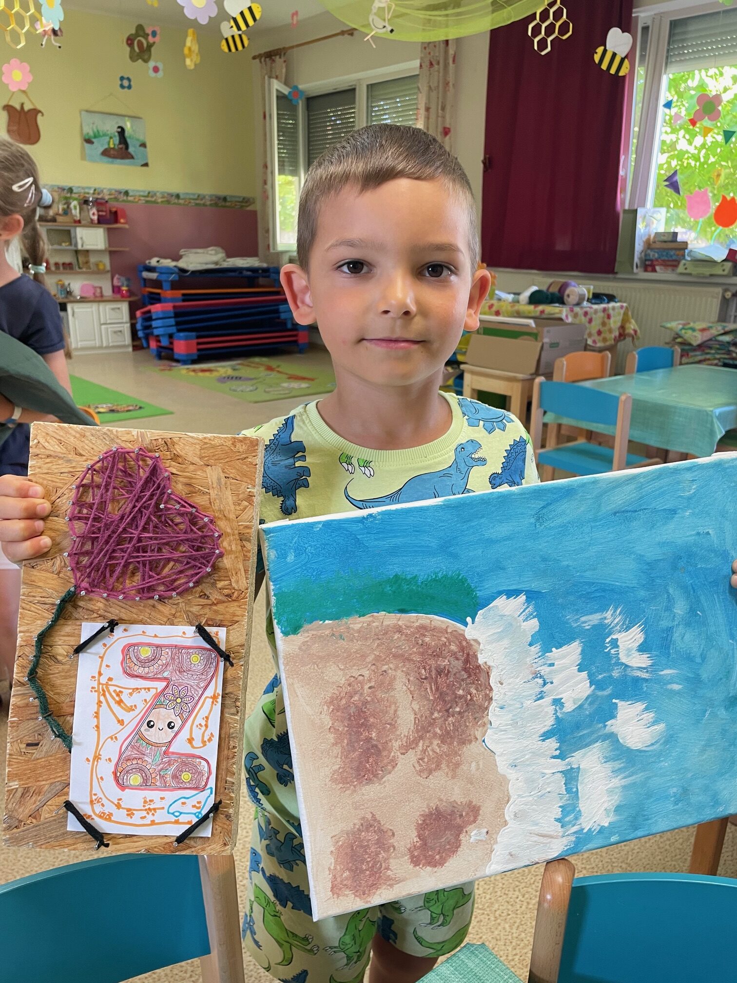 Ezen kívül a csoportnak még Erdei óvoda, illetve kézműves tábor hete is volt – utóbbi csak a ballagó nagycsoportosoknak. Egyik nap, fonalképet készíthettek a gyerekek, amin egy „szívvirág” is helyet foglalt. Ezek az alkalmak azok, amikor még utoljára, a nyári szünet előtt közösen tölthetik az időt, kreatív módon, barkácsolással, ám mégis vidám, örömteli hangulatban.