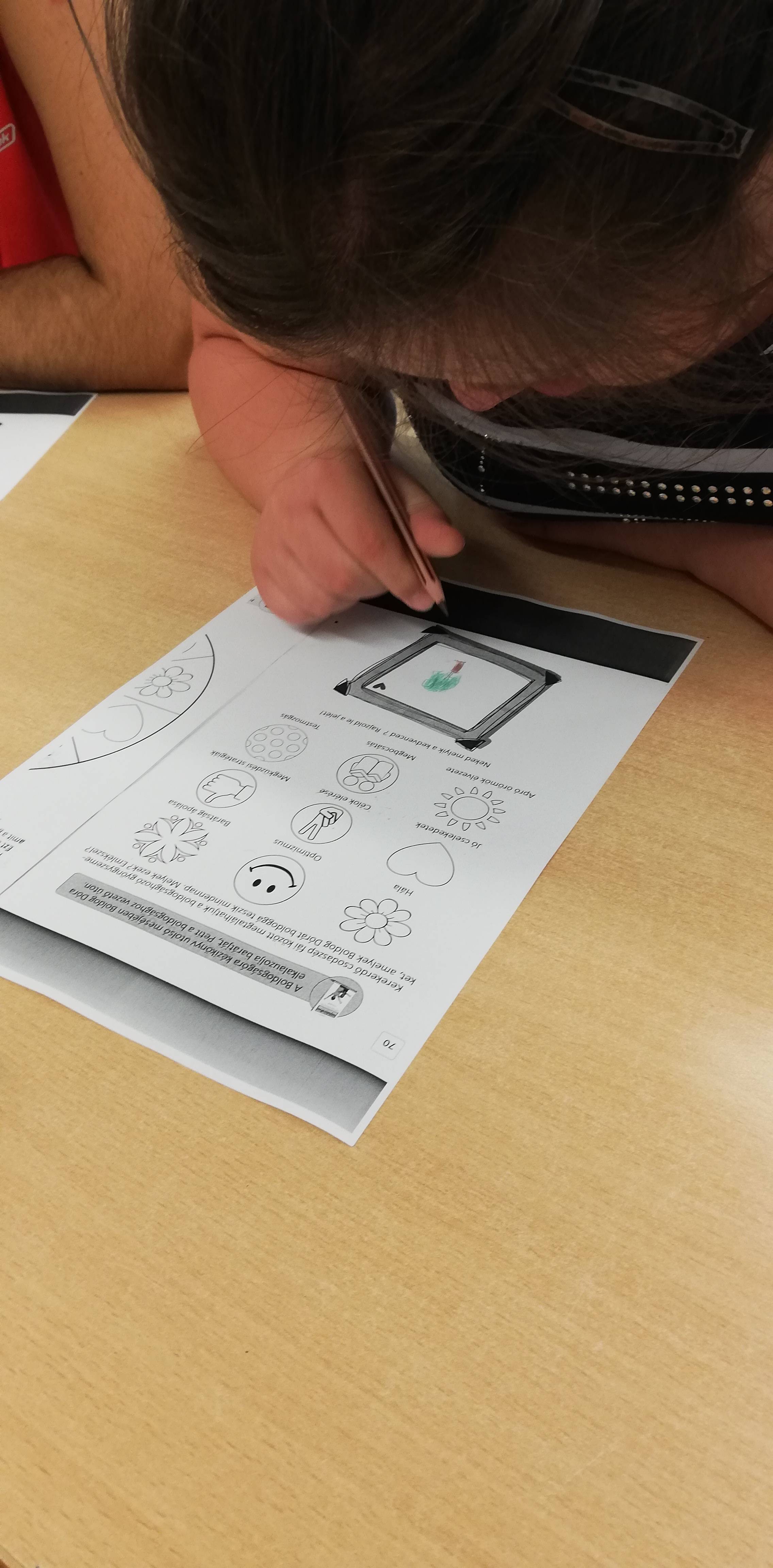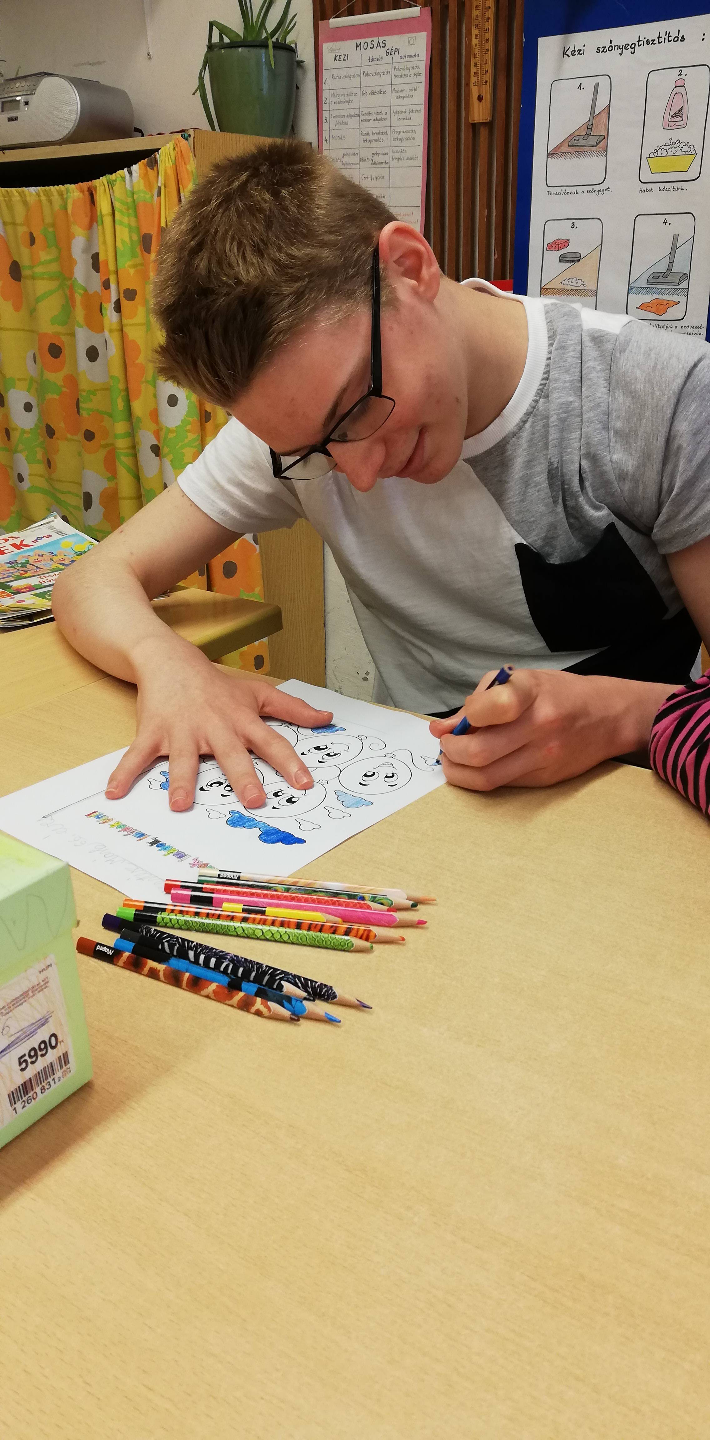 A tizedik témát az értelmileg akadályozottak 9-10. osztályos tanulóival dolgoztuk fel, éltük meg együtt. Relaxációs gyakorlatokkal kezdtük az órát, majd jobb-bal agyfélteke összehangolást végeztünk torna segítségével. Egy lufis színezőt kaptak a gyerekek, kértem őket, hogy próbálják meg minél színesebbre kiszínezni a lufikat. Az ovisok munkafüzetéből átbeszéltük a 10 témakört, mindenki kiválasztotta a kedvencét. Az óra második felében meghallgattuk Bagdi Bella: Jobb veled a világ című dalát, közben minden tanuló kapott a neme szerint egy papírbabát, amit kiszíneztek, majd a táblára feltettük őket, mintha fognák egymás kezét. Nálunk ez jelenti a legnagyobb boldogságot, hogy támogatják, szeretik egymást az osztályban a gyerekek, jó barátok.