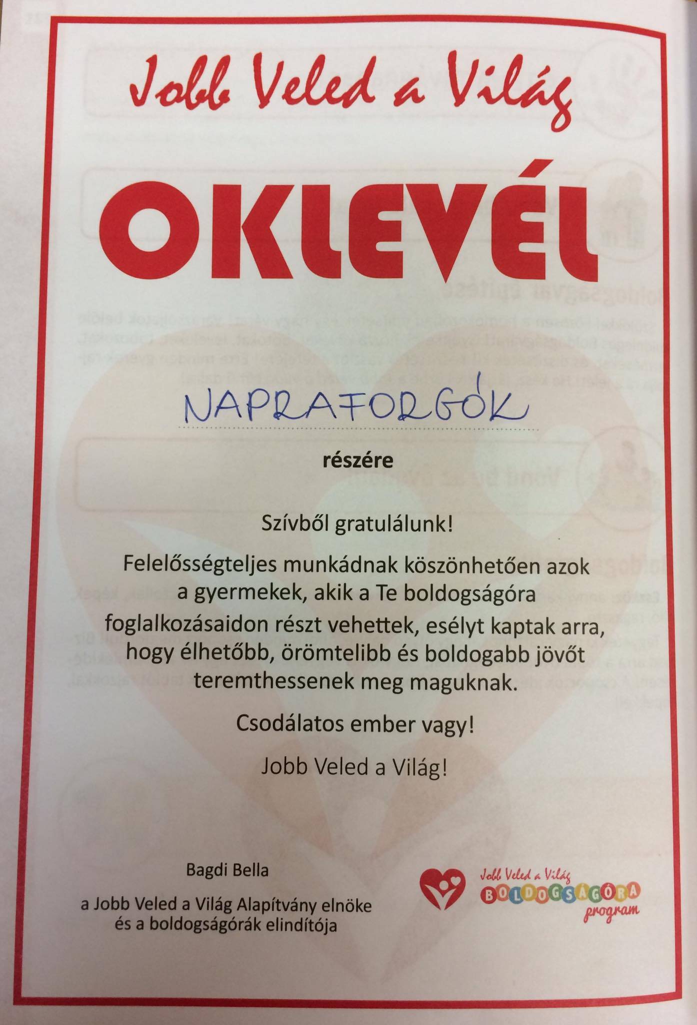 Jó érzéssel tölt el végigtekinteni az elmúlt időkre és évről évre rájövök arra, hogy három évvel ezelőtt egy bölcs döntést hoztam: Boldogságórákat tartok a gyerekeknek! Büszke vagyok az eltelt időszakra, óvodánk falát díszítő oklevelekre, fotókra és nem utolsó sorban a gyerekekre.