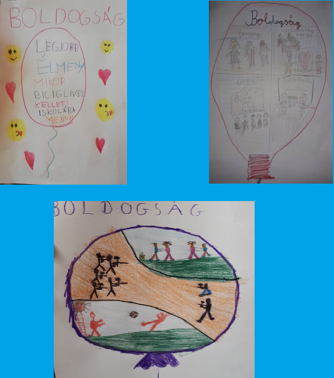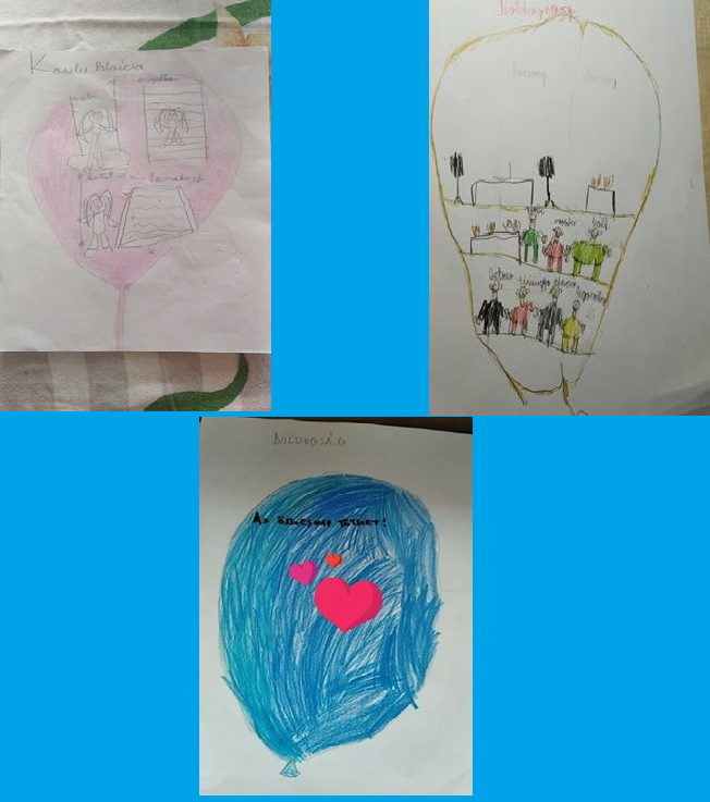 A különleges tanév online hónapjaiban továbbra is -ha nem is személyesen- foglalkoztunk a Boldogságóra témaköreivel. A gyermekekkel chetes órákon beszéltük meg mit jelentett számunkra ez a tanév. Felidéztük , hónapról, hónapra a különböző témákat, az órákhoz kapcsolódó élményeket. Meghallgattuk a hónap dalát. A boldogságról , a jó időről a gyermekeknek a lufi jutott eszébe, ami szabadon szárnyalhat, szállhat , bárhova eljuthat. S úgy döntöttek egy lufi formába rajzolják le a tanév legjobb, legboldogabb élményeit.