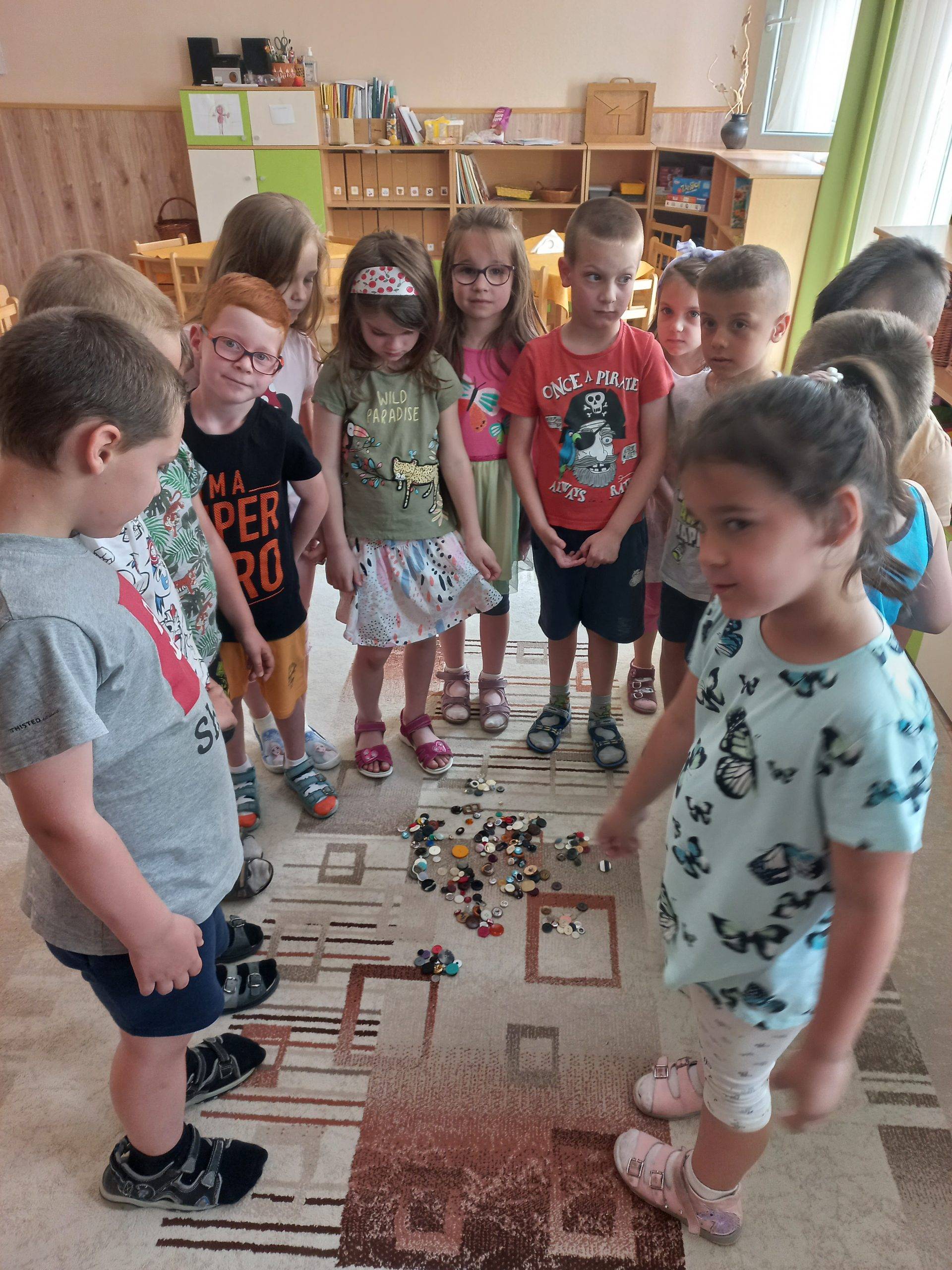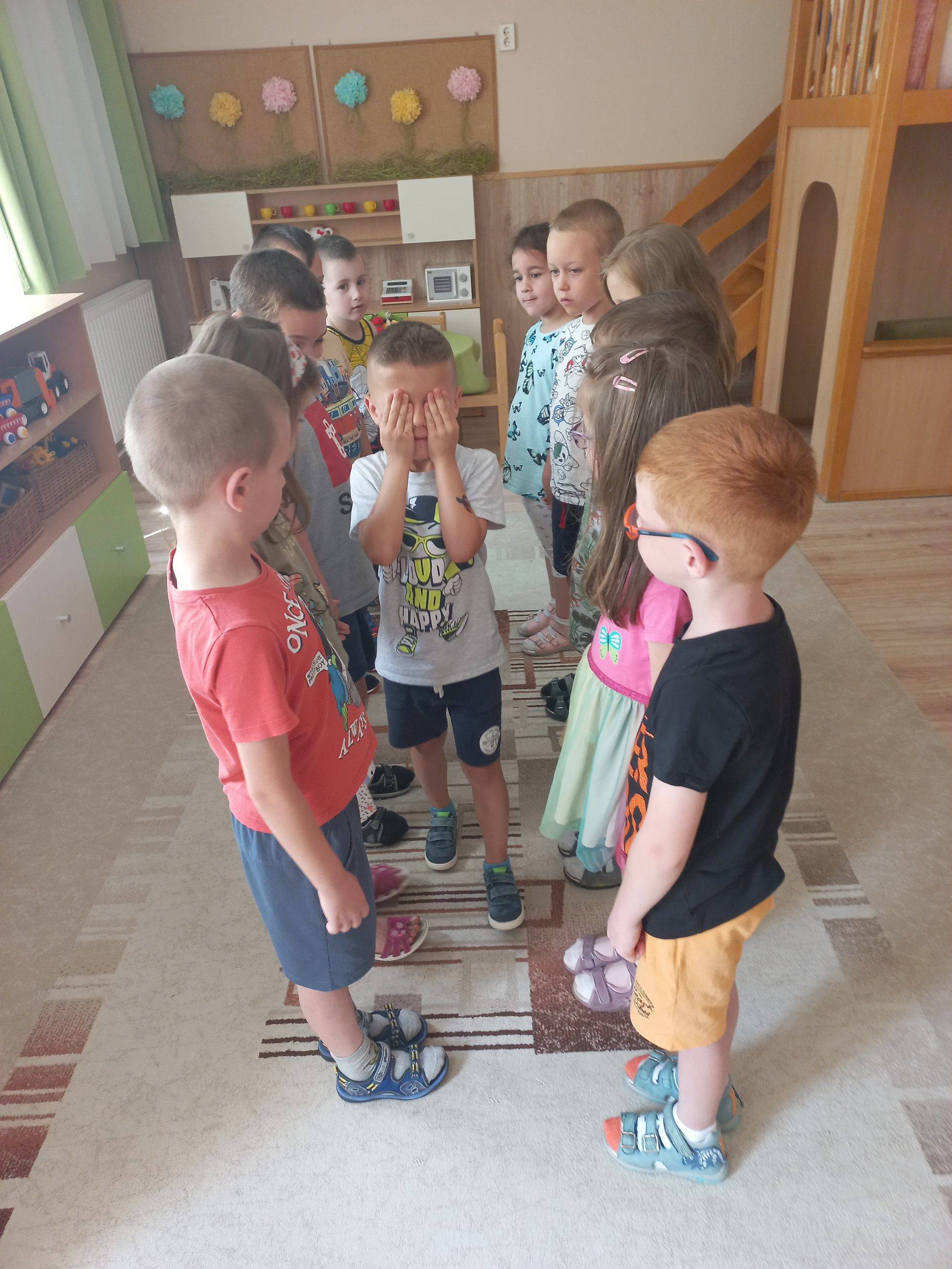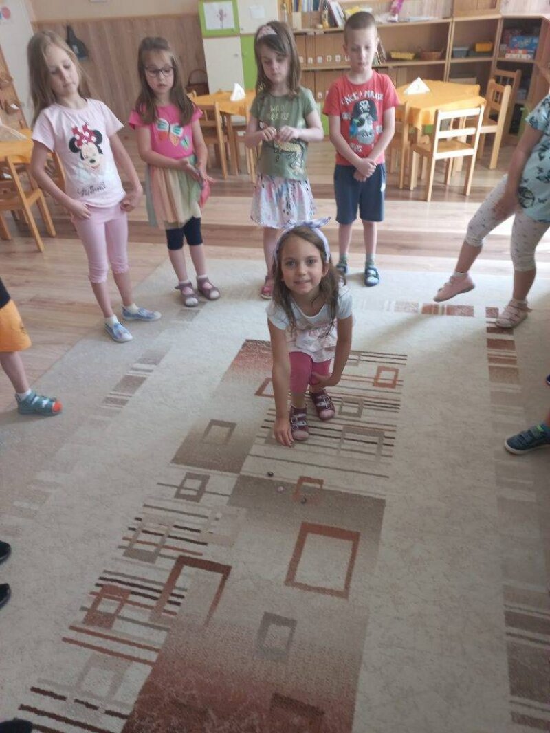 Június hónap témája a “Fenntartható boldogság”. A téma feldolgozását a “Napra forgó a napraforgó” relaxàciós gyakorlattal kezdtük. Körbe álltunk a szőnyegen és mindenki elmondhatta, hogy mi okoz örömet számára, mi teszi boldoggá. Aki mondott valamit, gombot tett a kör közepére, végül egészen nagy kupac gomb gyűlt össze a szőnyegen. Ezt követően „megépítettük” a „szeretetfolyósónkat”, melyen csukott szemmel kellett áthaladni, teljesen megbízva a társakban. Elmeséltem a hónap meséjét a Bezzeg Andrea: Boldog erdő-Kerekerdőt, a mese végén megbeszéltük a mese mondanivalóját és meghallgattuk a hónap dalát Bagdi Bella: Jobb veled a világ című dalát. Kihasználtuk a jó időt és kirándulást tettünk a közeli Csónakázó-tóhoz.
