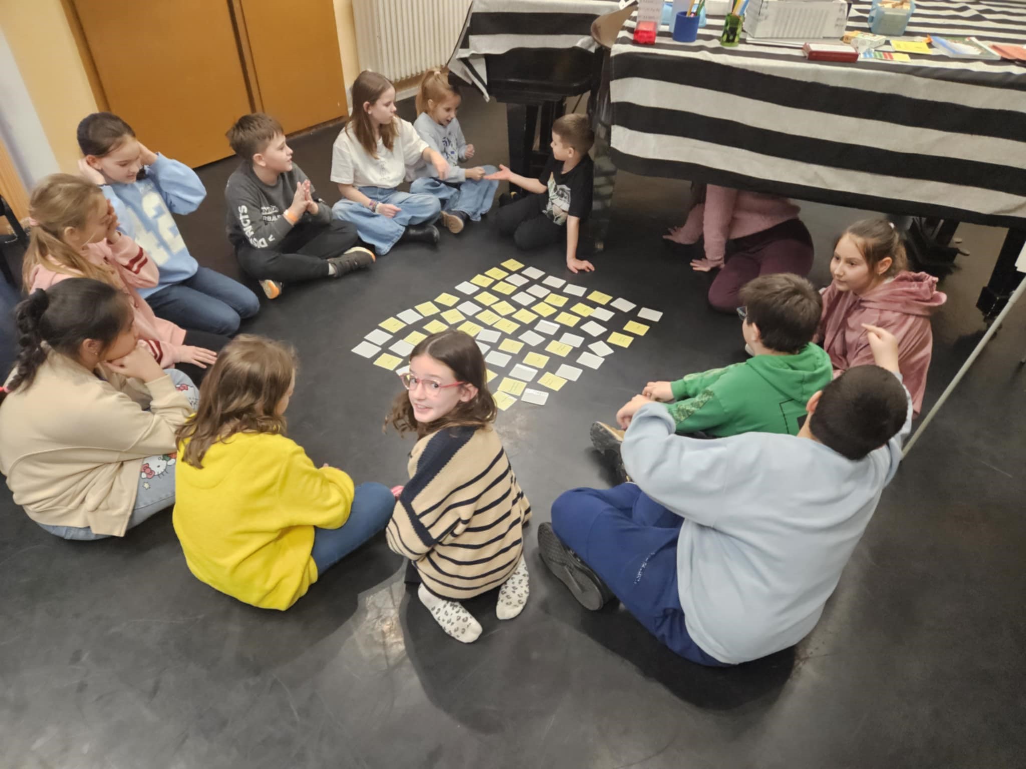A boldogító jó cselekedetek témáját szolfézsórán zenei memóriajátékkal dolgoztuk fel. A játék során a gyerekek egymásra figyelve, türelemmel és segítőkészen vettek részt a feladatban, hiszen a sikerhez együttműködésre volt szükség. Megtapasztaltuk, hogy a közös élmény, a biztatás és az apró segítségek mind hozzájárulnak ahhoz, hogy örömet szerezzünk egymásnak és önmagunknak is.