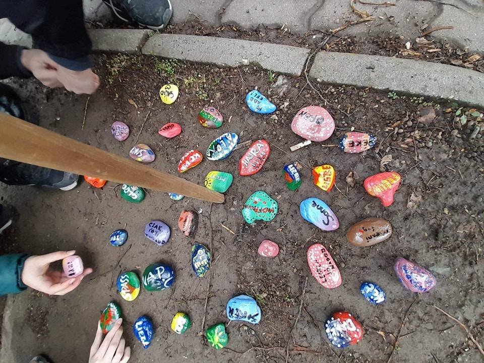Mivel a tartósság is a célunk volt, ezért fixáltuk is az időjárás viszontagságai ellen a kavicsokat. Majd egy kis táblácskát is készítettünk mellé, hogy tudják az arra járók mi is a teendő a kavicsokkal.