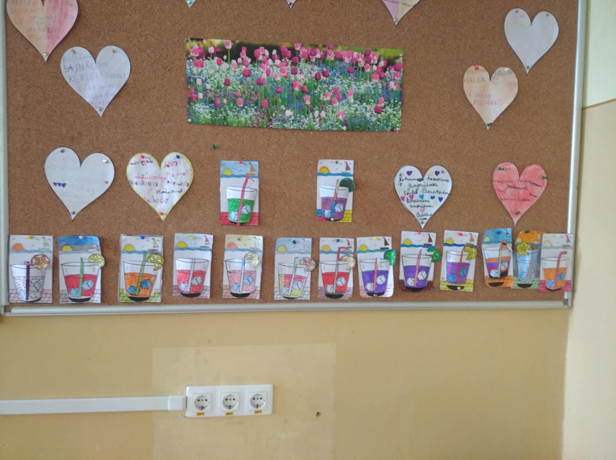 Júniusi boldogságóránk témája: Fenntartható boldogság. Az órát beszélgetéssel kezdtük. Arról kérdeztem a gyerekeket, hogy mi okoz számukra boldogságot. Ezután boldogságkoktélt készítettünk papírból, amelyet kitettünk a faliújságra. Az órát a hónap dalával, a Jobb veled a világ c. dallal zártuk.