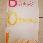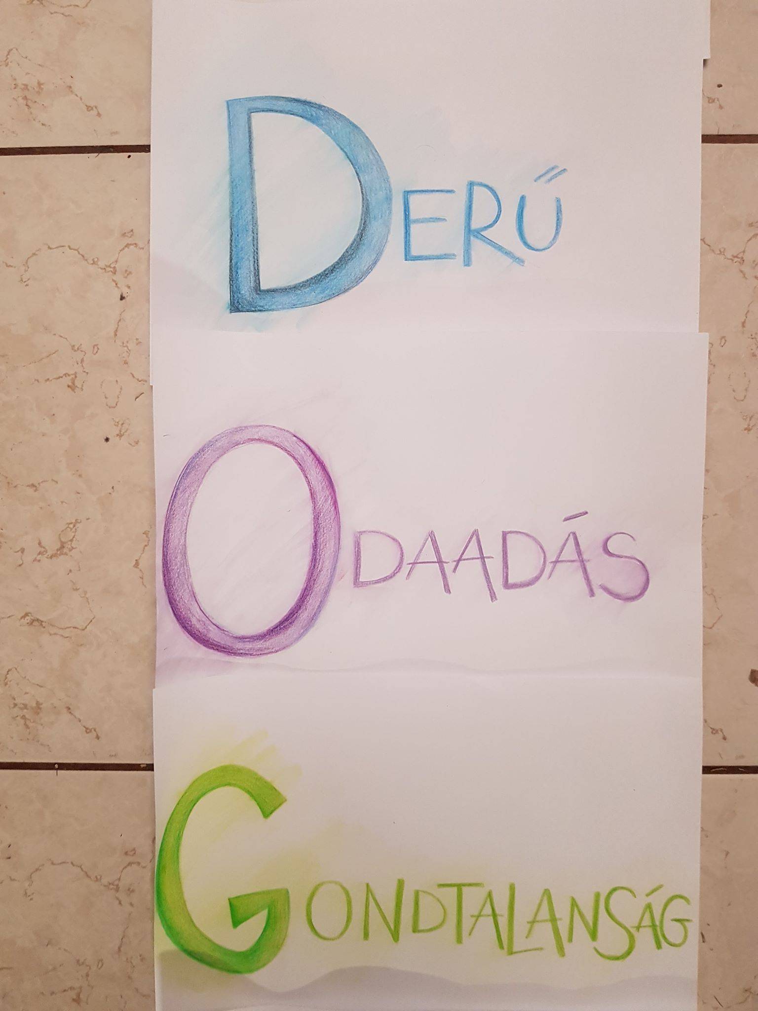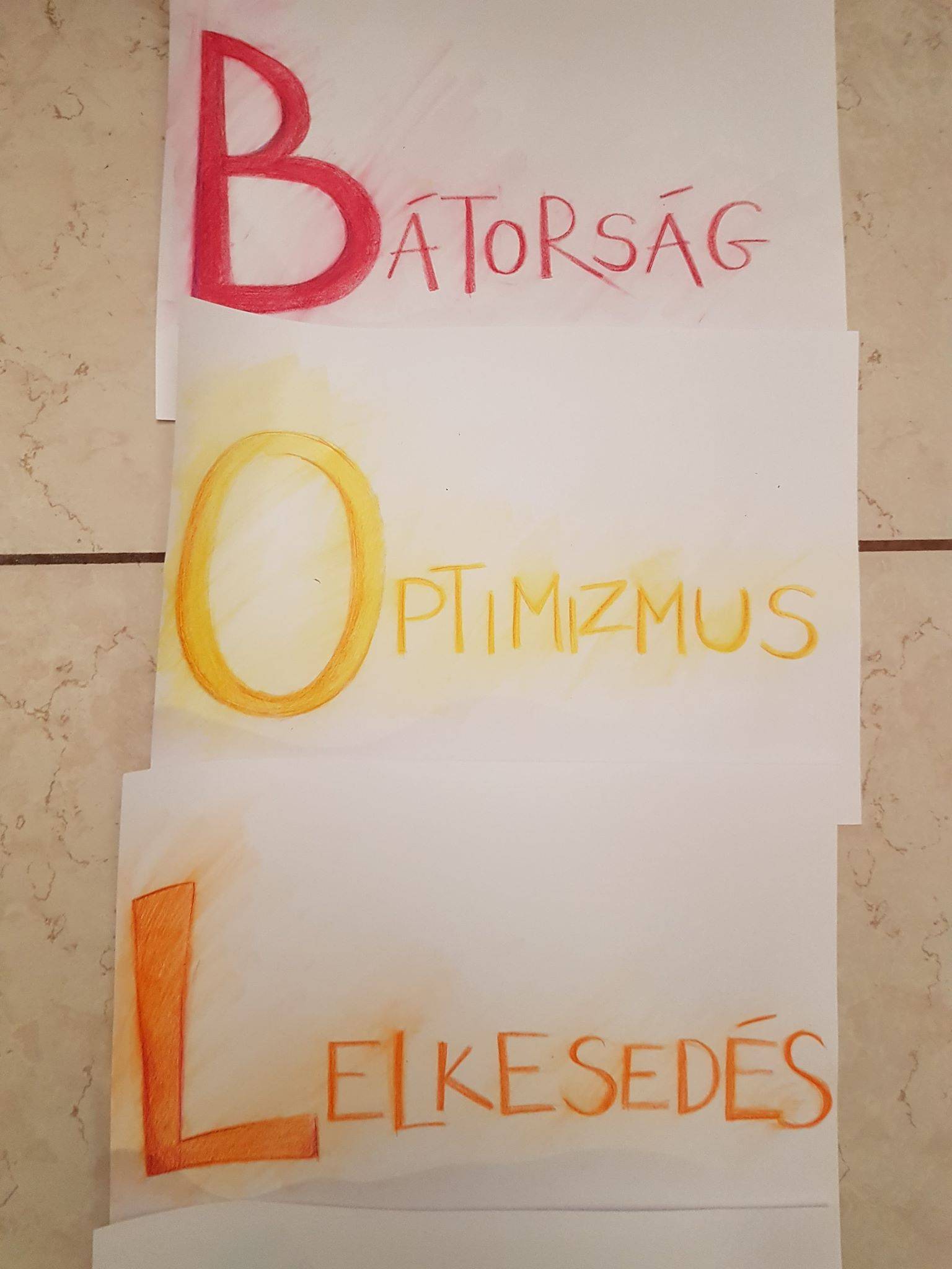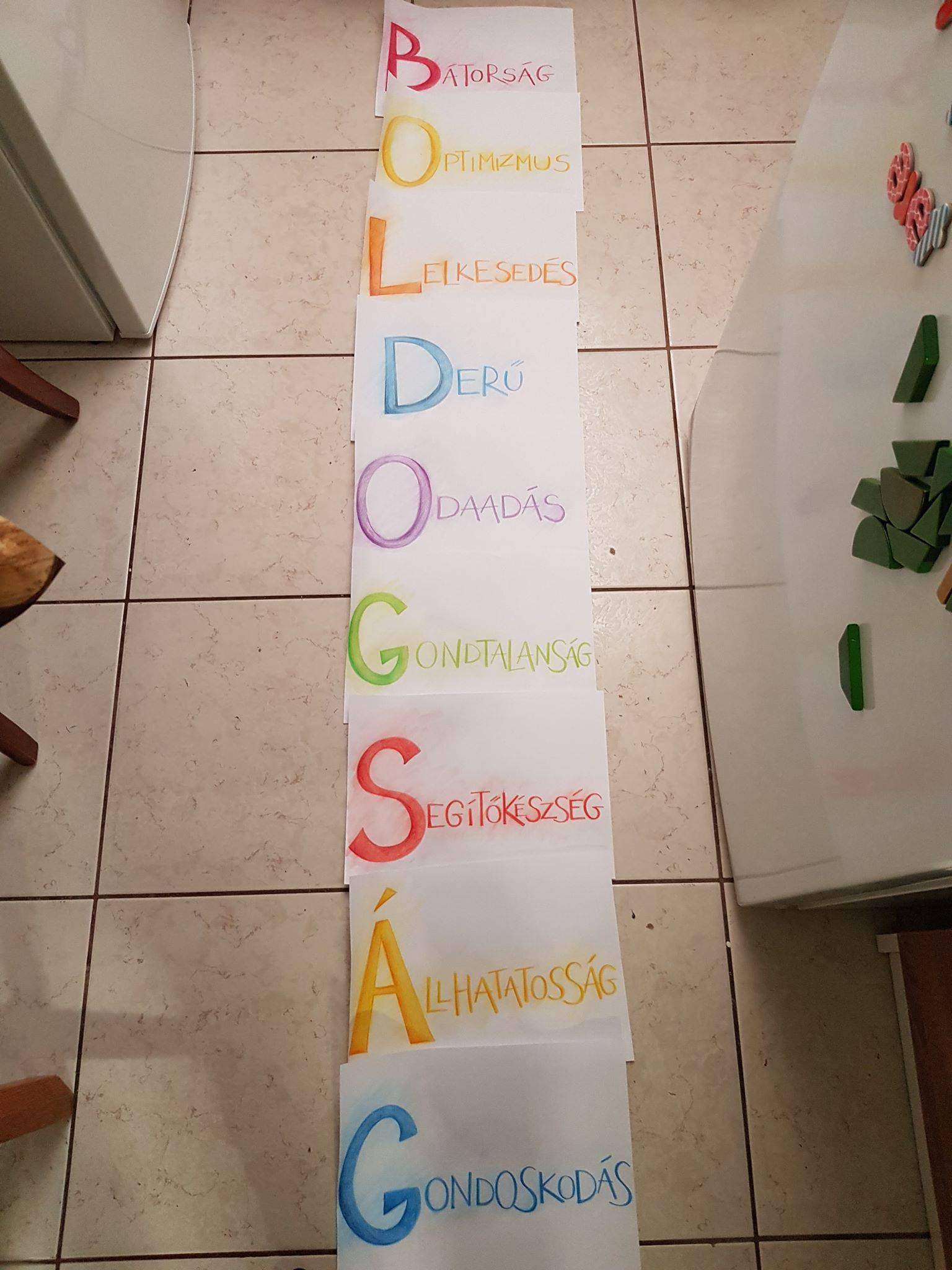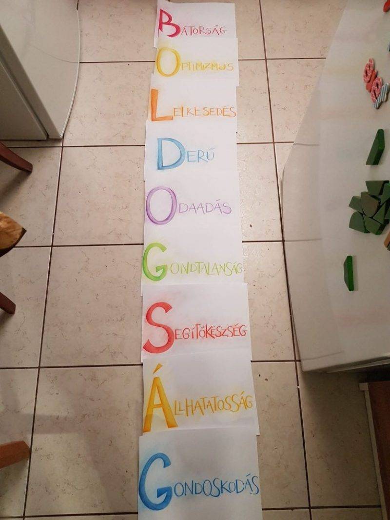 A küzdelmes, fárasztó, boldog pillanatokban bővelkedő online oktatásban a Fenntartható boldogsággal is foglalkoztunk. A BOLDOGSÁG szó betűiből találtak ki mondatokat Zoom-os összejövetelen.Segítségképpen elkészítettem nekik a BOLDOGSÁG feliratot. Elénekeltük a hónap dalát: Jobb veled a világ.