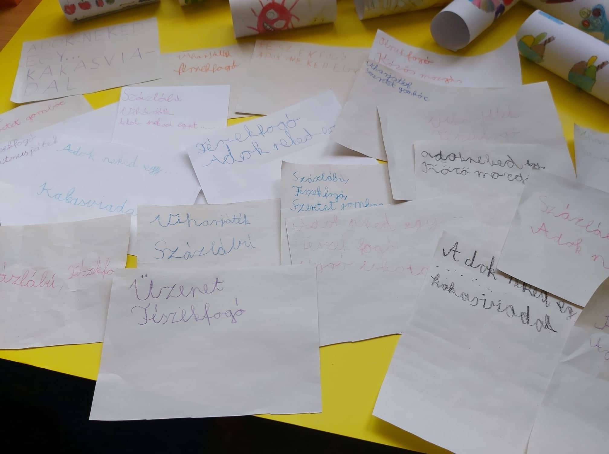 Az utolsó napokban már több időnk volt játszani. A csodapalota című mese meghallgatása után az egyes témakörökhöz, szobákhoz kapcsolódó játékokat eljátszottuk, közben felelevenítettük a régebbieket is. Szinte mindegyikhez volt valakinek egy-egy emléke is, amit most elmesélt. Úgy döntöttek, hogy ne csak egy, hanem két játékot is tegyünk az ötlettárba . A legnagyobb sikere az Adok neked egy …. játéknak volt.