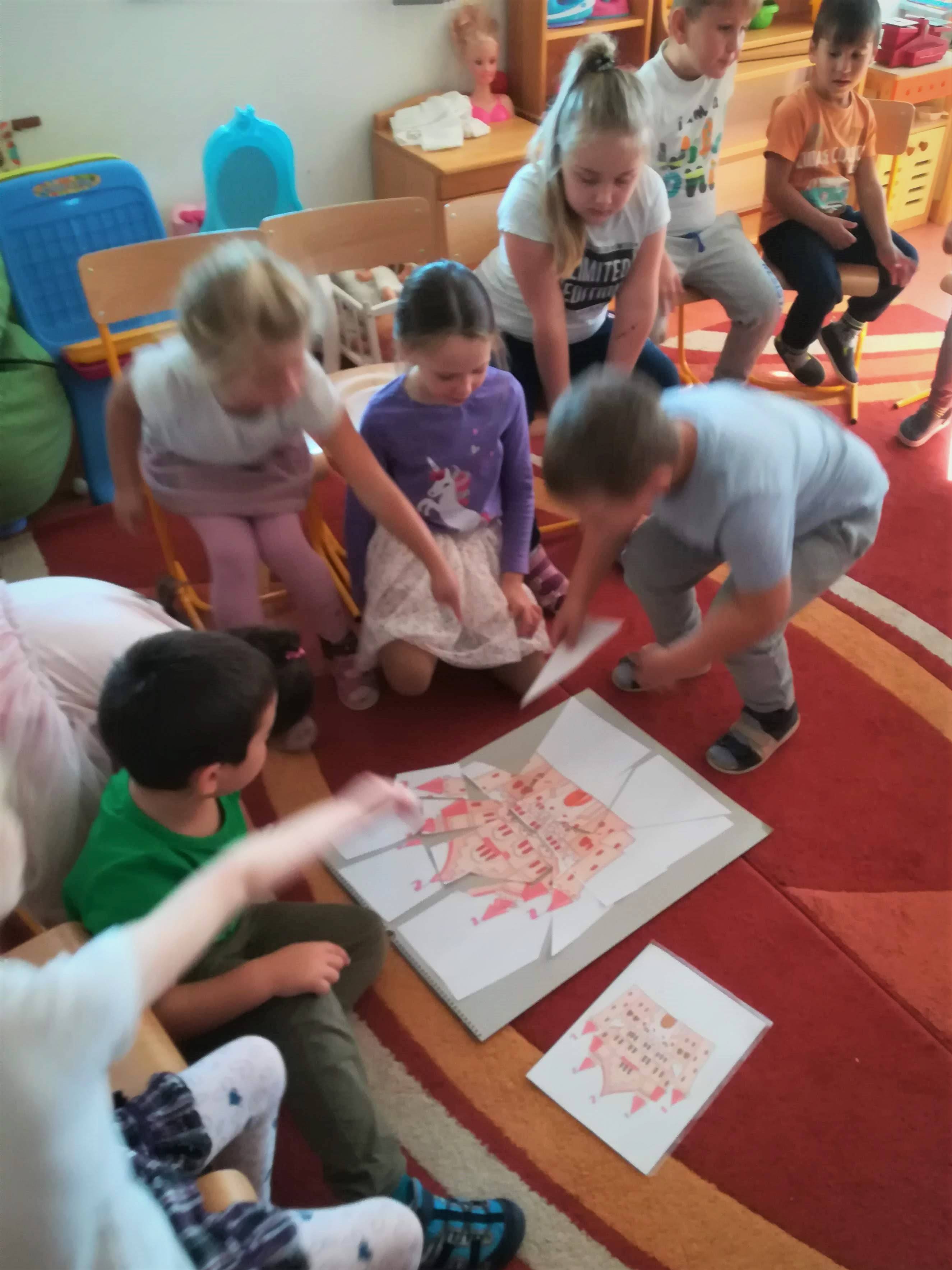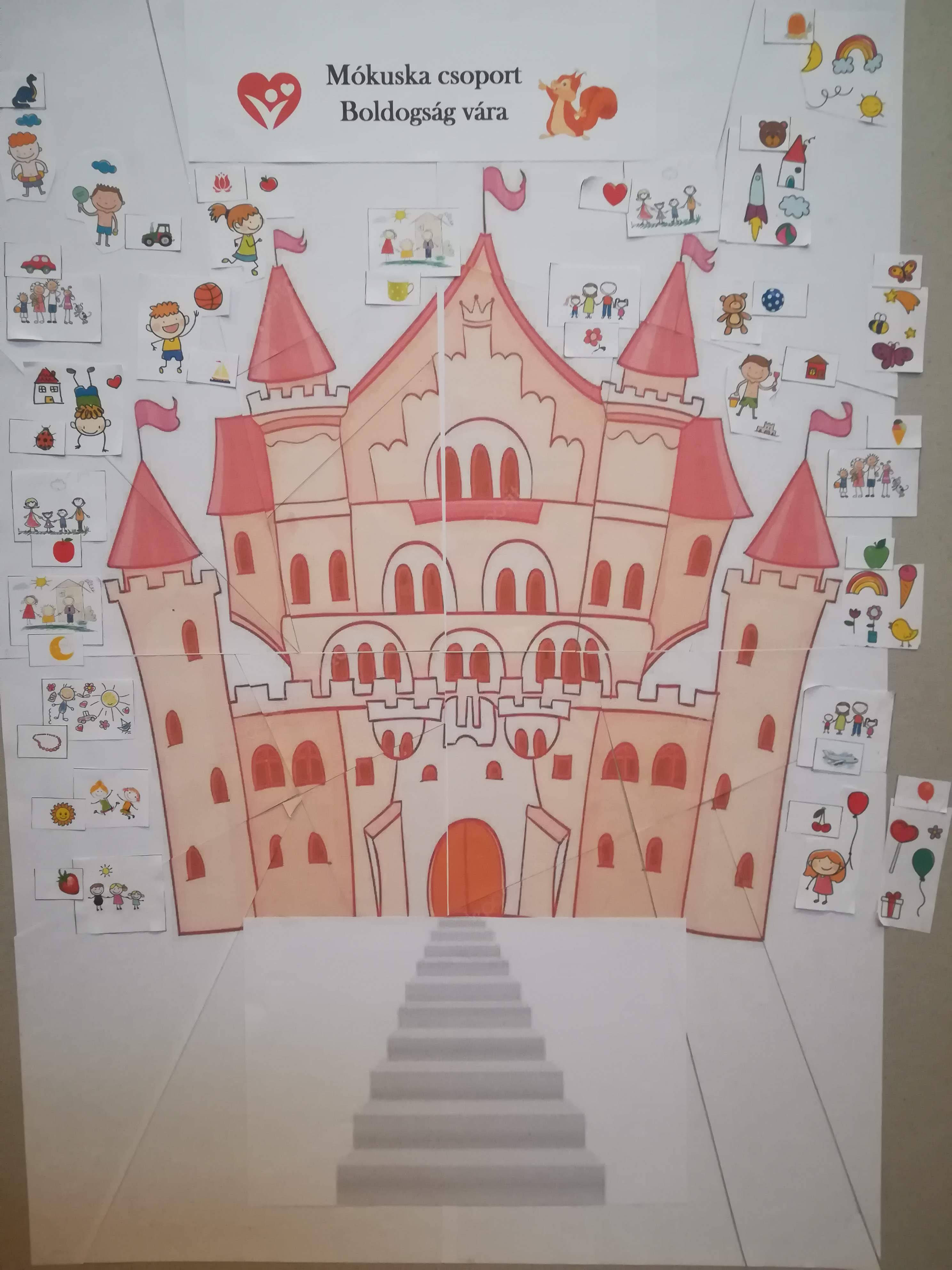 Ezek után következett a vár megépítése: Képzeljük el, hogy eljuthatunk egy Boldogságvárba, ahol mindig jól érezzük magunkat és boldogok vagyunk, de ez a vár magasan van, tíz lépcsőn át lehet feljutni. Együtt építjük fel ezt a csoda várat és együtt is juthatunk fel oda. Mivel a csoport nagyon szeret kirakózni, így óriás kirakó darabokból építettük meg a várat, mindenki hozzáadva egy részt, végül összeállt a Boldogság várunk. Majd megbeszéltük, kinek mi okoz boldogságot, mitől érzi magát boldognak és az ennek megfelelő kis képecskét a jelével együtt felragasztottuk a vár köré.