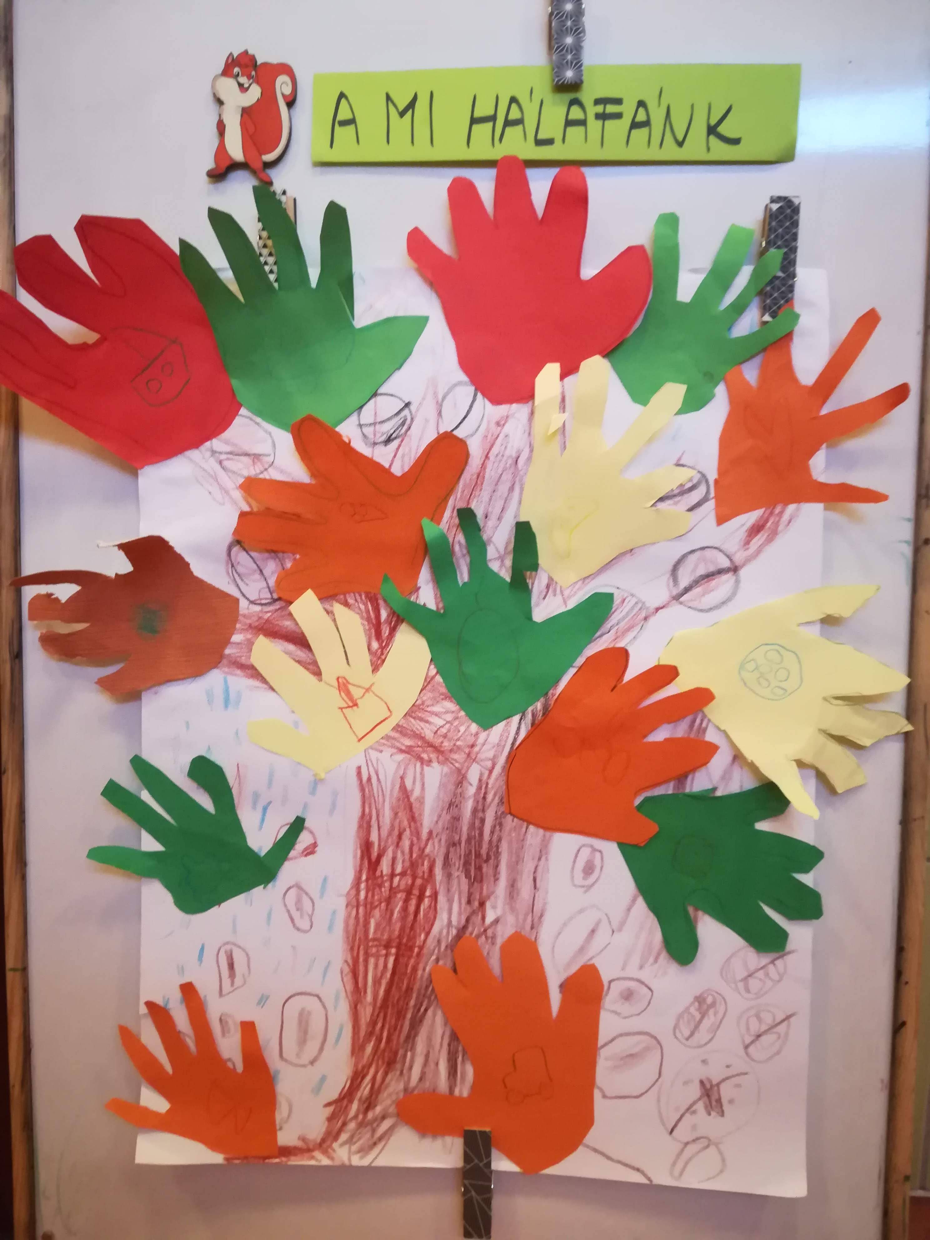 Végül elkészítettük a mi Hálafánkat, kis állatkákkal, akiknek hálás lehet a fa, és színes őszi levelekkel, melyek felragasztása közben a gyerekek elmondták, kinek és miért hálásak.