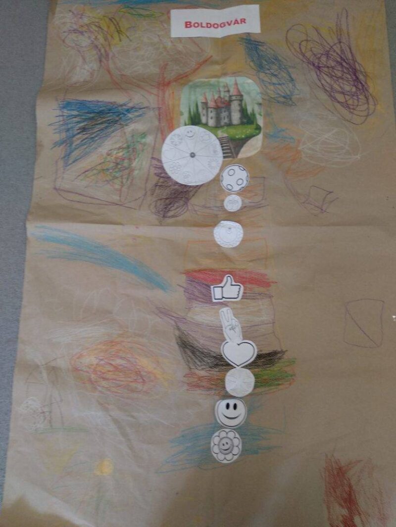 Elővettük a különböző témákhoz kapcsolt foglalkozásokon készült képeket és felidéztük a közös emlékeinket. Az első alkalommal készített vár rajzon újra átéltük a lépcsőfokokat, megbeszéltük a jeleket, azt, hogy kinek mi volt a kedvenc része, élménye az adott témában. Csatakiáltással köszöntöttük a Boldogság vár kapujába érkezésünket!
