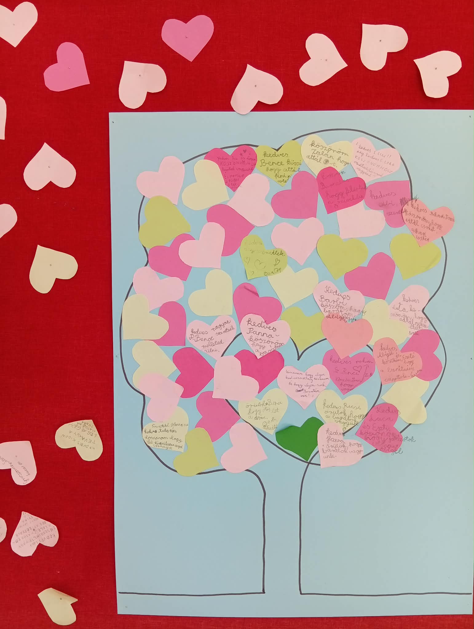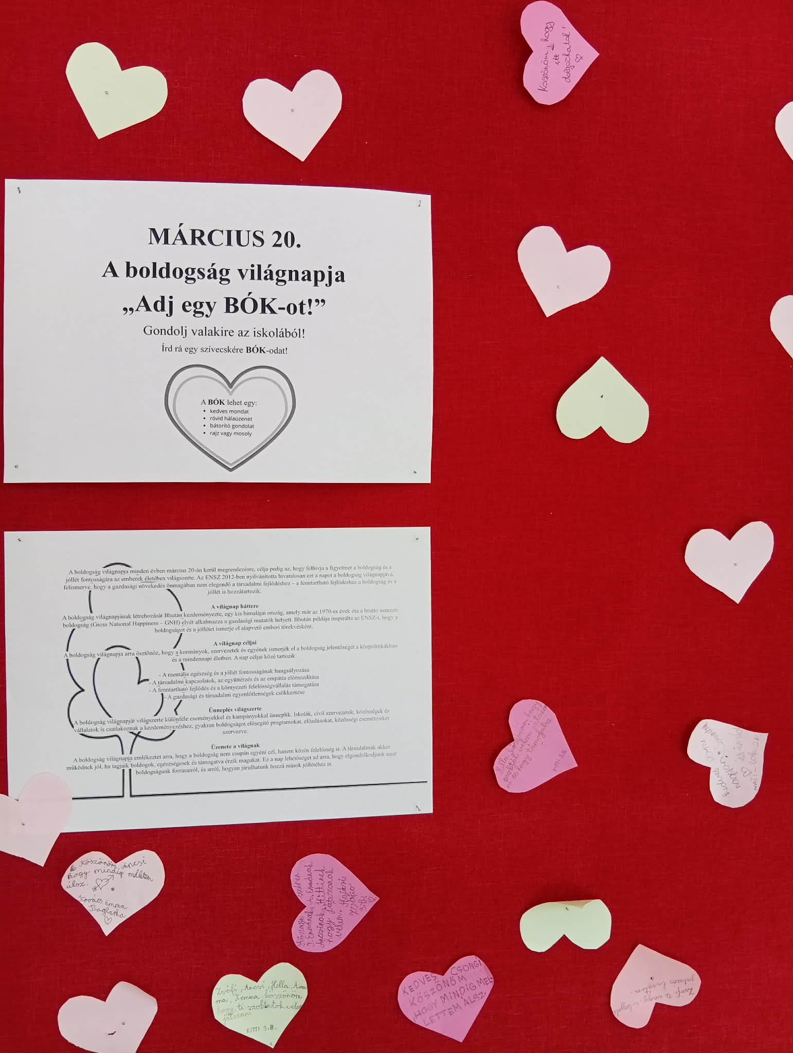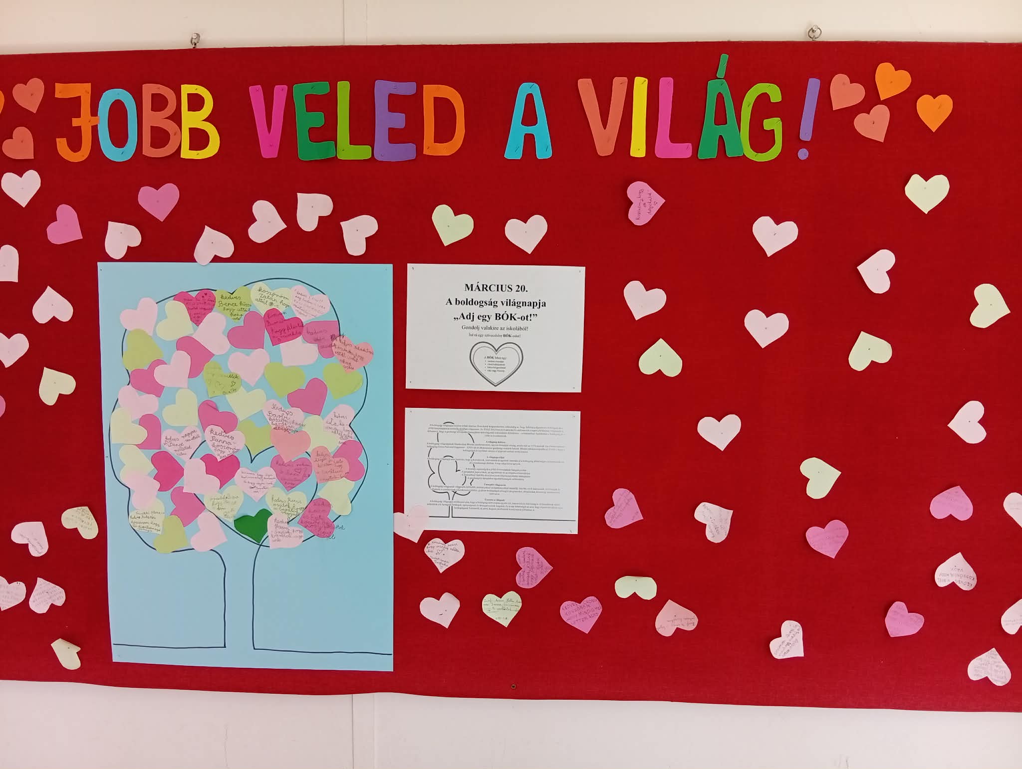 A Boldogság világnapja alkalmából iskolánk aulájában megjelentettem egy rövid leírást erről a napról: jelentősége, eredete, célja. A fa szív formájú leveleire bárki írhatott egy kedves üzenetet társainak, tanárainak, az iskola dolgozóinak.