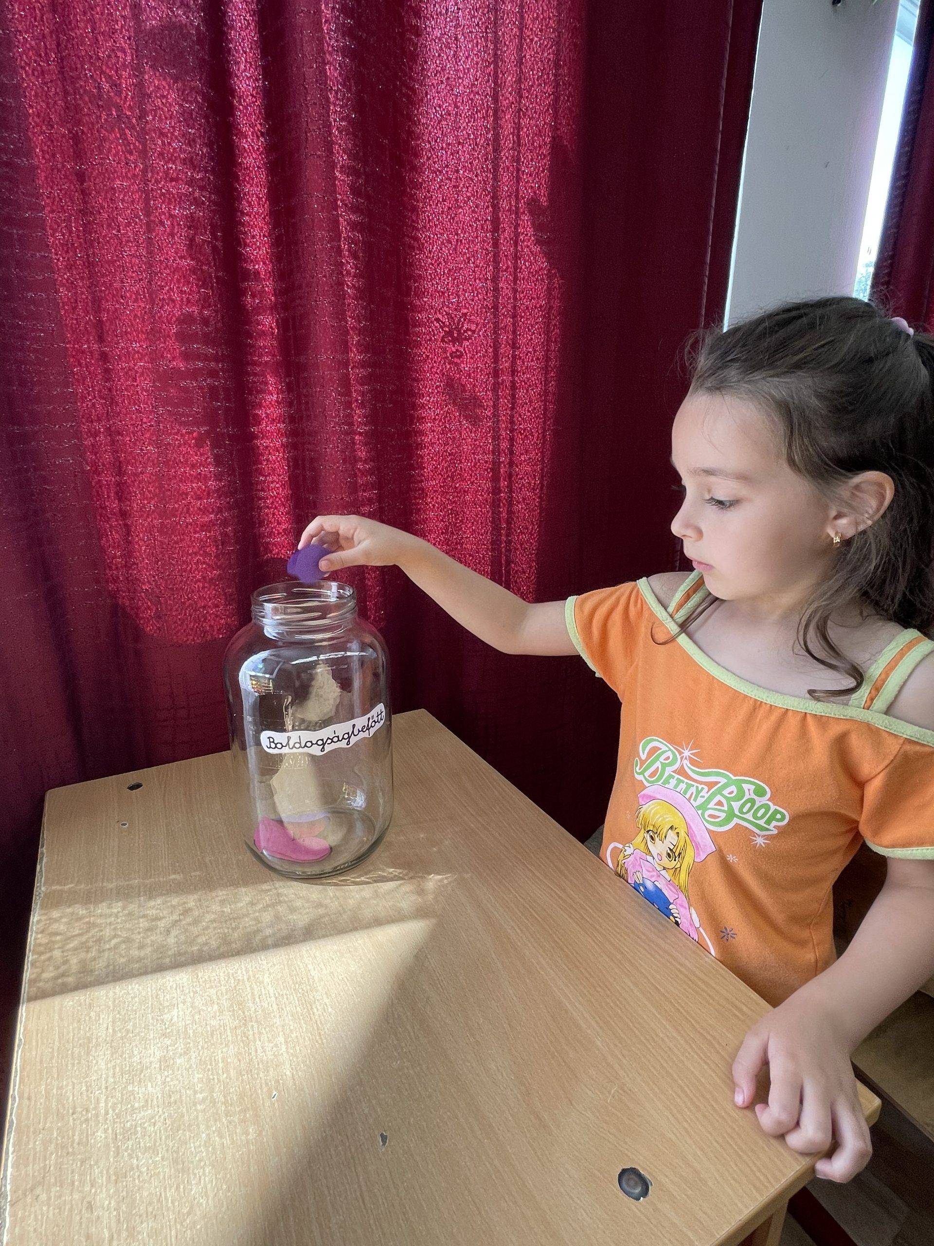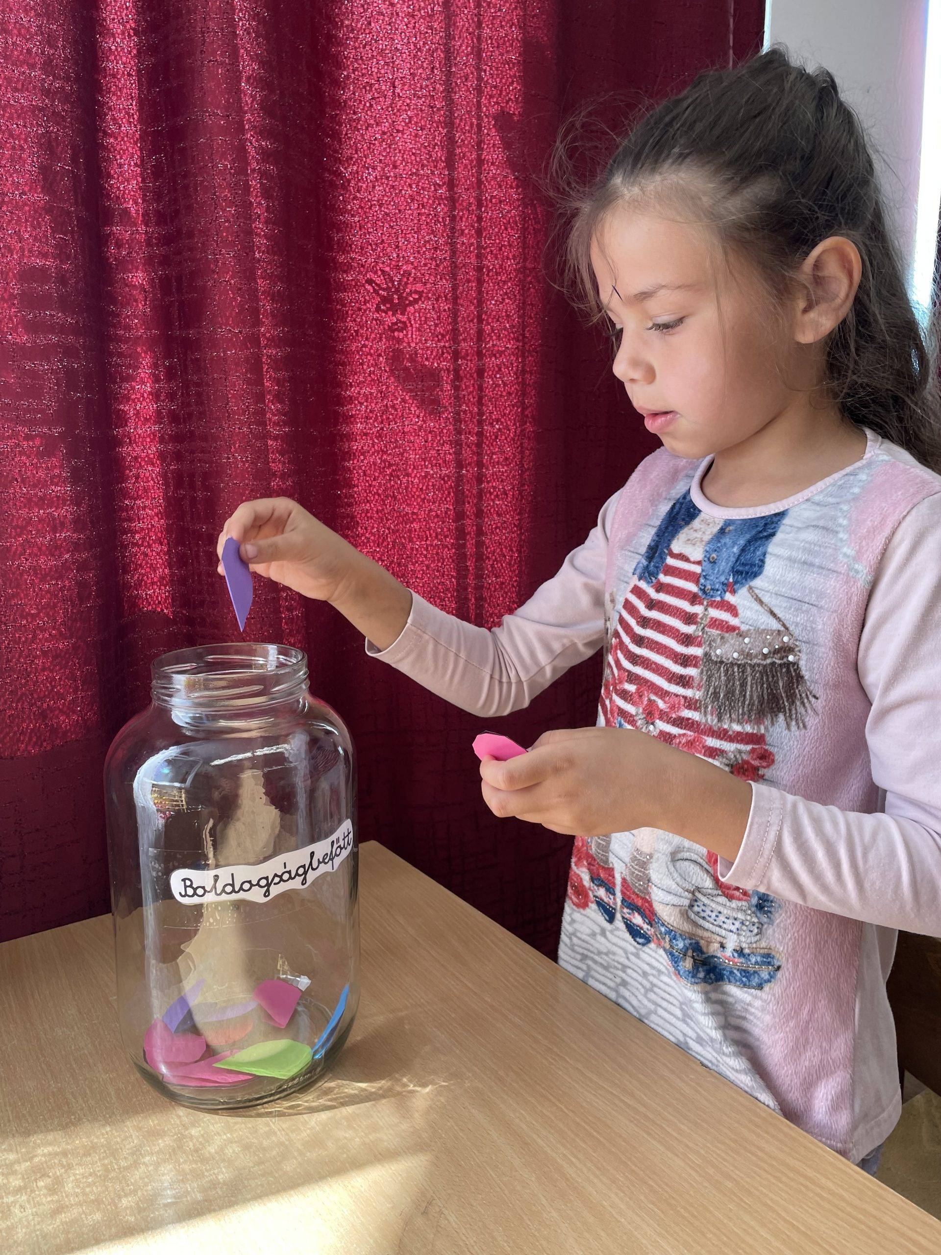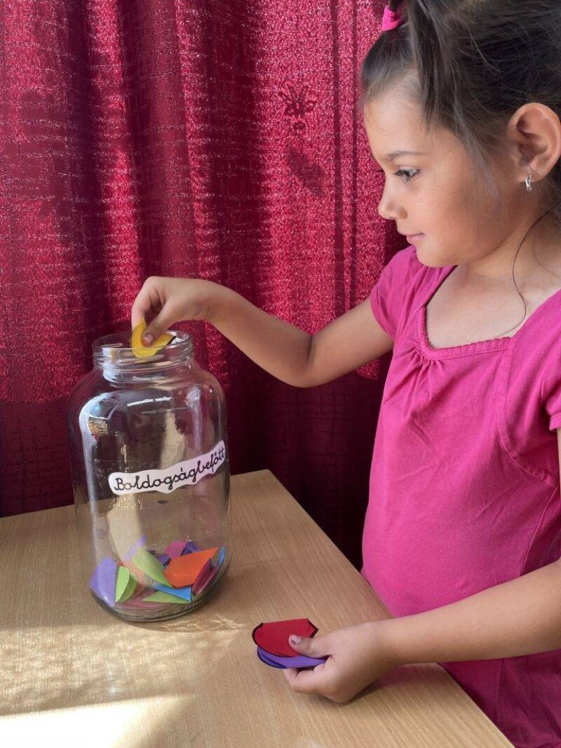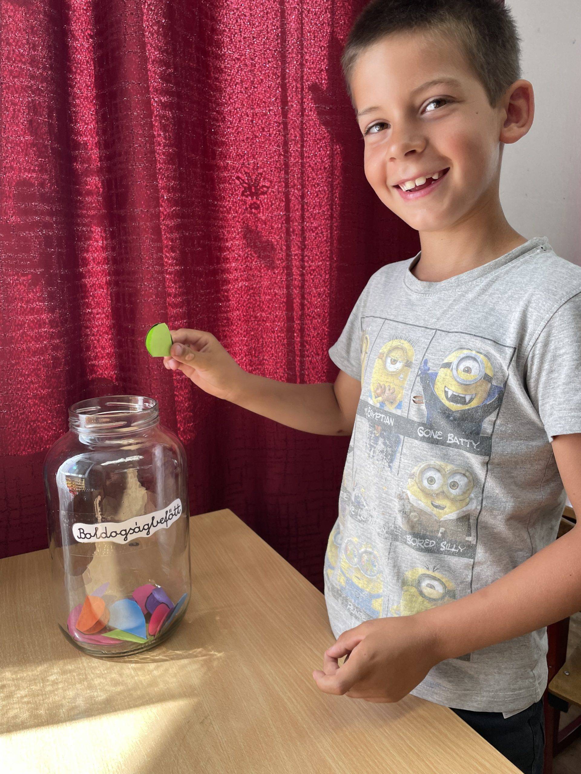 Az első osztályos tanulók színes papír szíveket vágdostak ki, amelyre felírták a tanév legkedvesebb, legjobb, illetve számukra legboldogabb pillanatait, majd ketté hajtották és bedobták a boldogságbefőttbe. Külön kérésük volt, hogy a következő tanèvben megnézhessék, hogy miket írtak fel a szívecskékre.