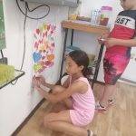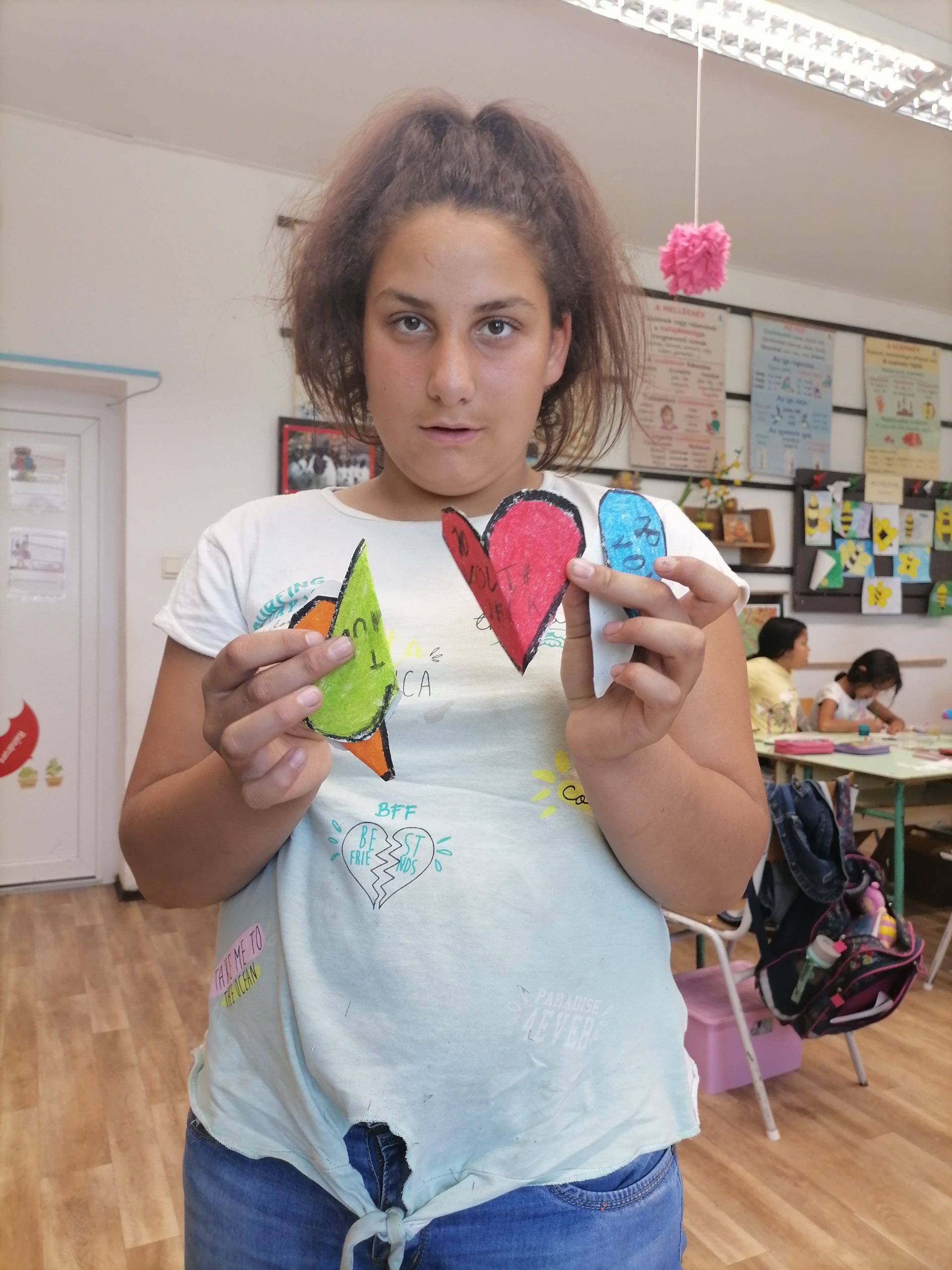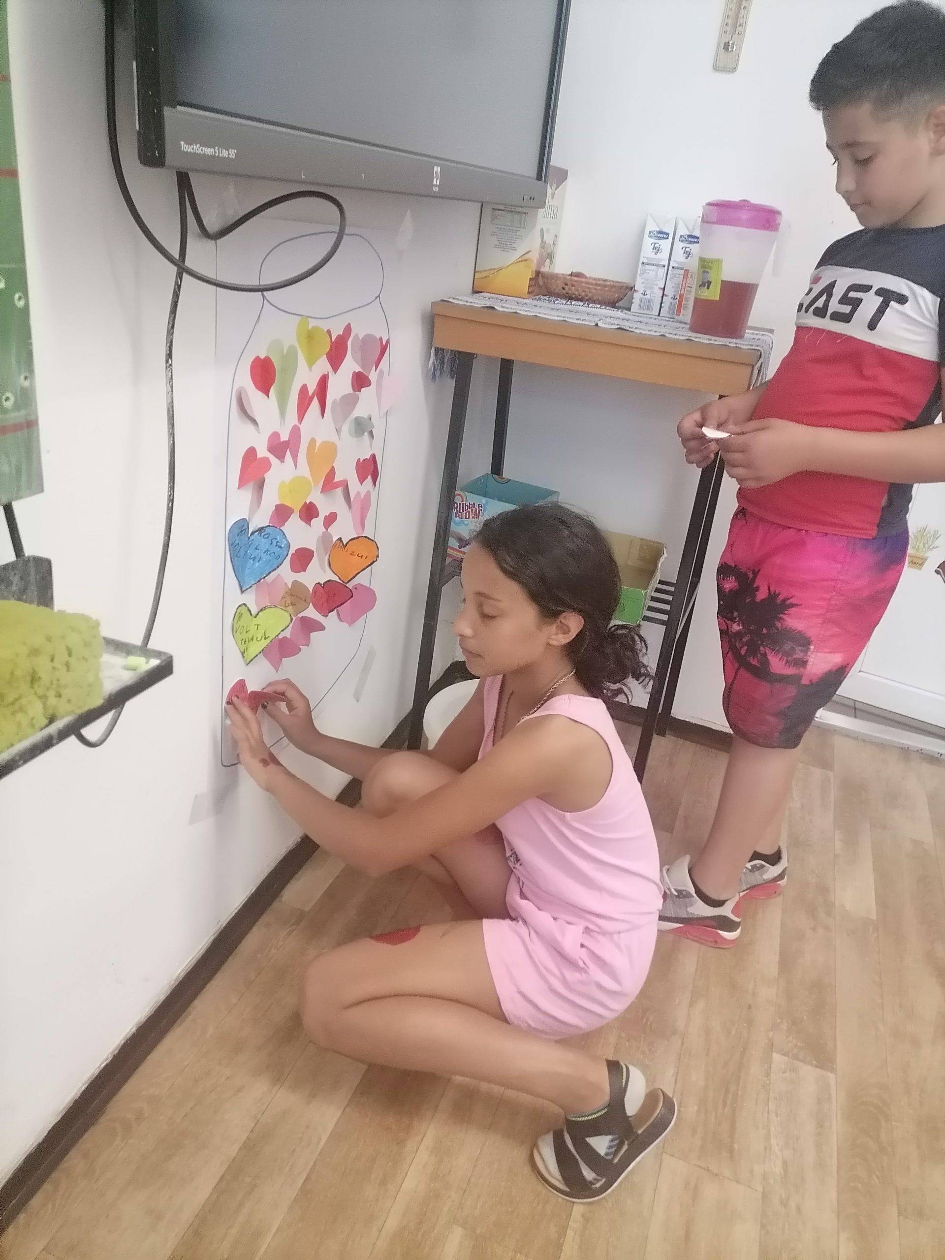 A gyerekek apró szívecskékre írták fel a számukra örömet okozó történéseket a tanévben. Folyamatosan „töltötték” az üveget a háláikkal.