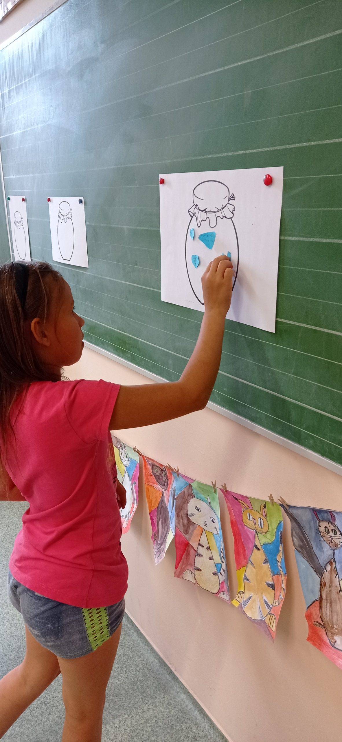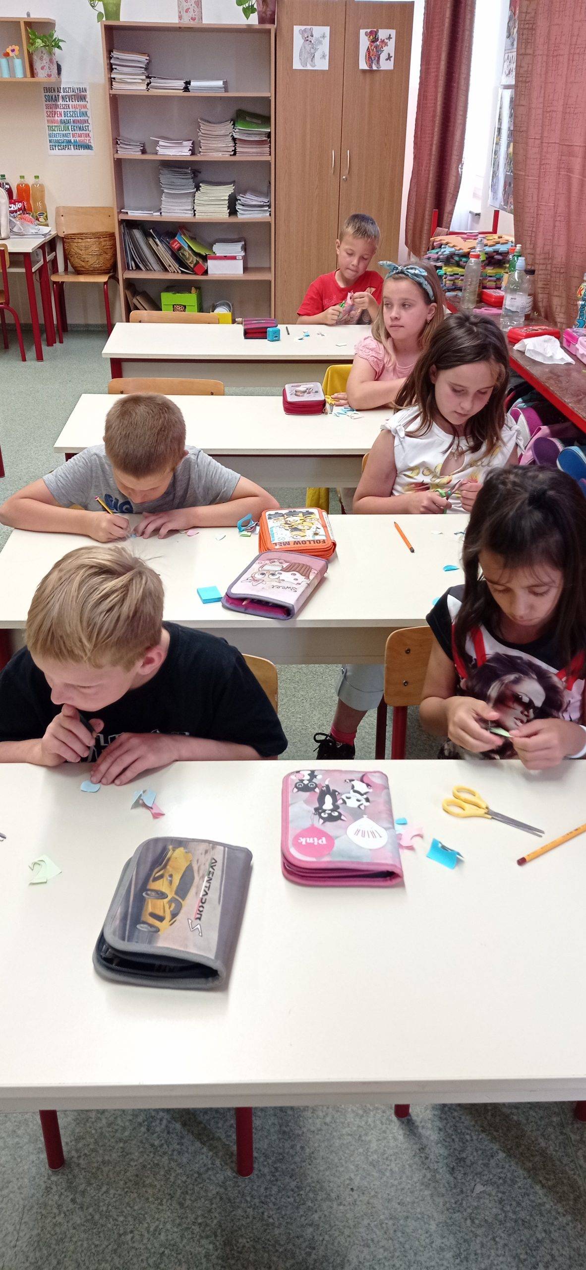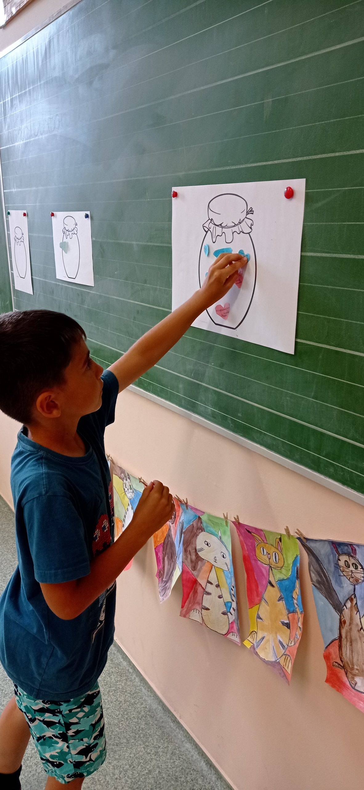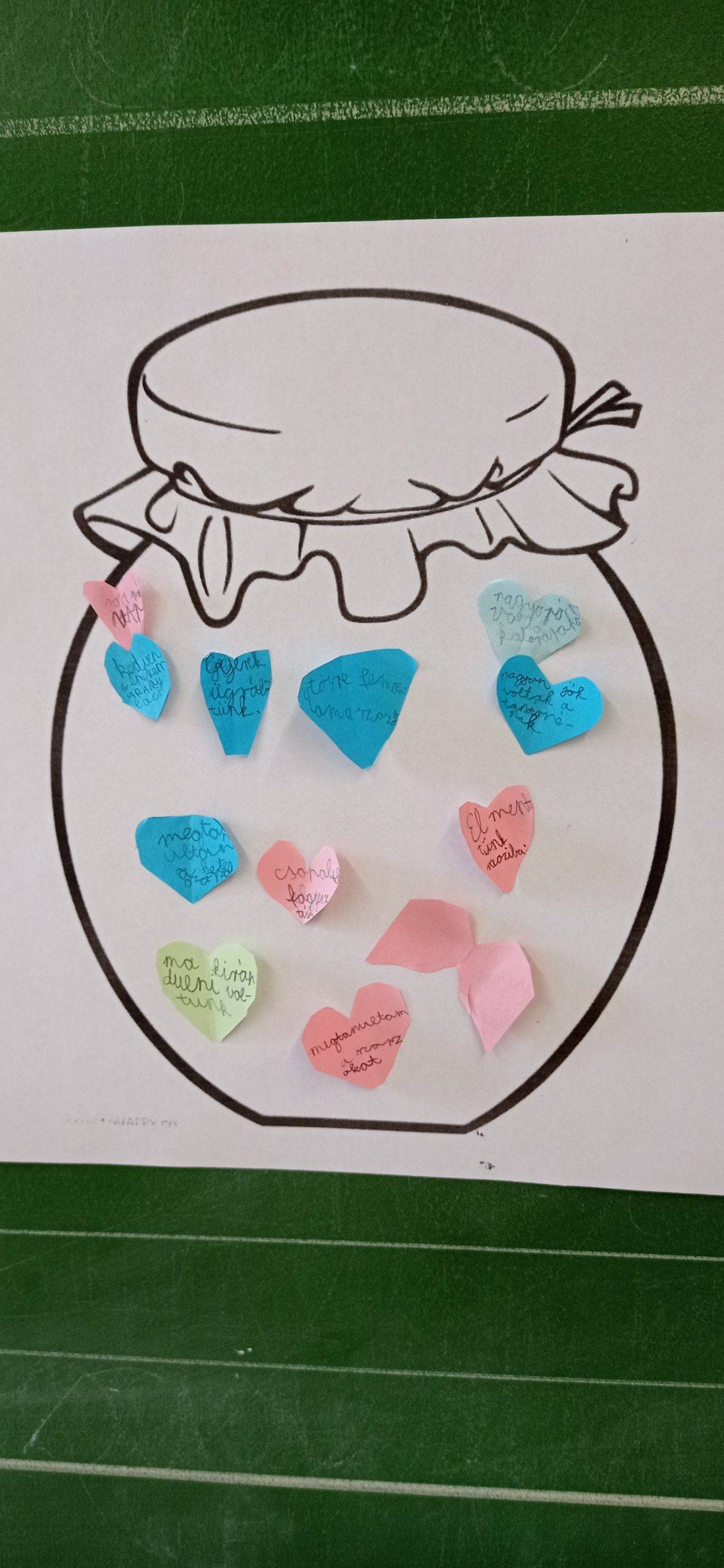 Röviden átbeszéltük a tanévben történteket, s mindenki elmondta mi volt a legjobb, legkedvesebb számára az évben. Szívekre felírták gondolataikat, melyeket egy rajzolt befőttes üvegre felragasztottak.
