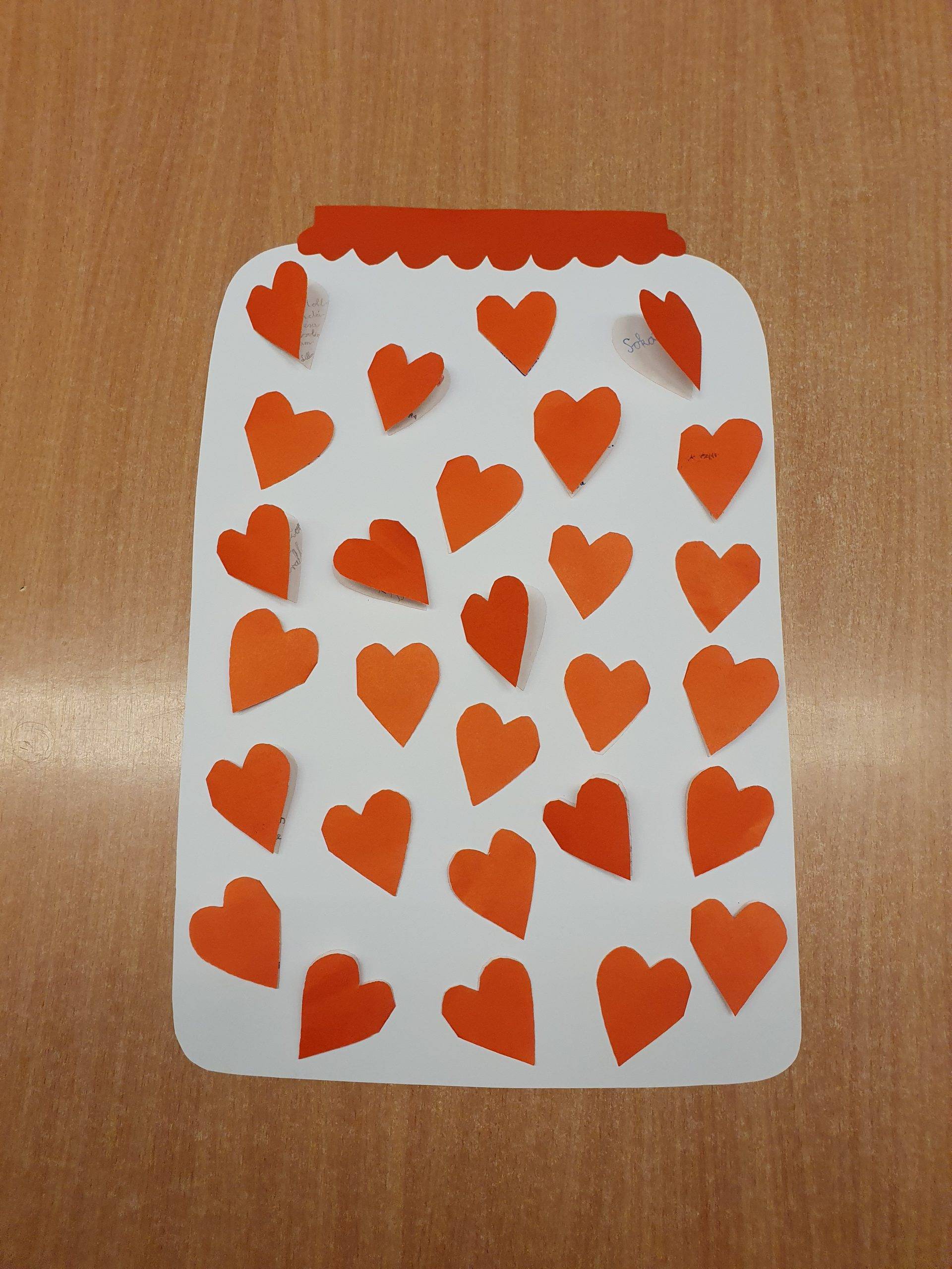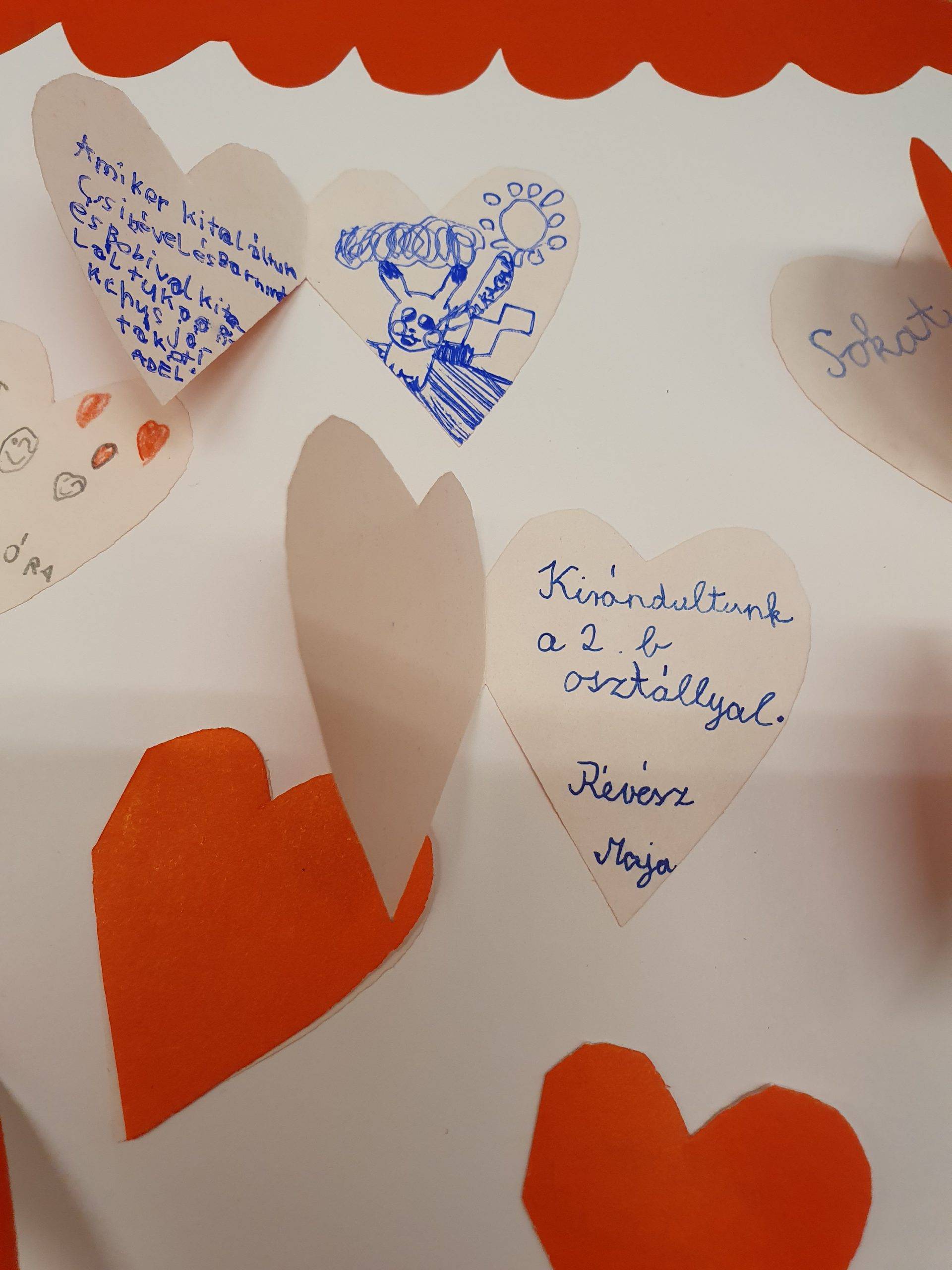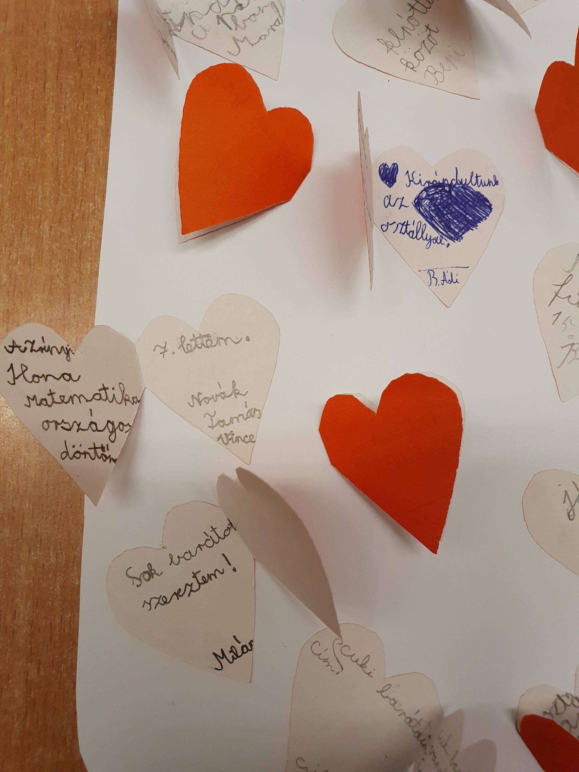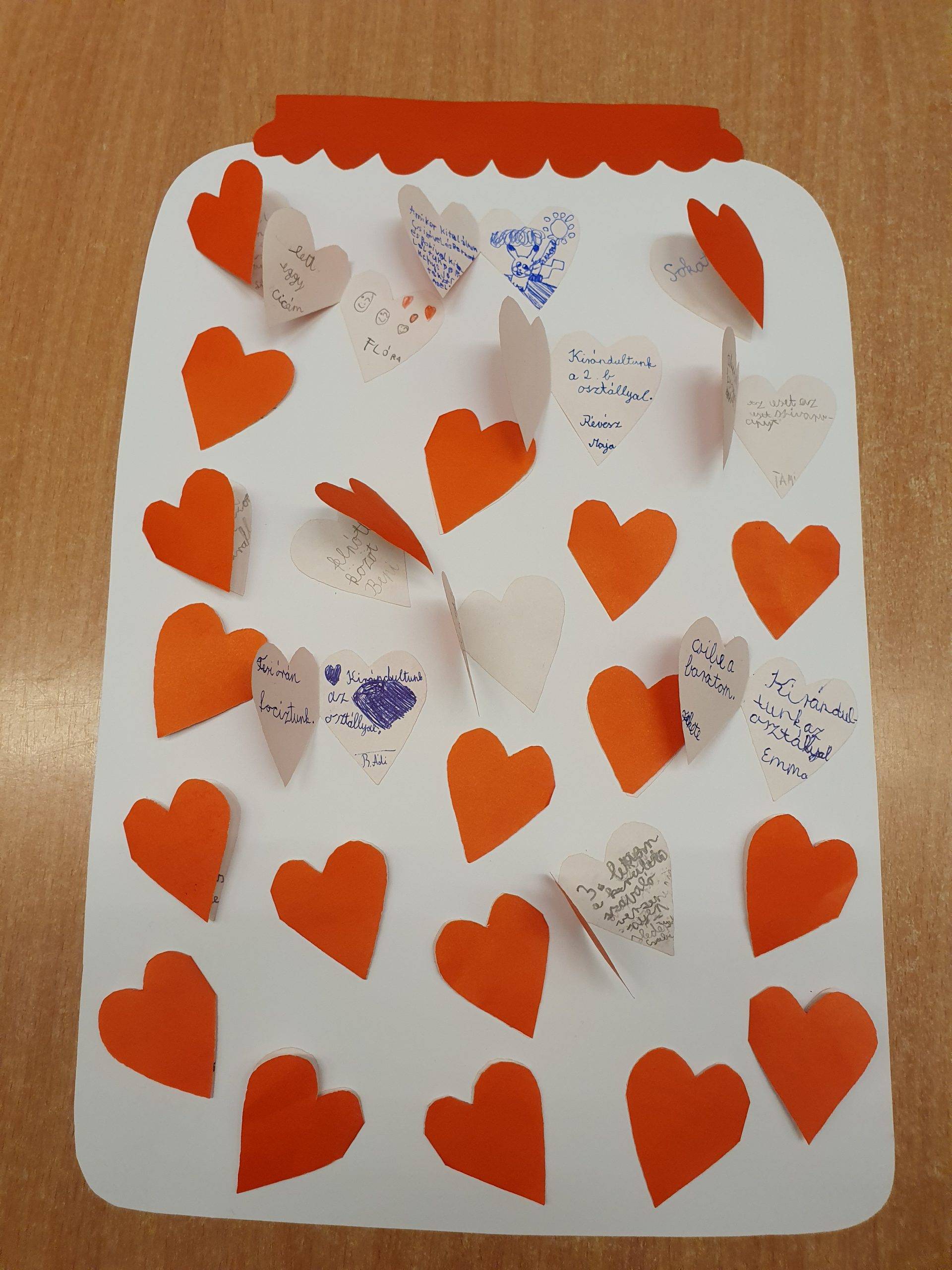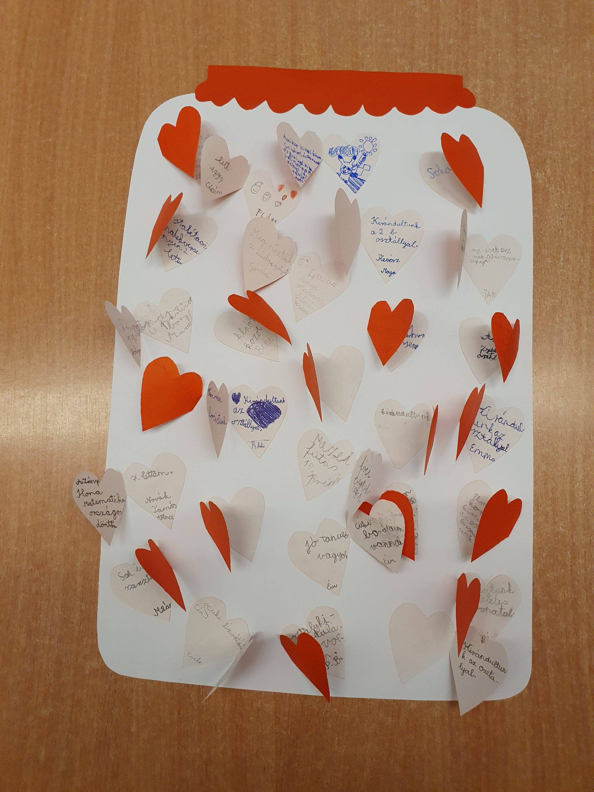 A tanév utolsó hónapjában elkészítettük boldogságbefőttünket. Az osztály minden tanulója beleírta egy-egy szívecskébe, azt, ami a tanév során neki a legkedvesebb élménye volt, ami a legnagyobb örömöt jelentette számára. Nagyon változatosak és érdekesek voltak a bejegyzések. Megbeszéltük, hogy a nyáron is próbálunk vidámak, önfeledtek, boldogok lenni és másoknak örömet szerezni.