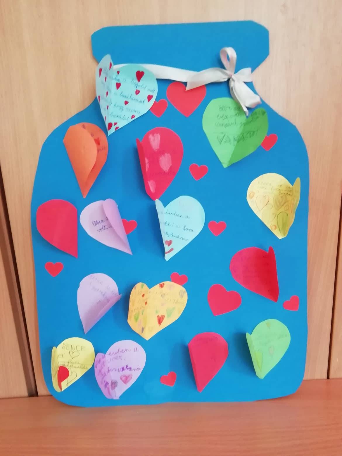 Mi egész évben főztünk. Igyekeztünk minden hónapban, egy kis boldogságot főzni. Főztünk hálát, célokat, megbocsátást, apró kis örömöket és ezeket mind felidéztük az év utolsó boldogság óráján. Majd mindenki keresete a gondolataiban, hogy melyik „befőtt” volt neki az év folyamán a legfinomabb. Készítettem egy jó nagy befőttesüveget kartonból, erre aztán mindenki felragasztotta a kis szívecskéjét, amire ráírták, hogy mi is volt a legjobb, leghálásabb pillanat a tanévben.