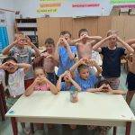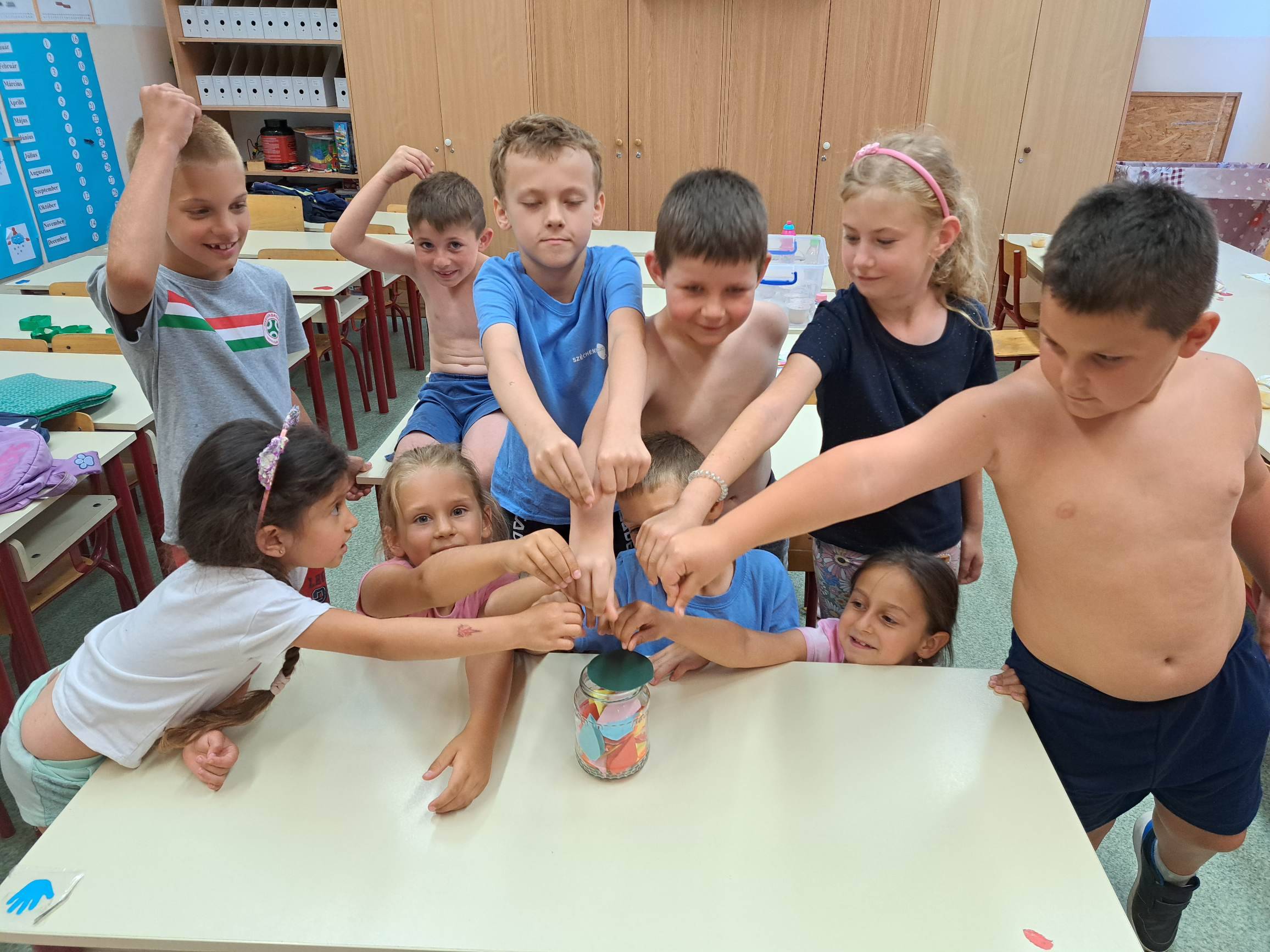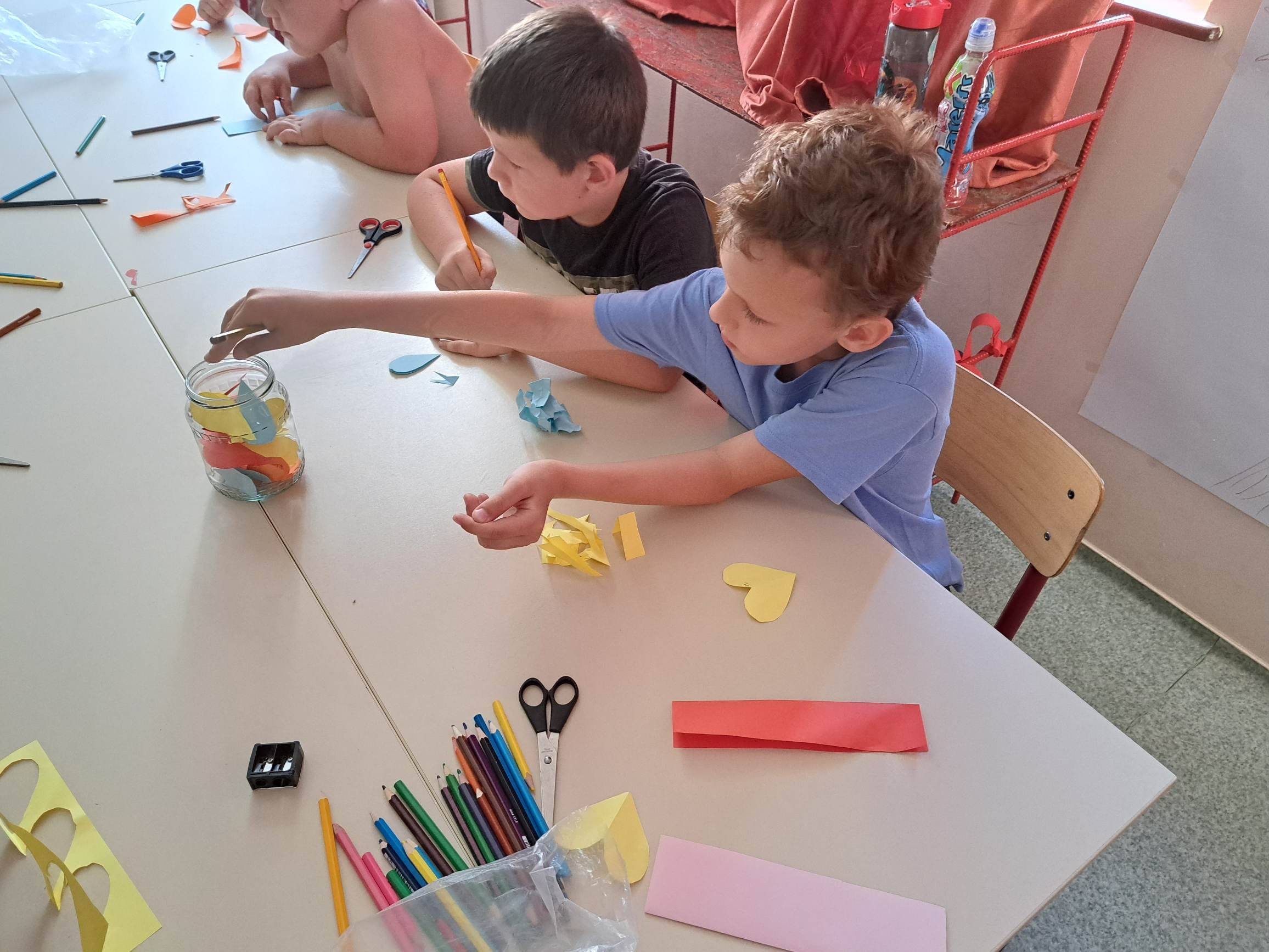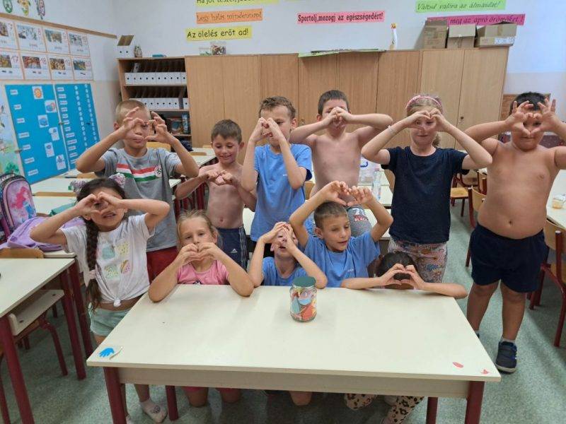 Visszaemlékeztünk az elmúlt hónapokra, felelevenítettük a témákat és hogy mennyi kellemes emlékünk van. Összehajtott színespapírból szétnyitható szíveket készítettek a gyerekek. Felidzés után ami neki az eszébe jutott le kellett írni egy szivecskére és beledobni befőttesüvegbe. A befőttünket egy csipet szeretettel tartósítóttuk.
