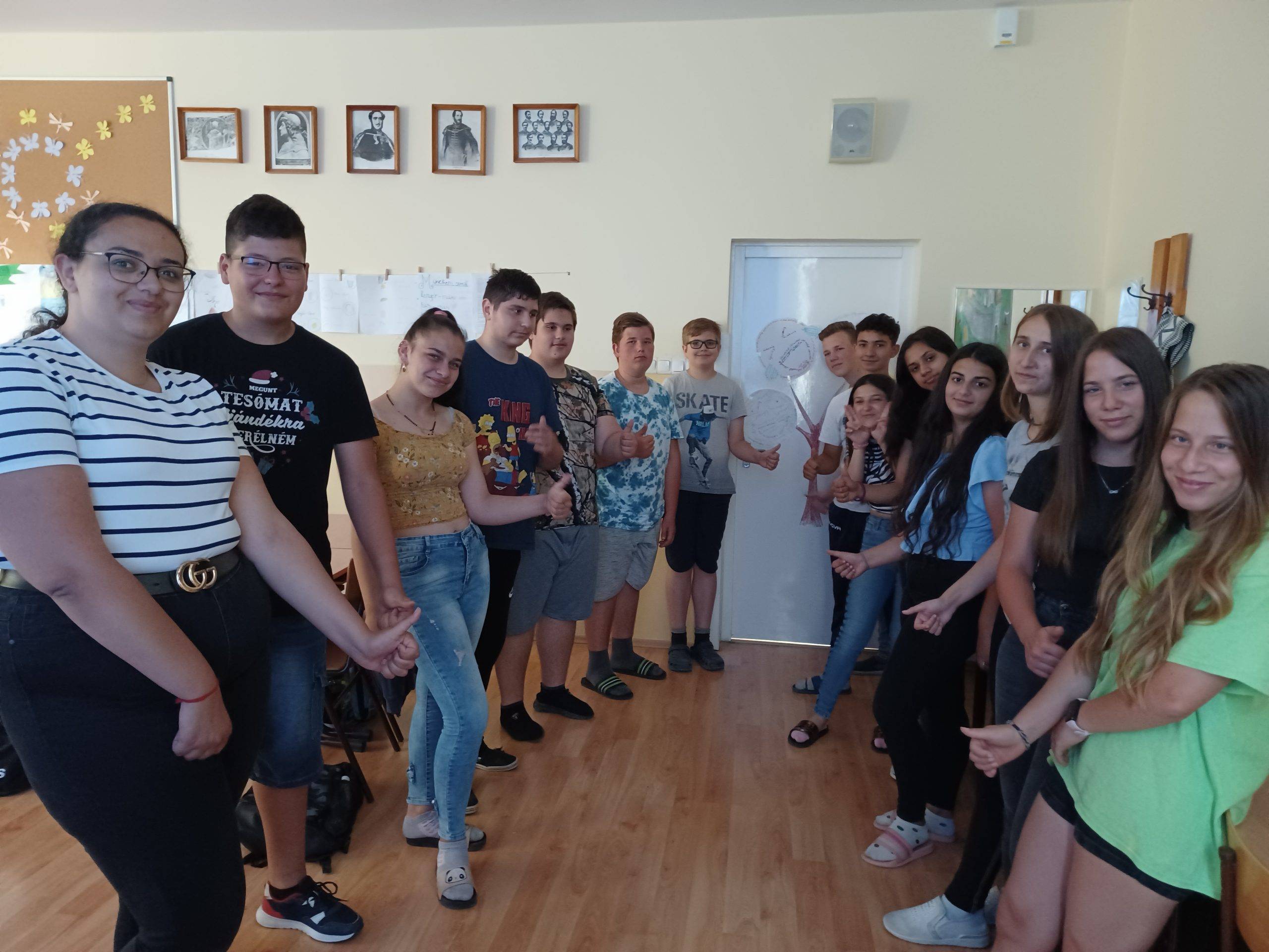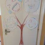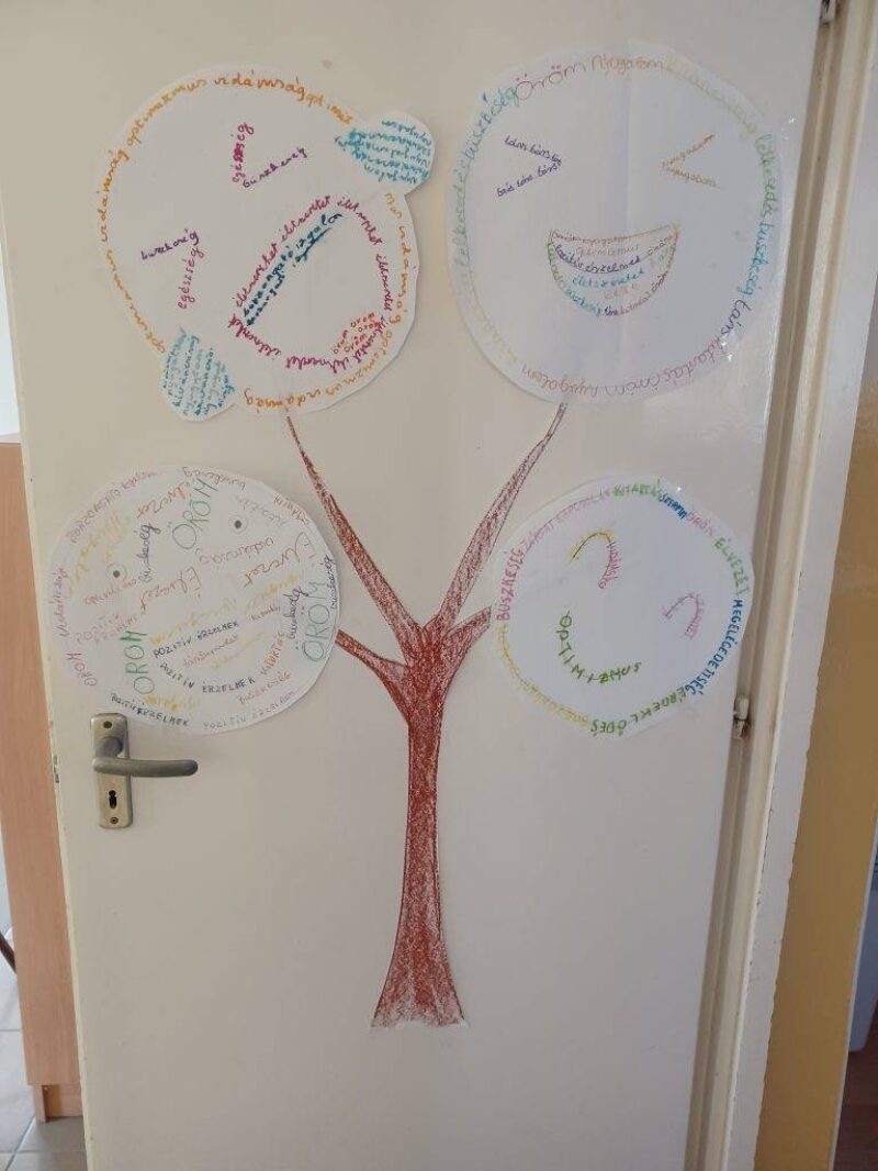 A nyolcadik év végén a legszebb együtt megélt pillanatainkat, emlékeinket idéztük fel. Egy-egy szóval jellemeztük ezeket, majd szófelhő-SMILE-kat alkottunk, amivel a fatörzset díszítettük.