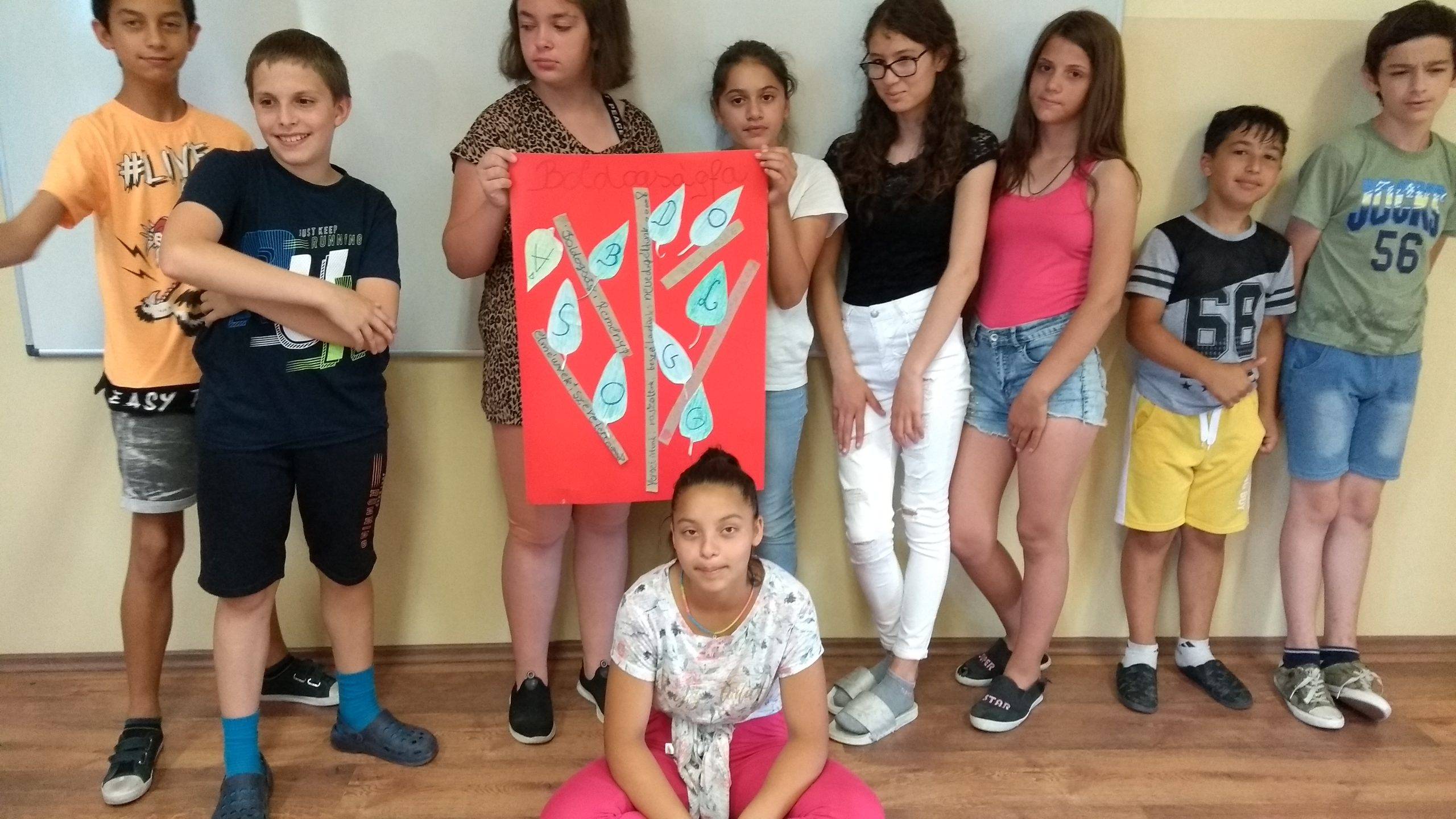 Boldogságfát készítettünk: ágai mutatják, mi tette az osztályt boldoggá, a leveleiből a BOLDOGSÁG szó összeolvasható.