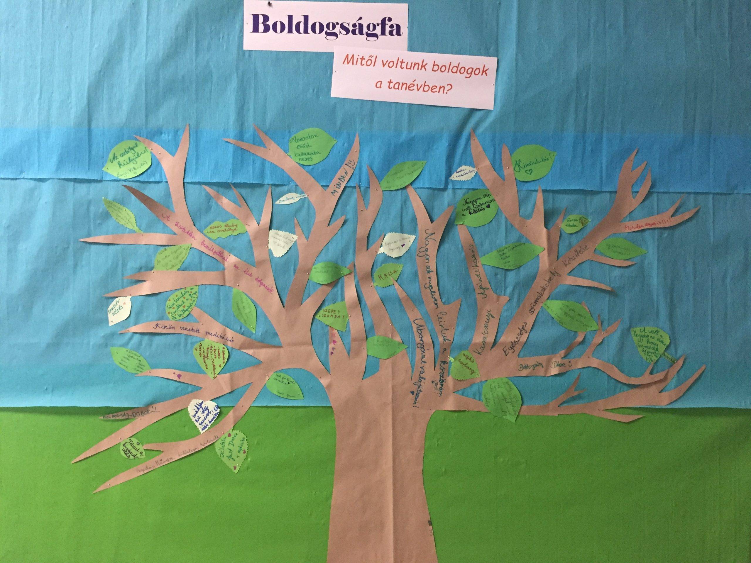 A csomagolópapírból készült boldogságfa ágaira a szakkörösök írtak olyan pozitív élményeket, amelyeket a Boldogságórákon éltek meg. Még korábbi évek feladatai is felelevenedtek. A boldogságfa felkerült az iskola faliújságjára. Az iskola diákjai, dolgozói a levelekre írhattak olyan iskolai élményt vagy eseményt, amely boldogságot okozott számukra a tanévben. Sok, különleges közös élmény került elő a boldogságfának köszönhetően. Csak néhányat emelek ki: a Csobánc megmászása, farsang, tanár-diák foci, kirándulás Szlovákiába, látogatás a reptéren, barátságok szövődése, jó jegyek, közös bulik. Sok szép emlék ebből a tanévből. Jó volt együtt lenni, együtt megélni szép, felejthetetlen pillanatokat.