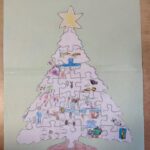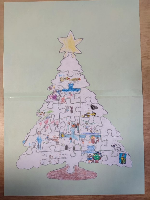 (Minden gyerek kap egy darabot a fenyőfából, ha elkészültek a rajzok felragasztják a megfelelő helyre.)