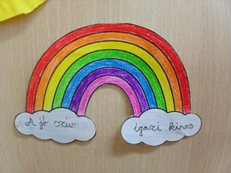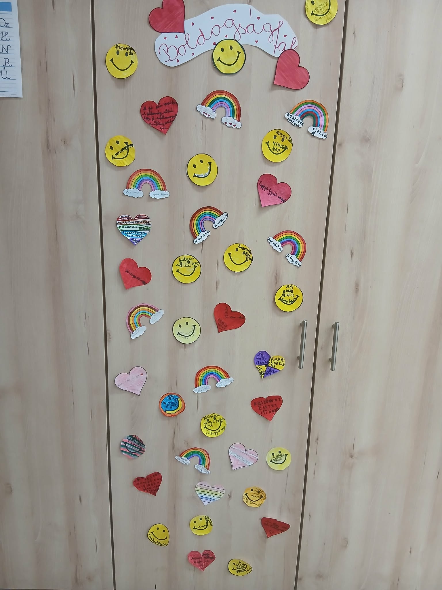 Havi boldogságóránkon a Boldogság világnapja alkalmából Boldogságfalat készítettünk. Szív- szivárvány és smile képekre írtak boldogságüzeneteket a tanulók, amelyeket boldogságfalra helyeztünk.