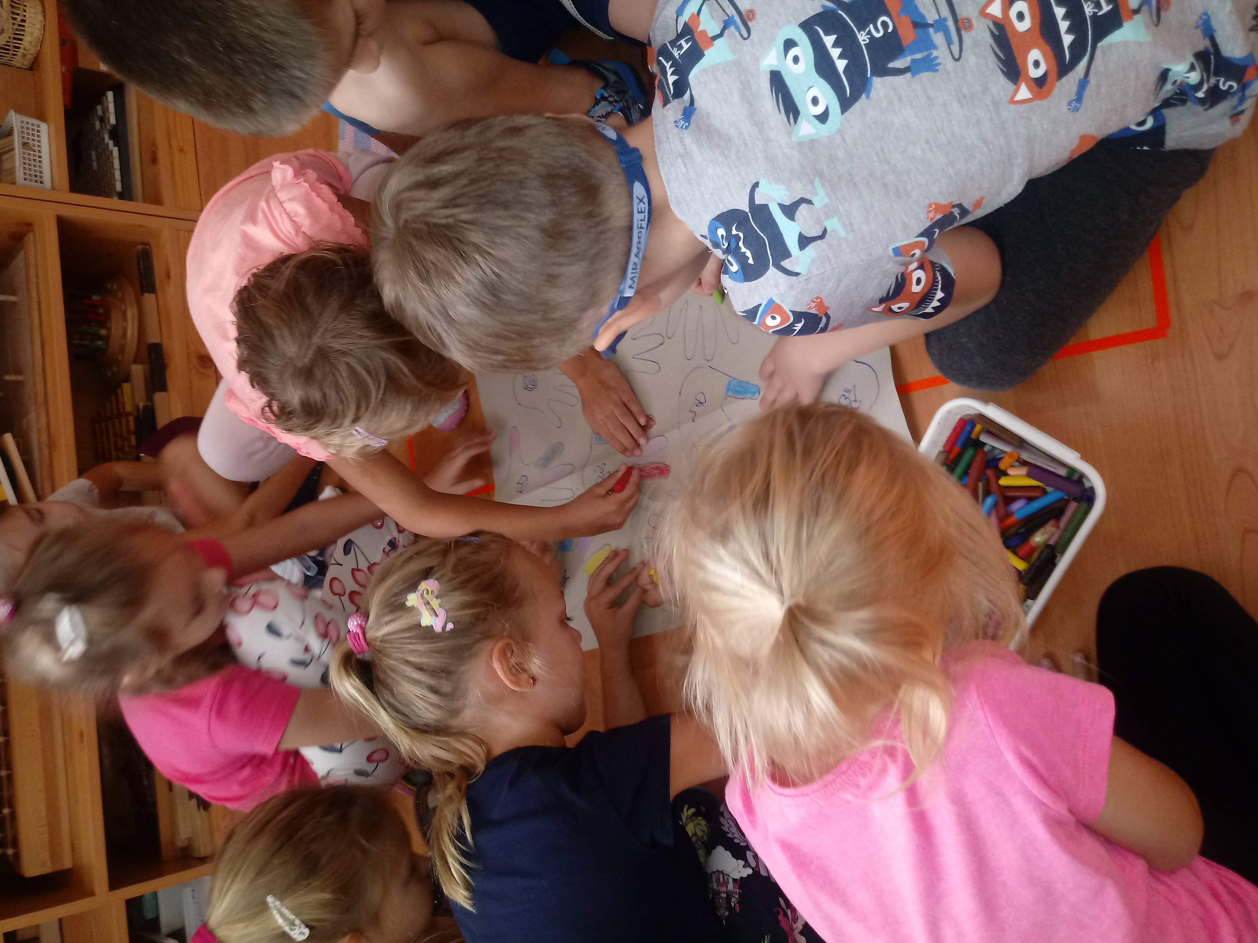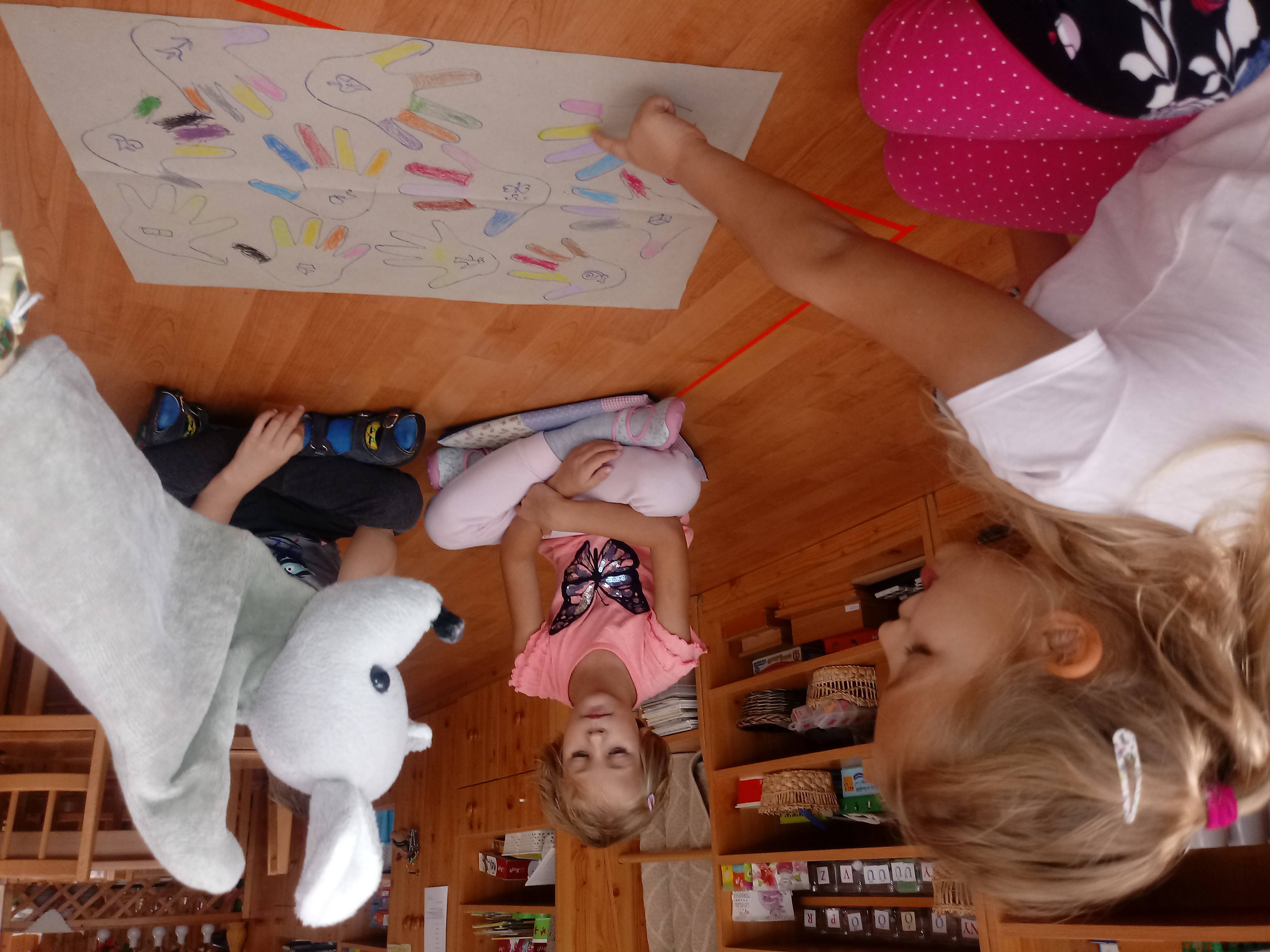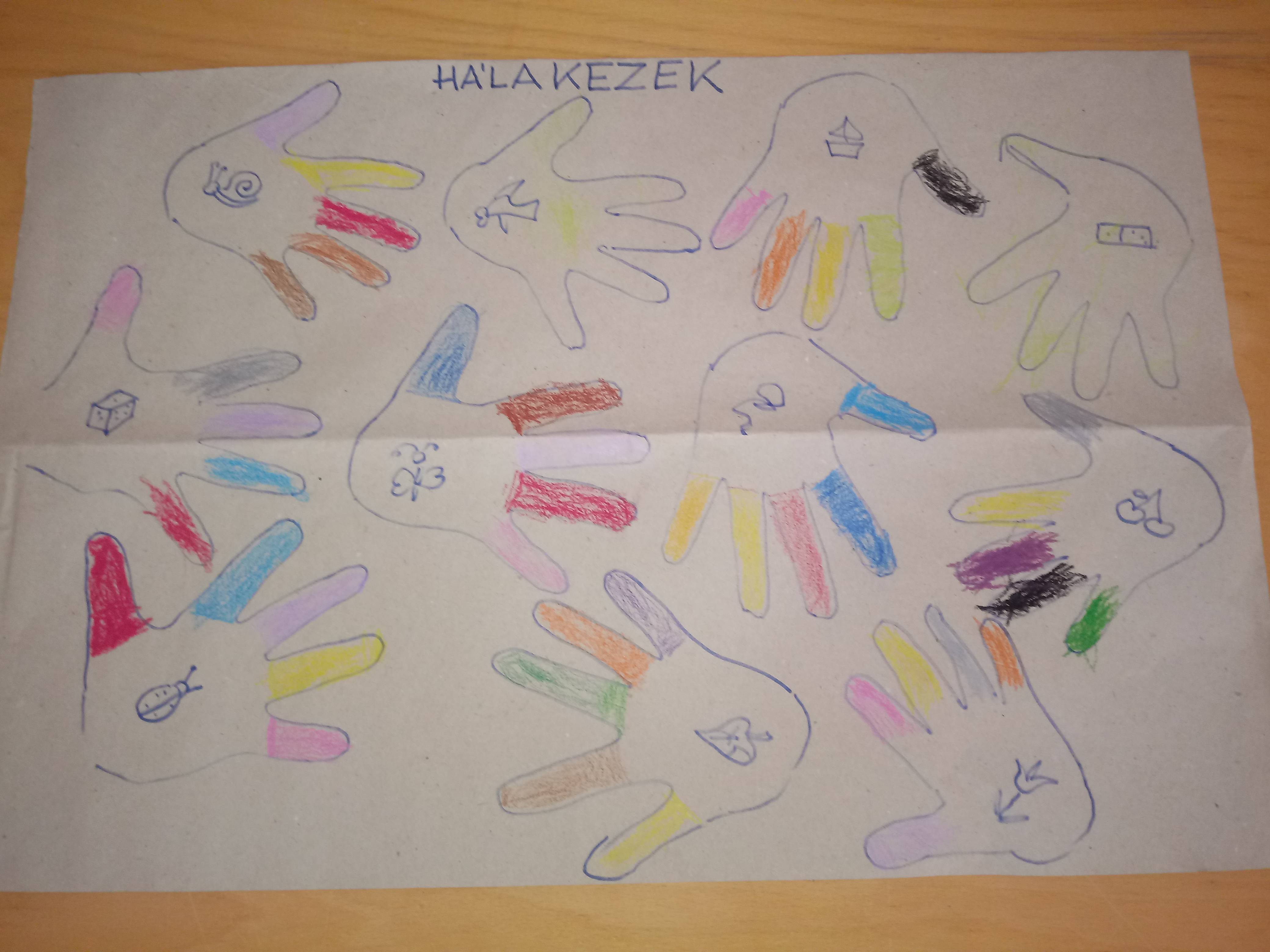 Szeptember hónapban a hála gyakorlásával kezdtük a boldogságórákat. Megbeszéltük a hála fogalmát és a gyerekek megfogalmazták saját érzéseiket ezzel kapcsolatban.Segítségünkre. sietett Cincin Egérke a bábfigura, aki szintén elmesélte, hogy kinek hálás és miért.A gyerekek nagy örömmel kapcsolódtak be a beszélgetésbe.Ezután mindenkinek körberajzoltuk a kezét majd kiszinezhették az ujjaikat különböző színűre.Közben elmondhatták, melyik ujjacska milyen hálát jelent számukra.A Hálakezekből egy közös plakátot készítettünk.Nagyon jó hangulatban telt el az idei első boldogságóra.